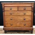A Victorian walnut chest of one long blind, two short above three long graduated drawers, turned and scumbled mother of pearl inlaid handles, plinth to base, turned feet, 146cm high, 141cm wide, 52cm depth, c.1870, possibly Scottish