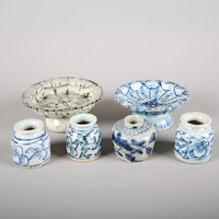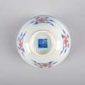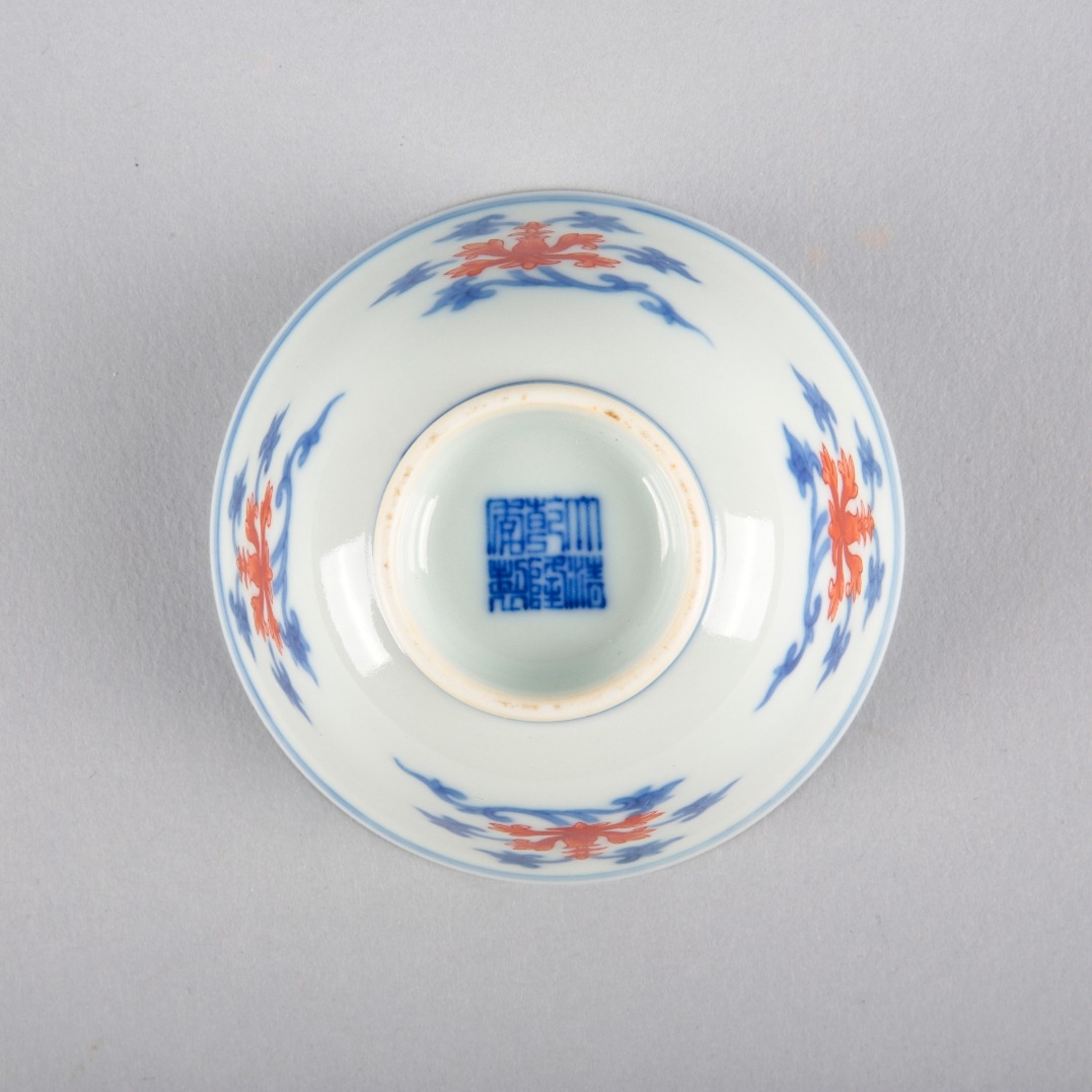 bearing a six character Qianlong mark to the base but likely Daoguang, with an everted rim and raised foot, decorated with four iron red lotus flowers and underglaze blue leaves and stems, 4.5cm high x 8.5cm diameter
