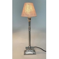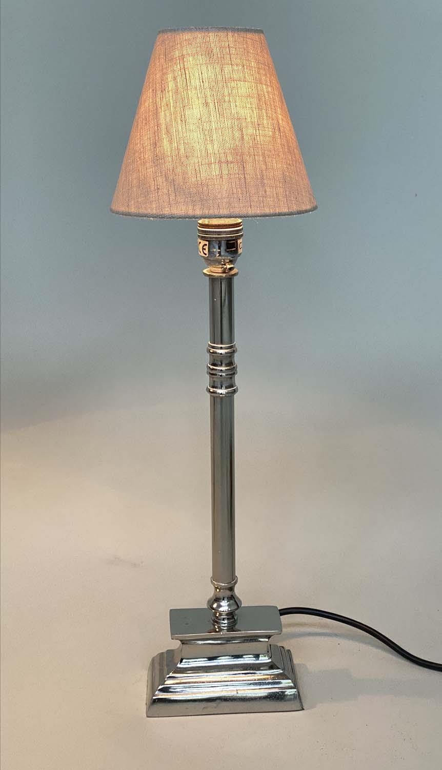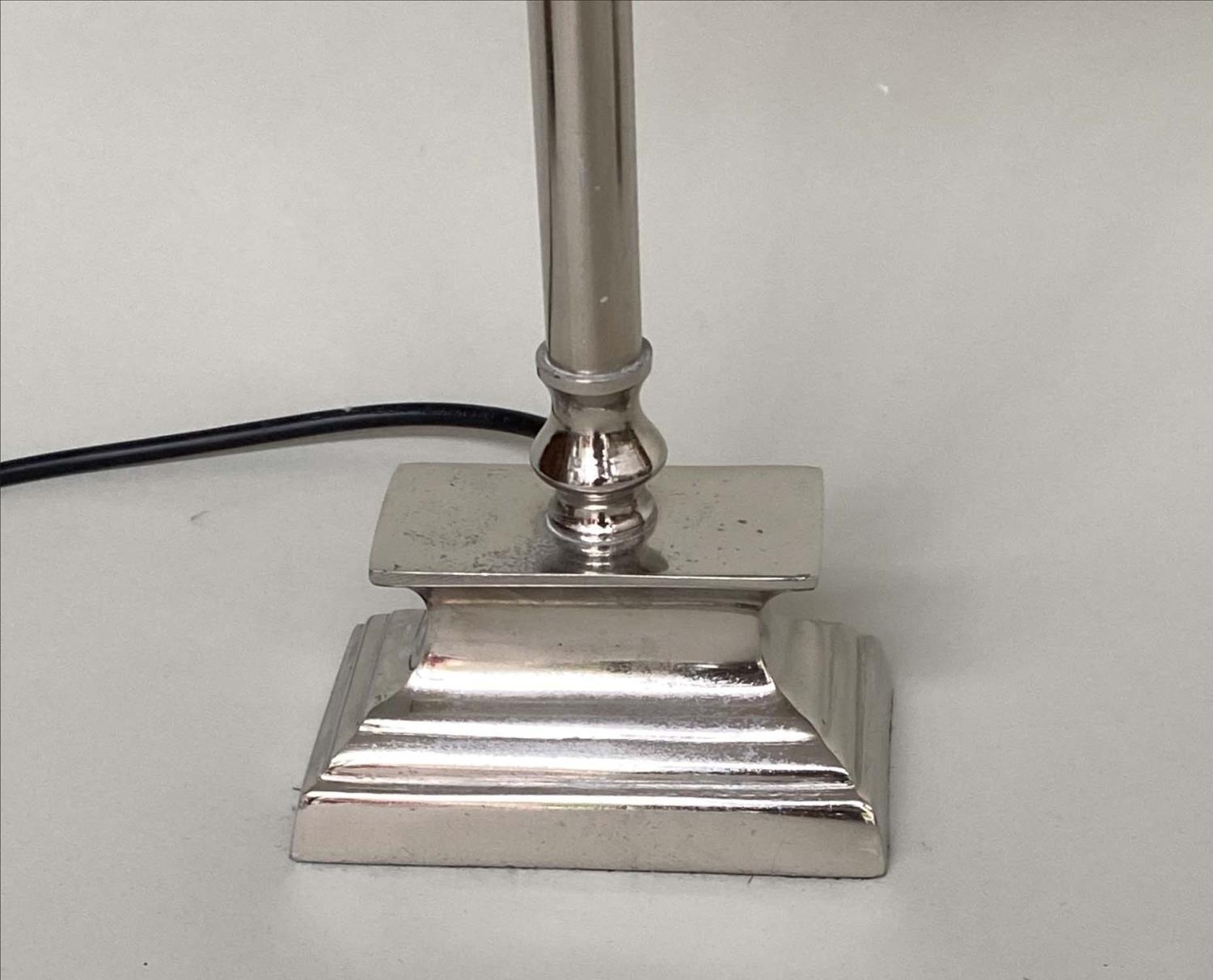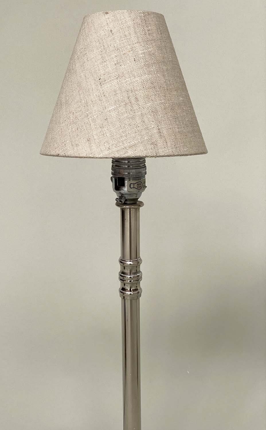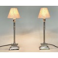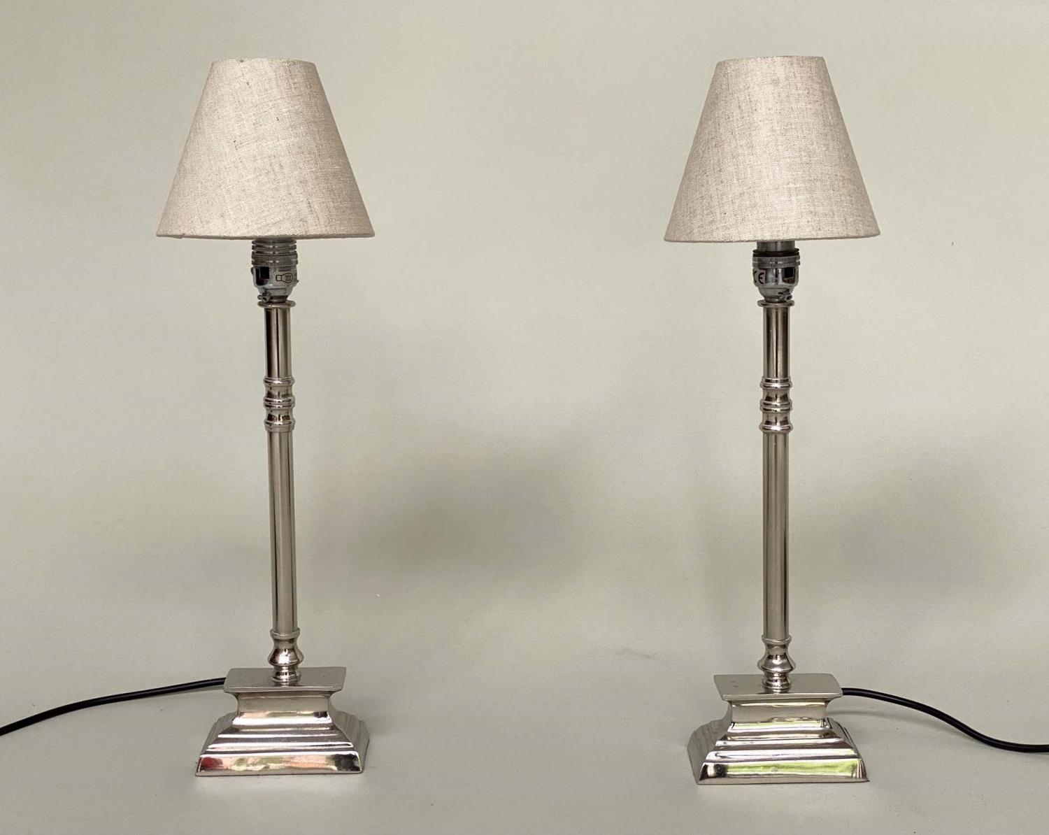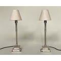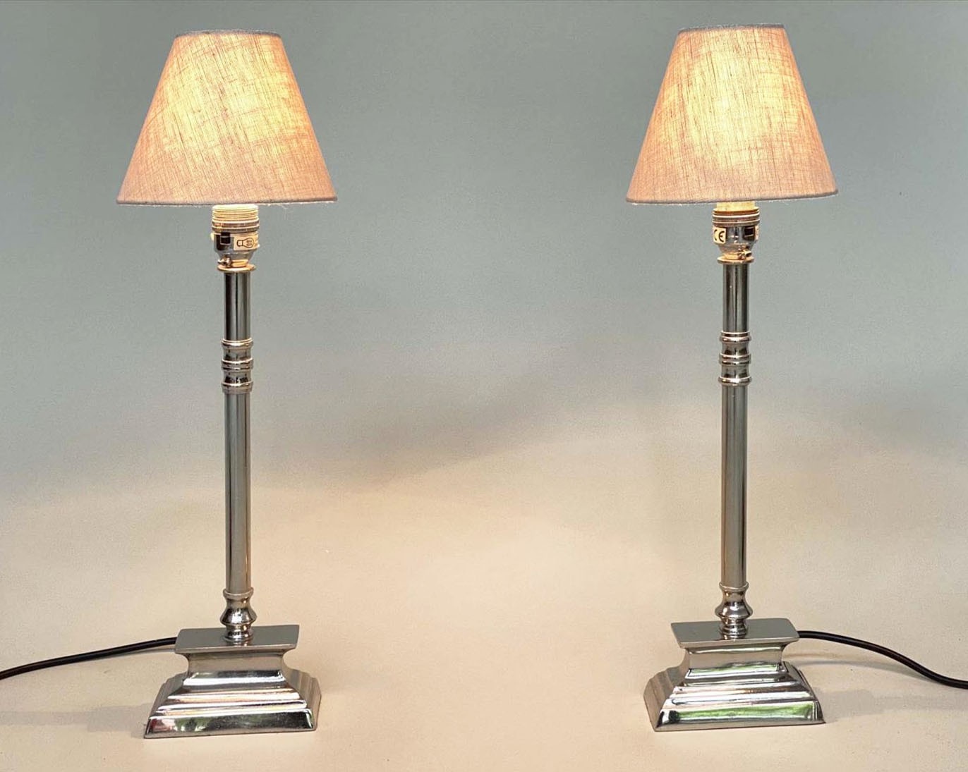 CANDLESTICK TABLE LAMPS, Italian style chromium metal with stepped plinths and shades, 50cm H. (2)