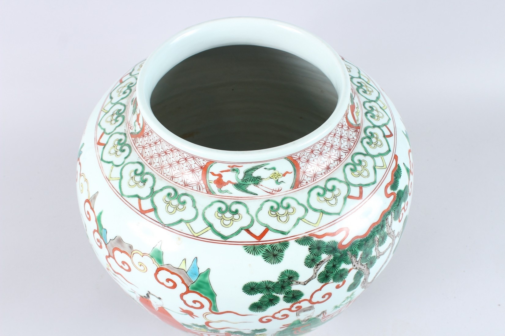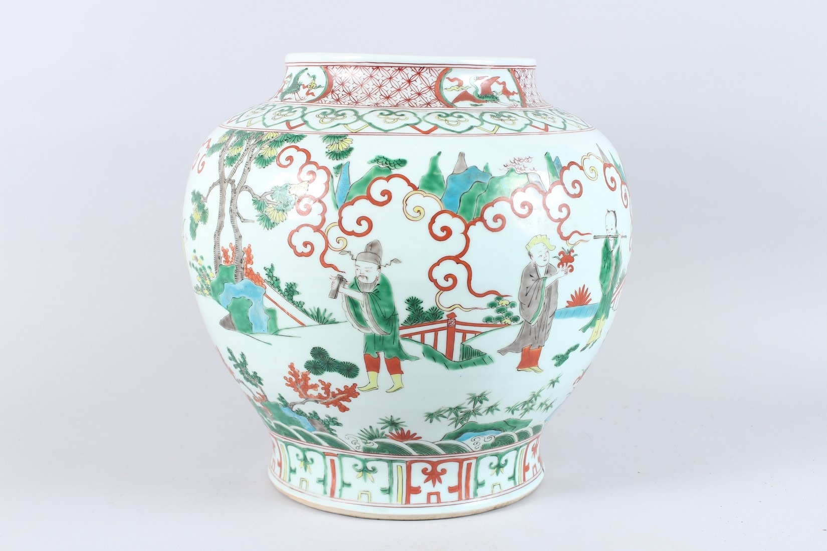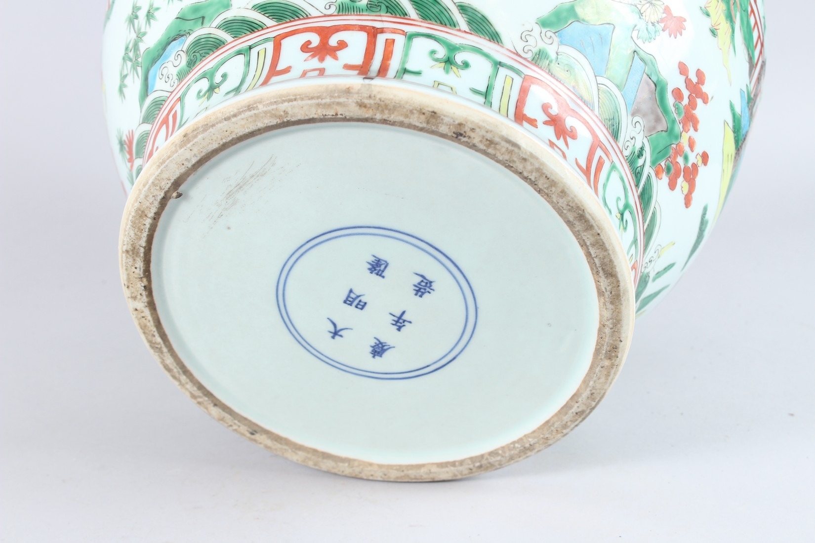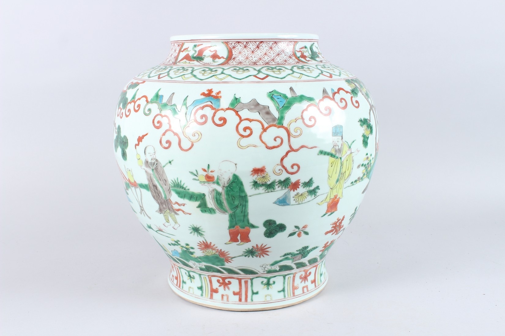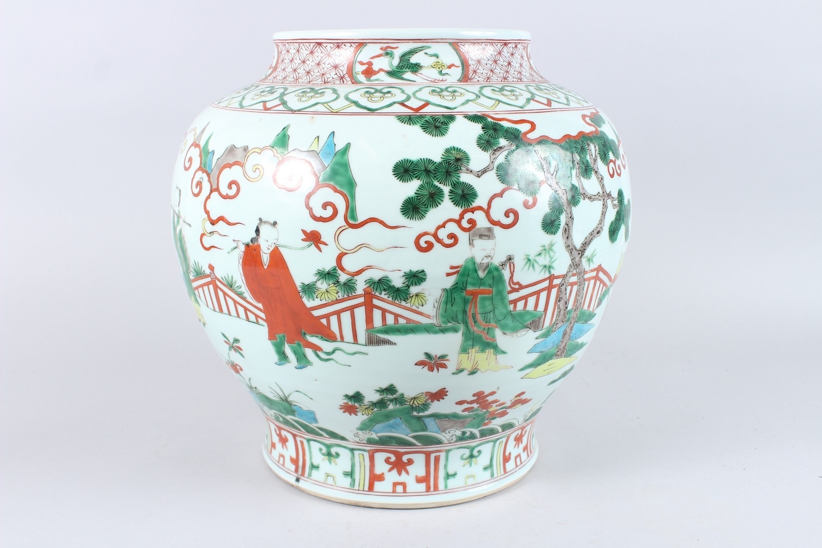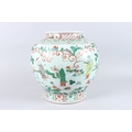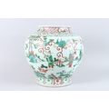 A GOOD LARGE CHINESE FAMILLE VERTE PORCELAIN JAR, painted with figures in a landscape, six character mark to the base.