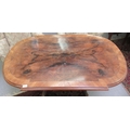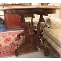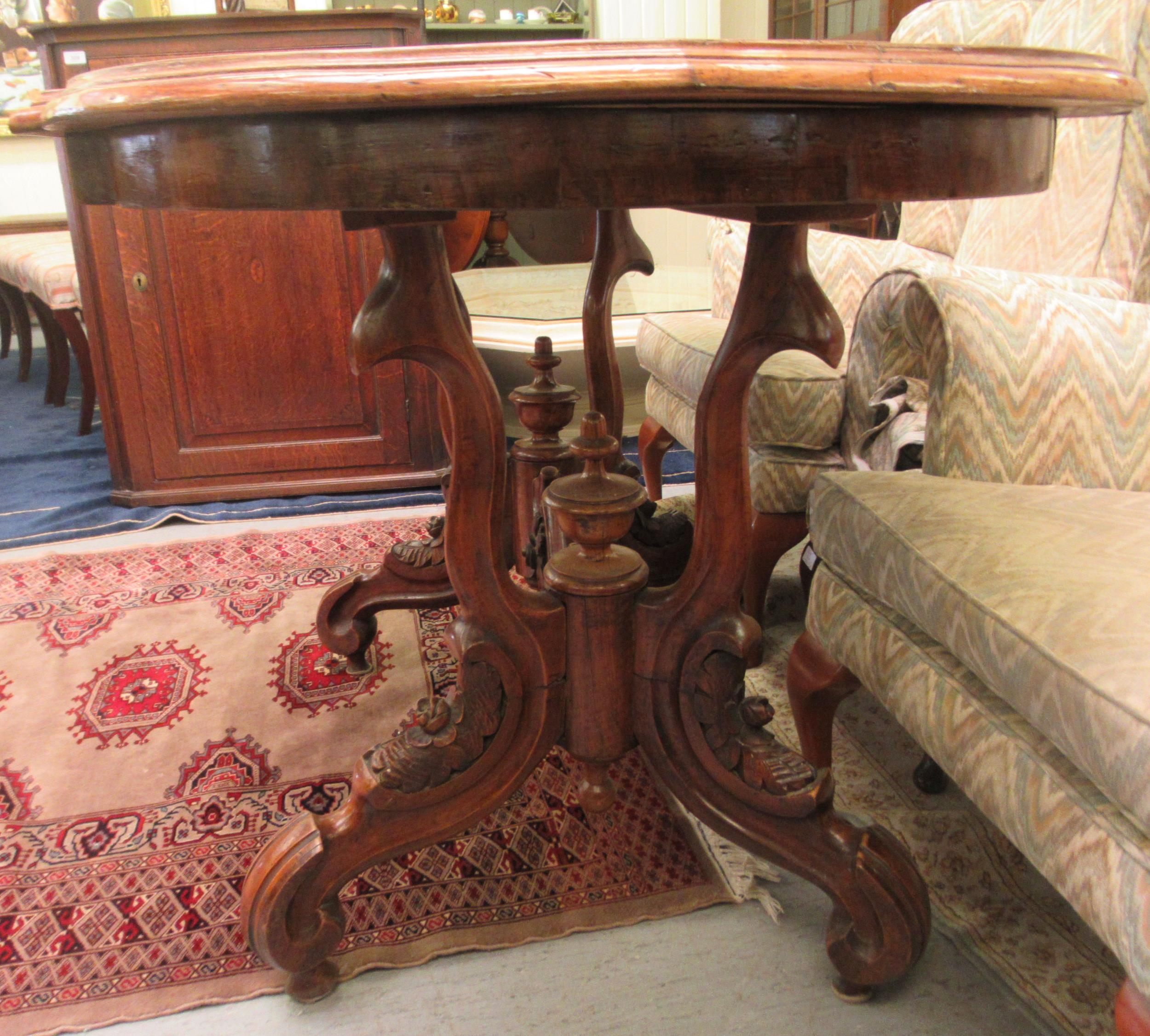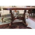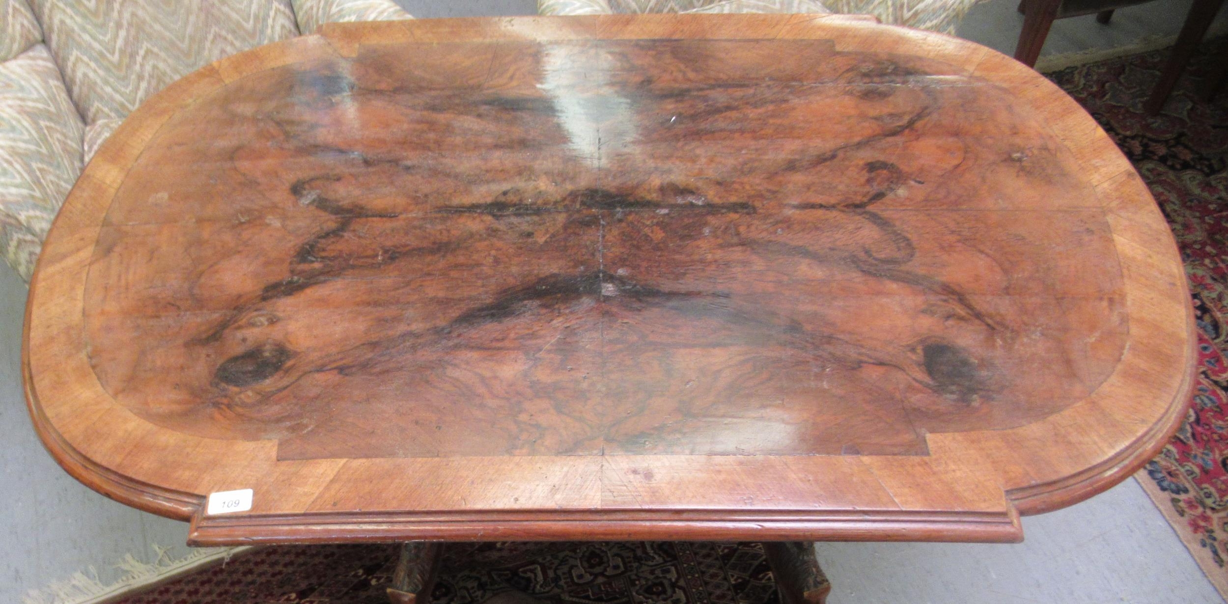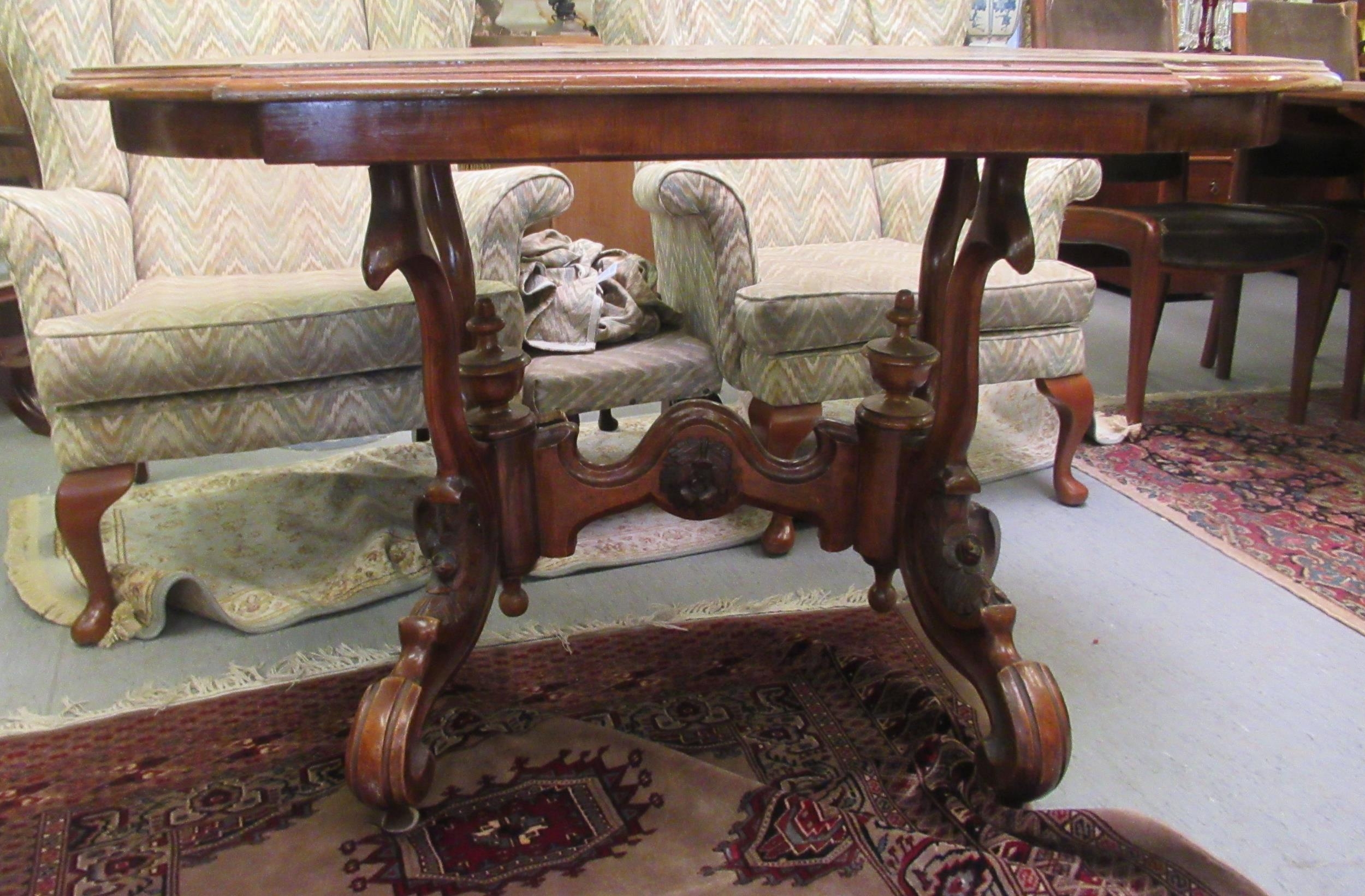 A late Victorian crossbanded mahogany centre table, the top with a moulded breakfront edge, raised on carved and turned supports, splayed legs and scrolled feet 30"h 49"w