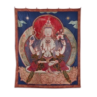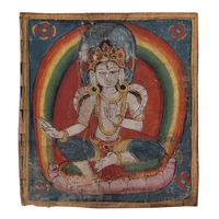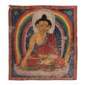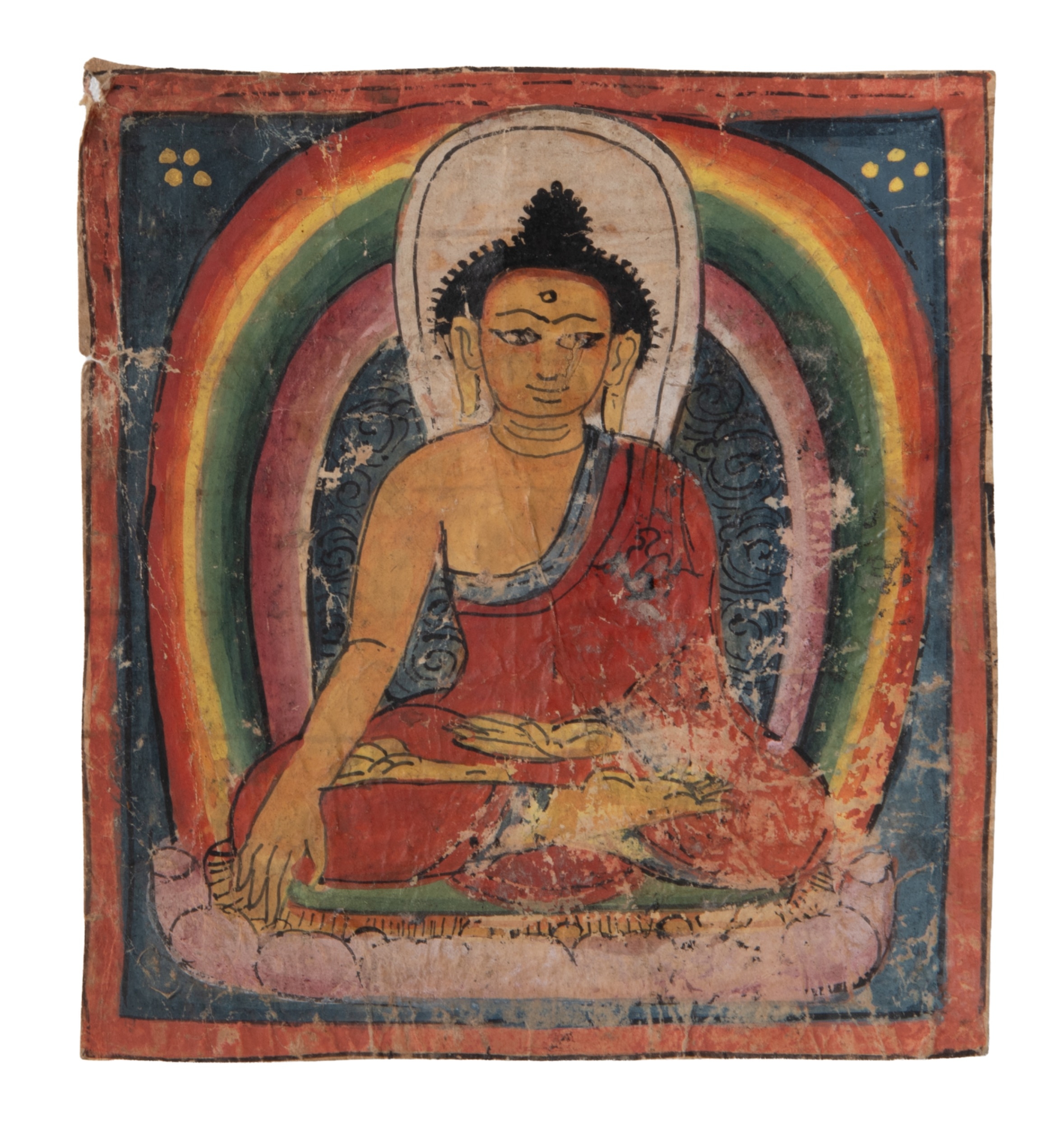 A PORTABLE THANGKA DEPICTING SHAKYAMUNI BUDDHA 西藏 十三世纪 随身释迦牟尼佛唐卡 Tibet, 13th century Size.12.5x11.7cm Painted in mineral pigments on paper, the composition centered on Shakyamuni Buddha seated in bhūmisparśa mudrā (the earth-touching gesture), symbolizing the moment of enlightenment beneath the Bodhi tree. The Buddha is depicted in a red monastic robe over a yellow inner garment, surrounded by a rainbow aureole and mandorla, representing the radiance of awakening. The painting’s compact format and portable nature suggest its use as a tsakli or traveling thangka, intended for personal devotion or ritual protection. 此幅唐卡以天然矿物颜料绘制于布本之上,主尊为释迦牟尼佛结跏趺坐,右手触地印,象征降伏魔障、证悟成佛。佛身披红黄二色袈裟,背后绘彩虹光环与背光,寓意觉悟之光普照。画幅尺寸较小,属随身供奉或出行携带之唐卡(tsakli),多用于修持、护身或密教仪轨中。