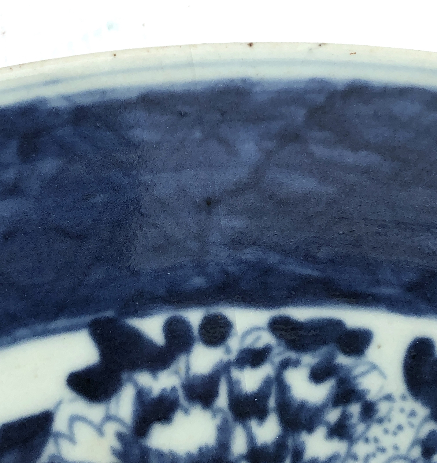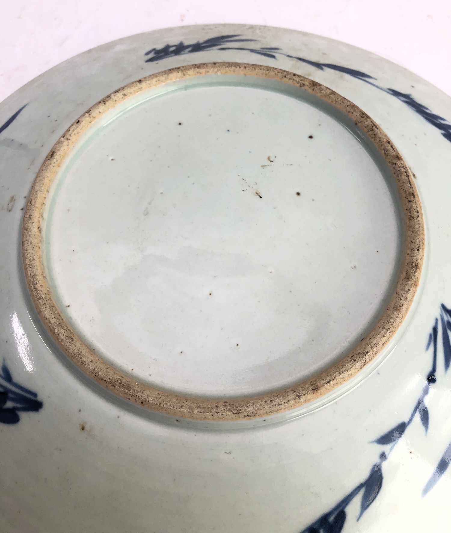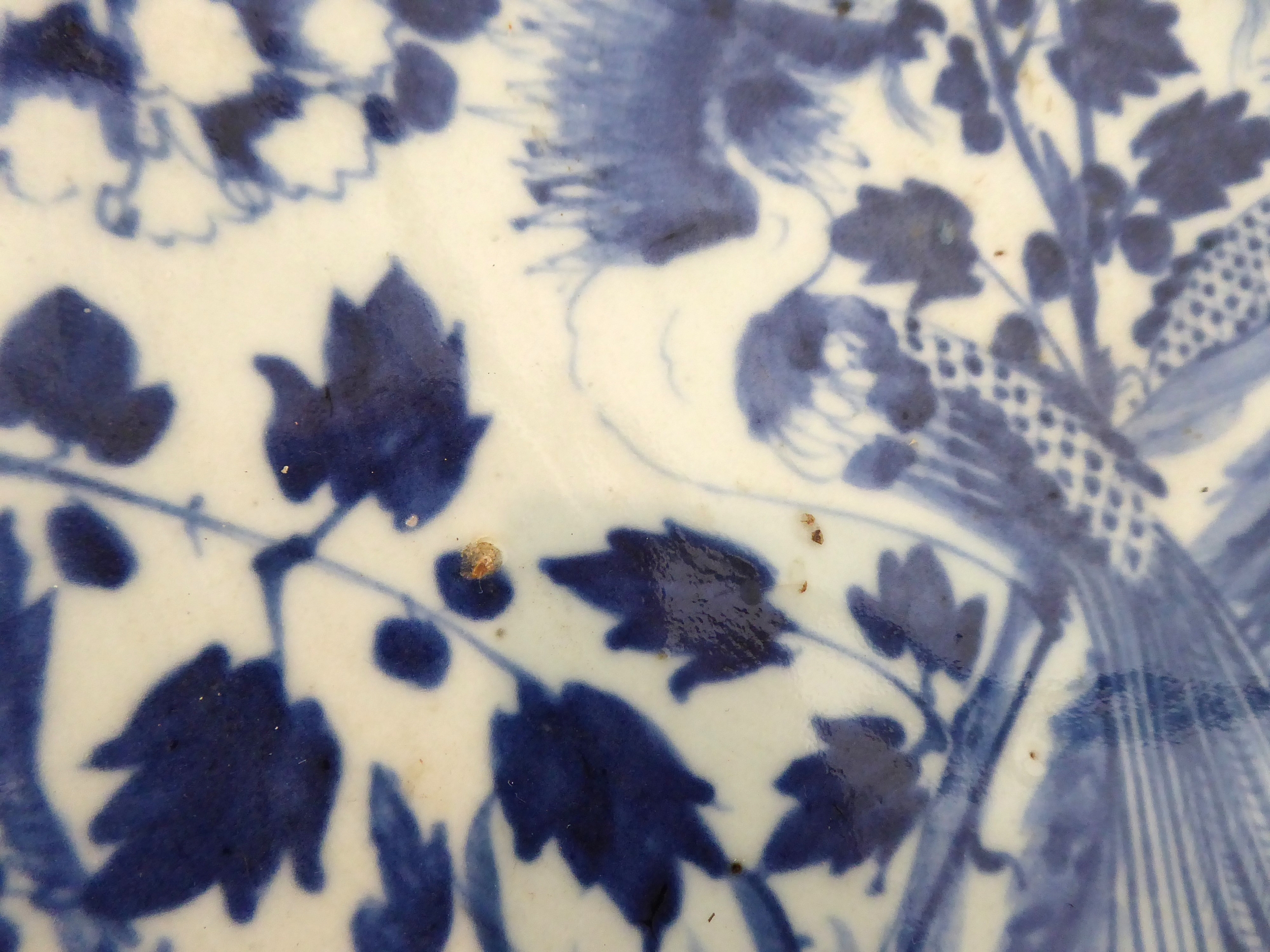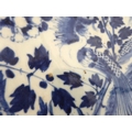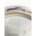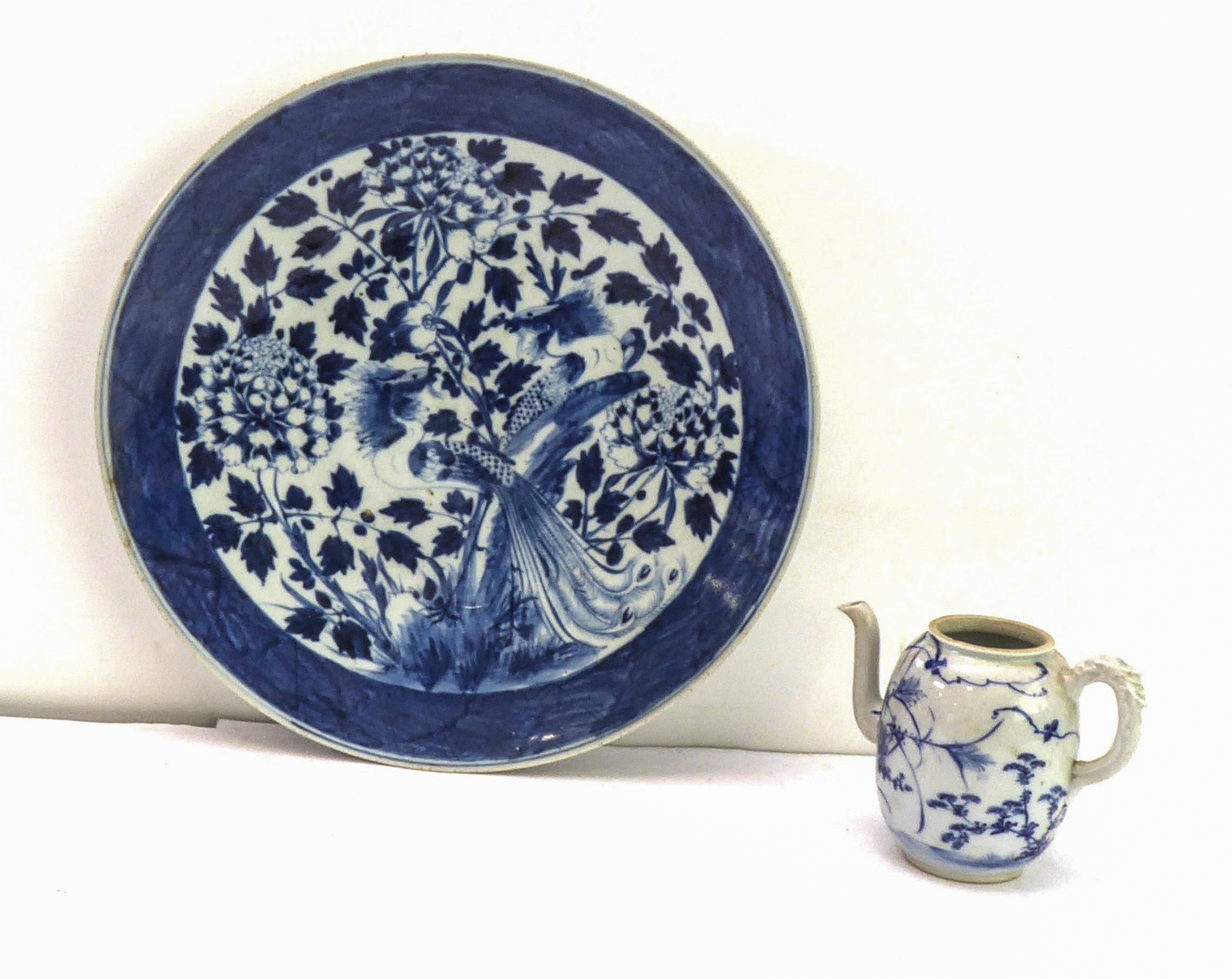 1. a 19th century Chinese blue-and-white porcelain charger decorated with exotic birds amongst peony and leaves (37.75 cm in diameter). * Condition: 3in. hairline to rim - visible to both upper and lower surface of the dish. Tiny iron oxide coloured glaze flaw to rim. No other faults or damage. No restoration.