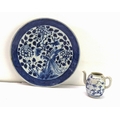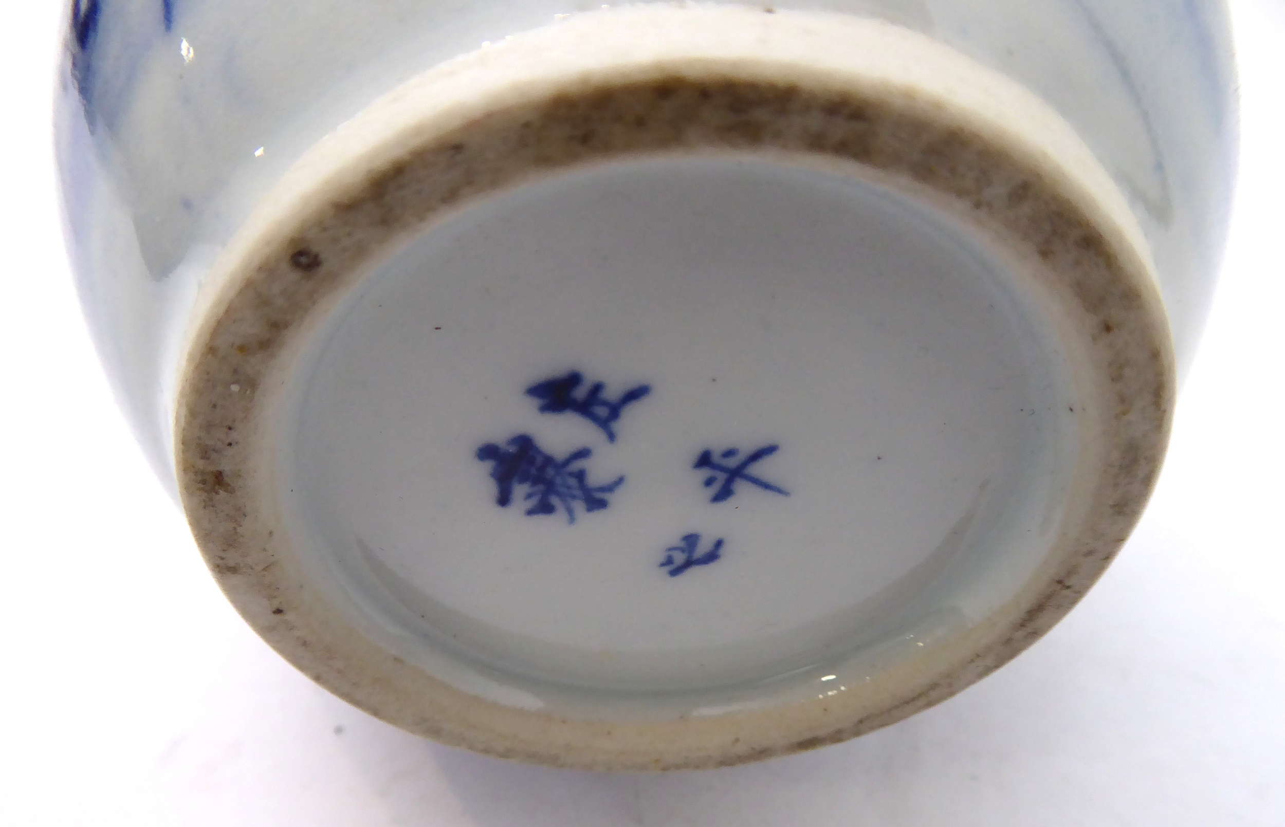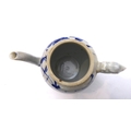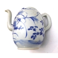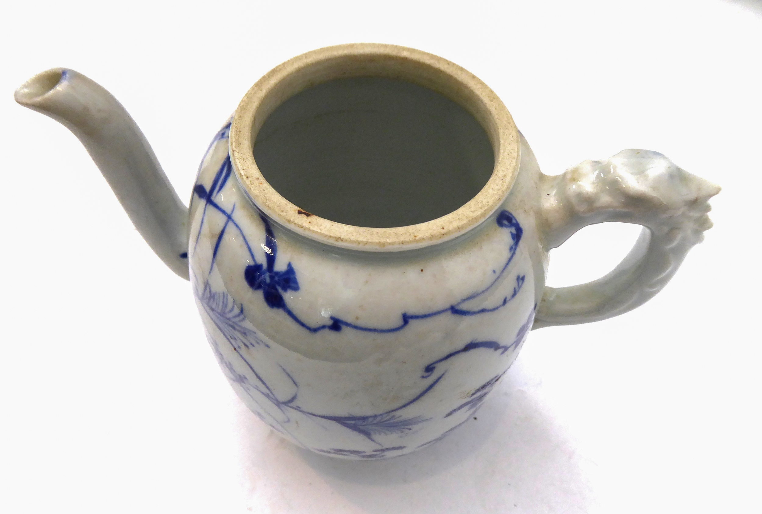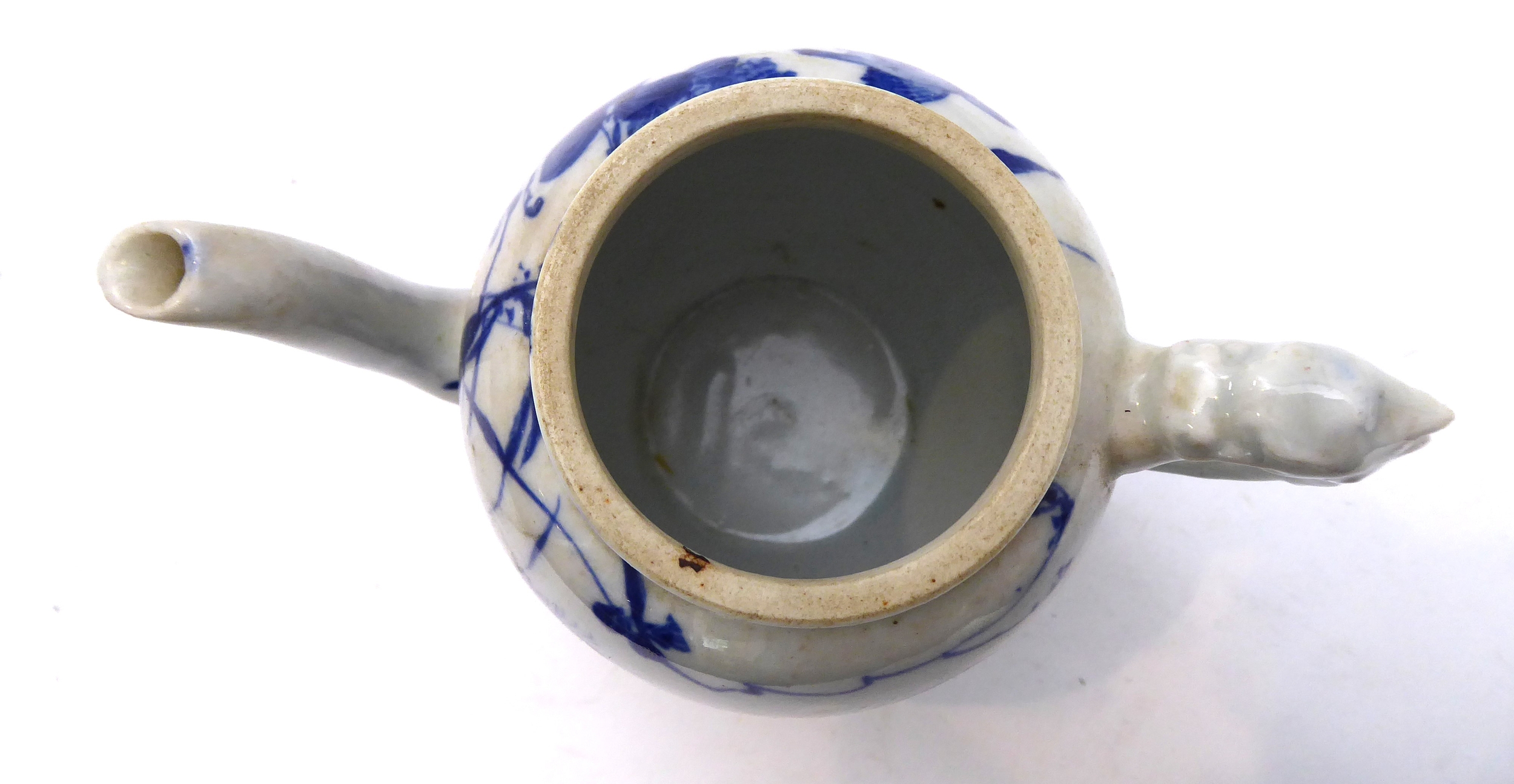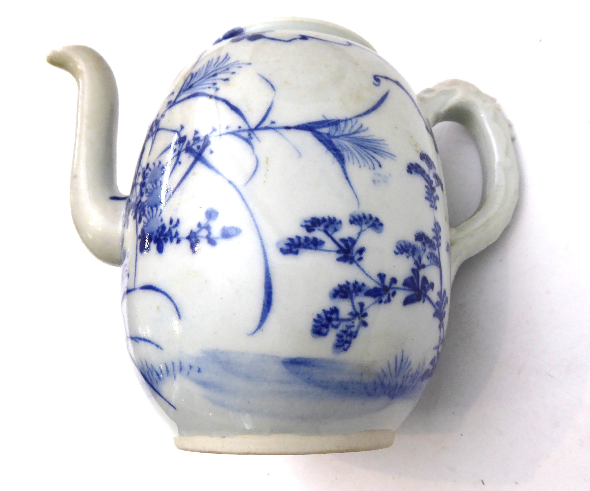 2. a 19th century Japanese porcelain teapot (minus cover), similarly decorated in underglaze blue with a bird flying above foliage and shrubs, painted four-character mark to underside, moulded dragon handle (12 cm in diameter). * Condition: Lacks cover. Otherwise good with no chips, cracks or other faults.