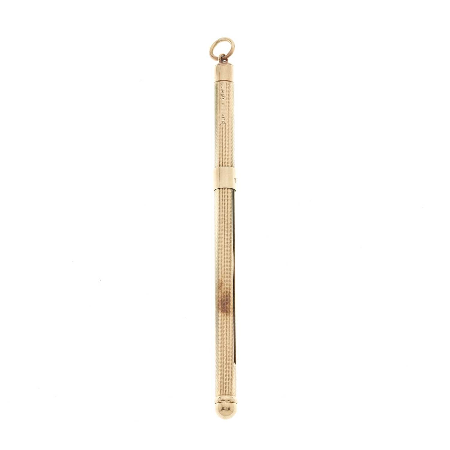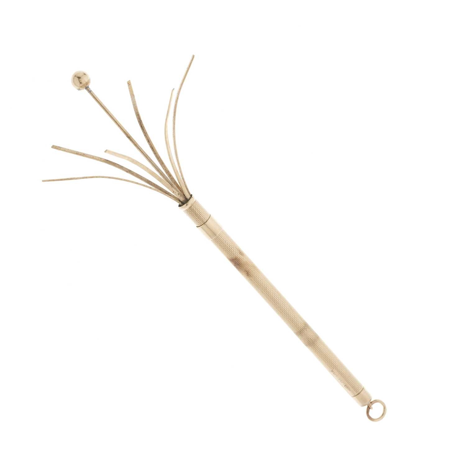 Asprey & Co., a 9ct gold engine-turned swizzle stick, maker's marks for Asprey & Co., hallmarks for London 1977, extended length 12.6cm, retracted length 8.7cm, total weight 7.4g