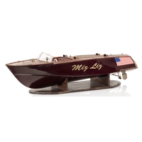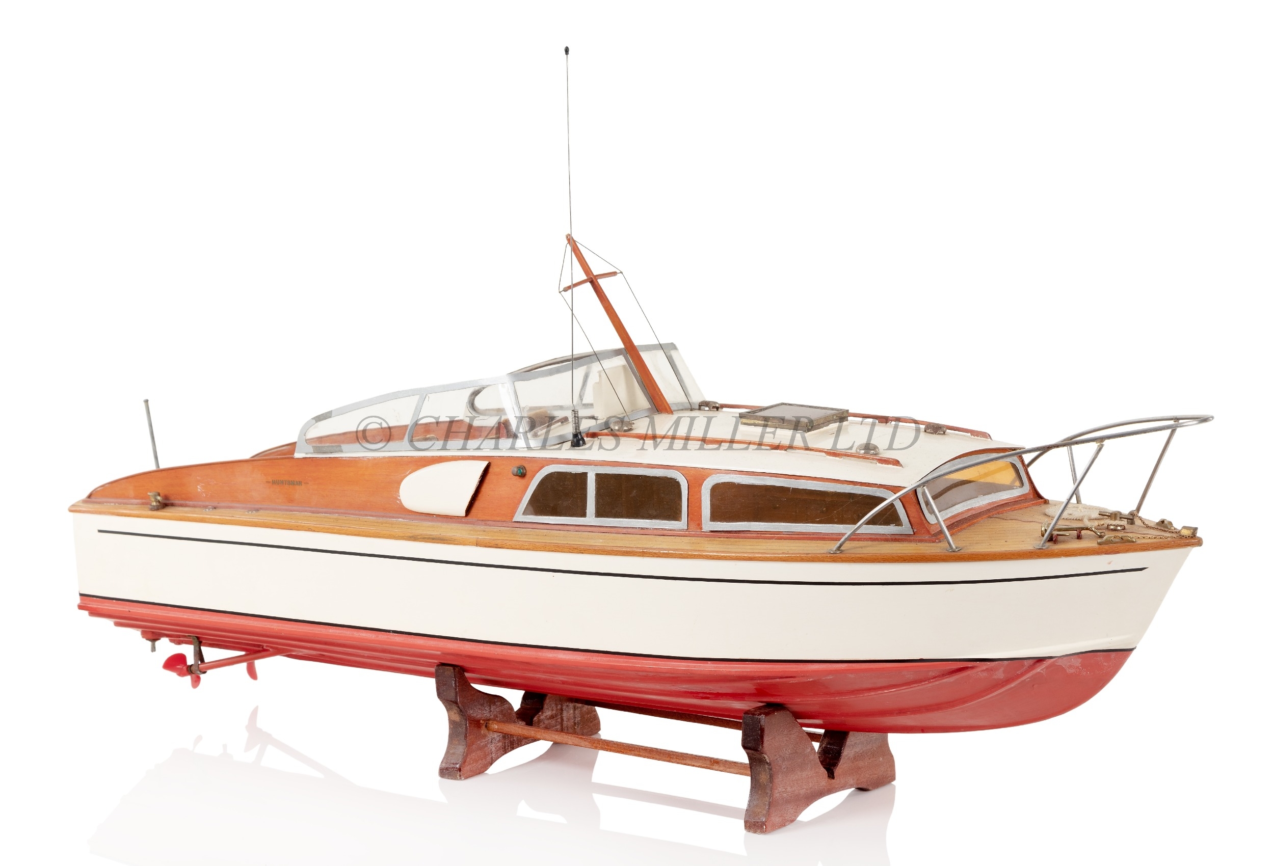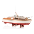 the wooden hull with glazed cabin with interior furnishings and three bunks, opening doors to cockpit with upholstered seats, wheel, instruments and controls, aft deck and opening stern doors, external details include pulpit, anchor, cleats, signal mast, powerplant details include two Hummingbird 30 motors, two shafts, propellers and rudders and A comms radio control, finished in red, white, varnish and polished brightwork -- 15 x 43in. (38 x 109cm.); together with transmitter, stand, and carrying box