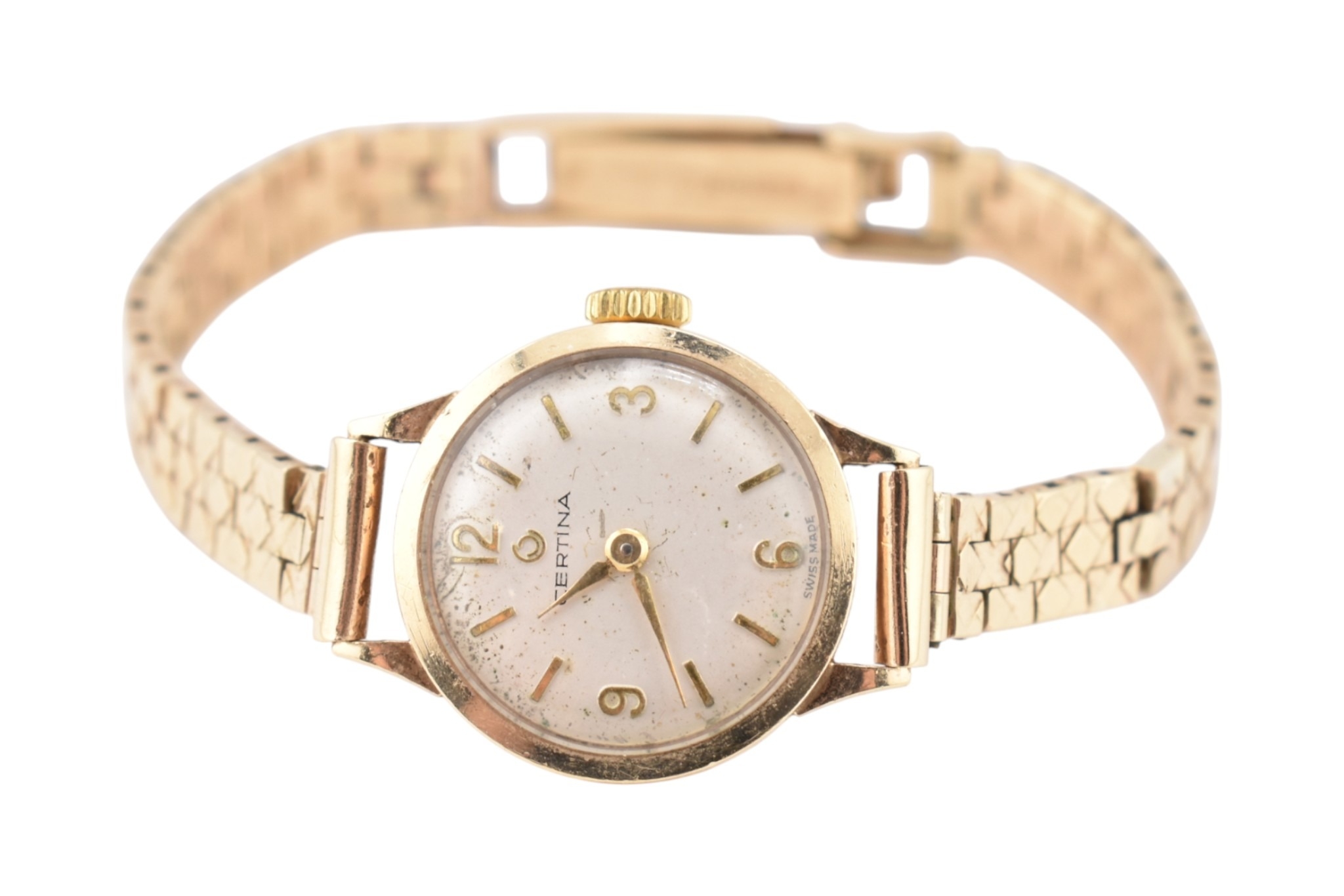 A Certina 9ct gold watch. The watch with a champagne dial and dagger hands. Total weight 17.7g. Measures case 1.8cm excluding winder. Ticking at the time of cataloguing, but not guaranteed to continue to do so.
