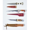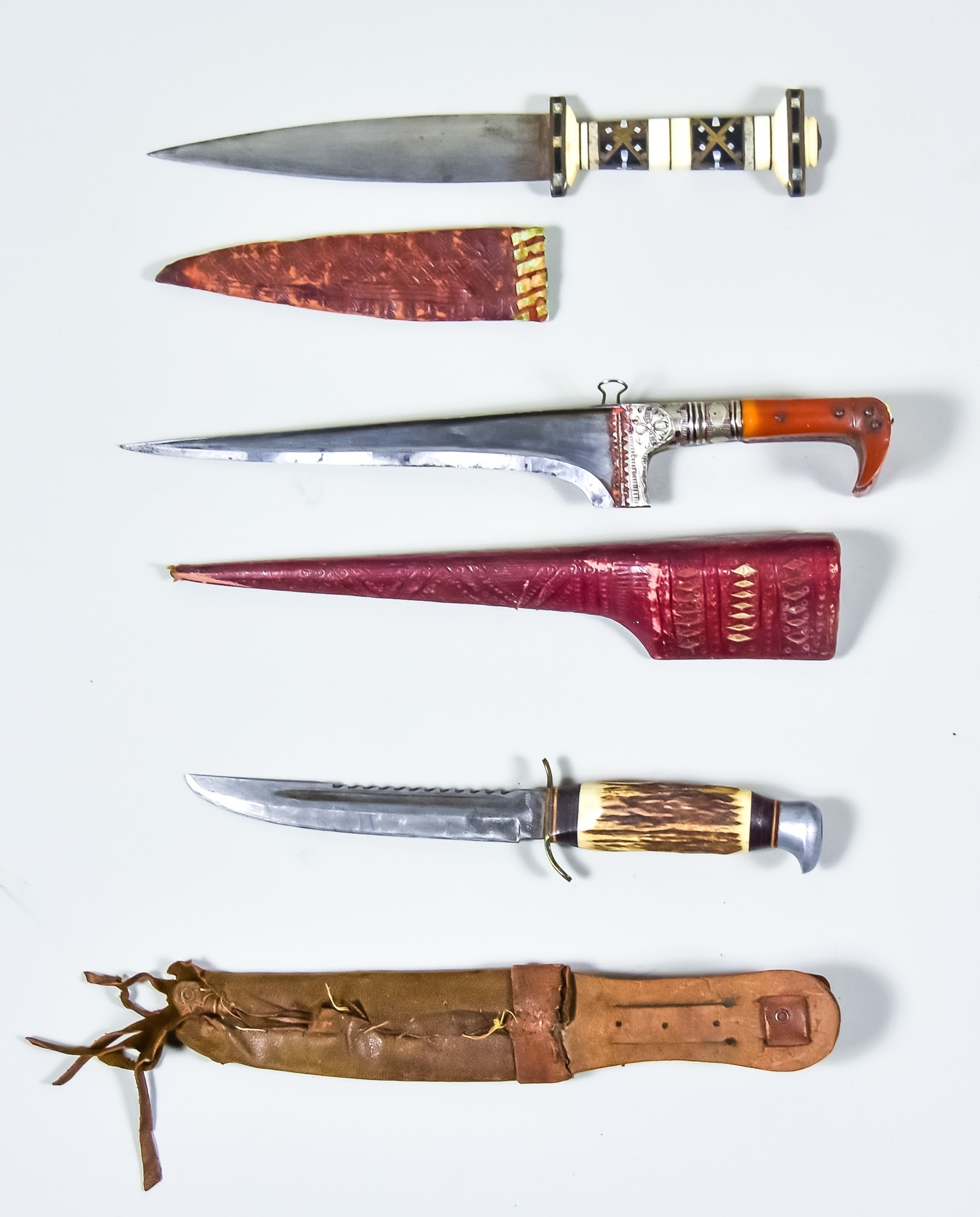 Three Edged Weapons, comprising - a North African dagger, 6ins bright steel double edged blade, hilt set with ebony, bone and silver coloured metal, leather scabbard, 10ins overall, a 19th Century Indo-Persian dagger, 8ins T-section blade, silvery metal embellishments to hilt, in decorated leather sheath for same 12ins overall, and a 20th century sheath knife by Kronenkrebs of Solingen Germany, 5.5ins fullered bright steel saw back blade, stag antler grip, leather sheath