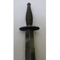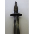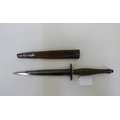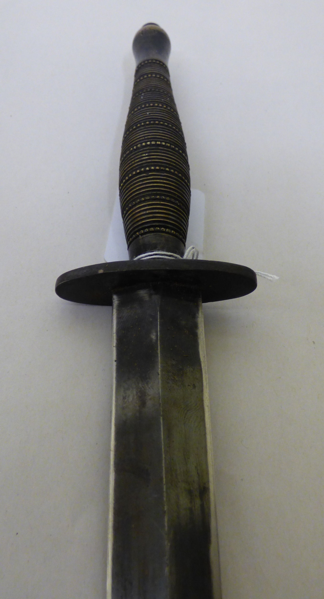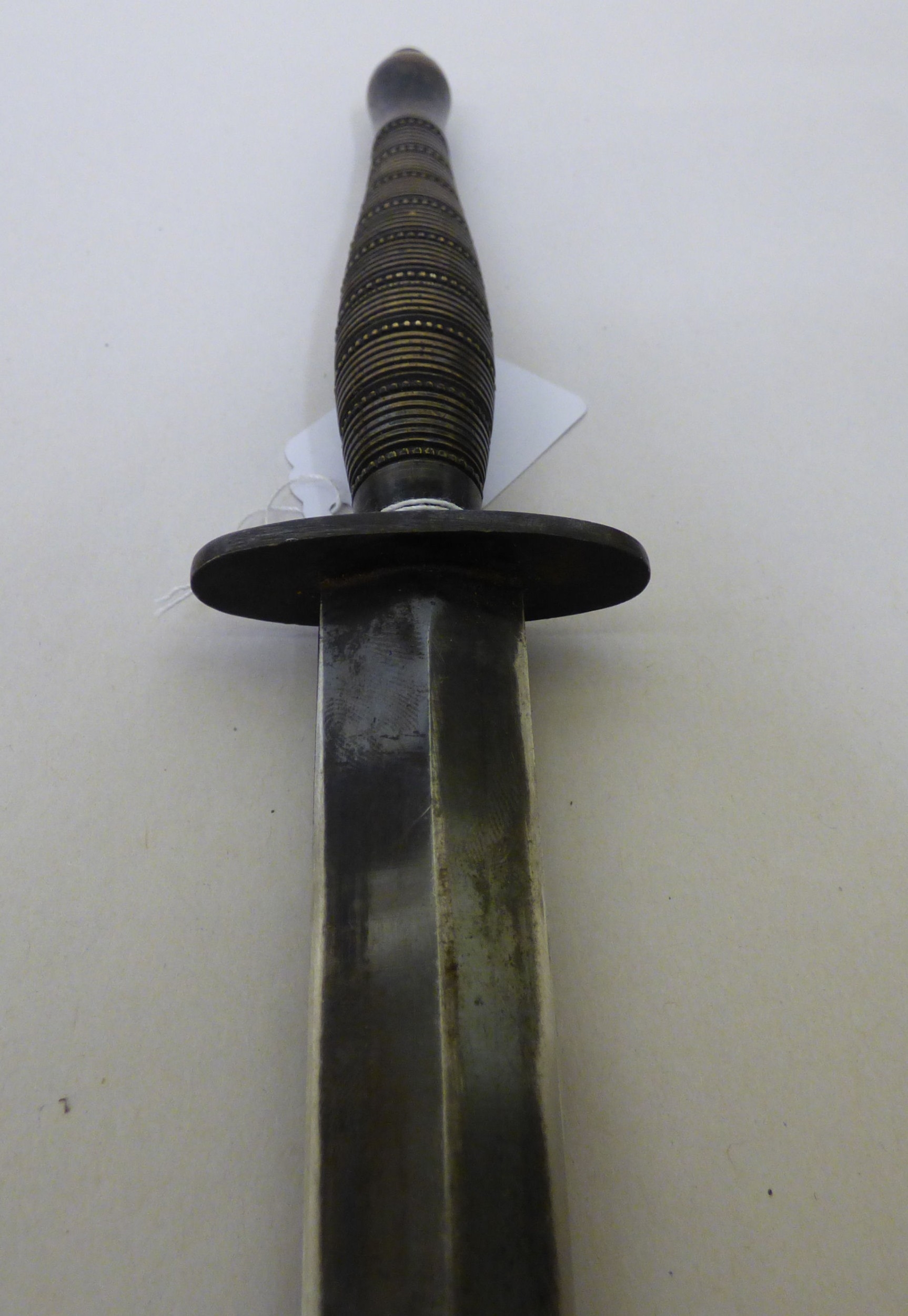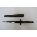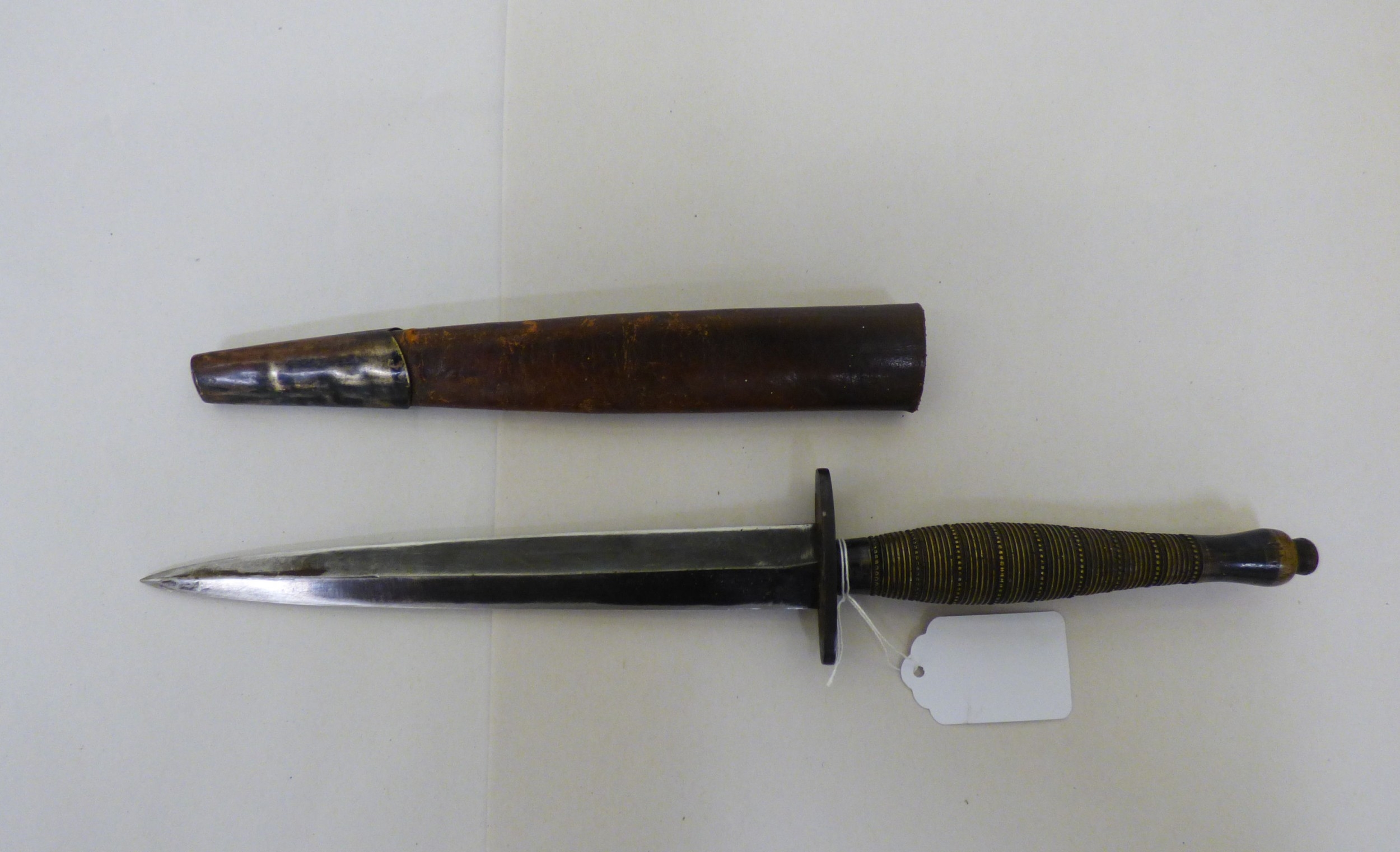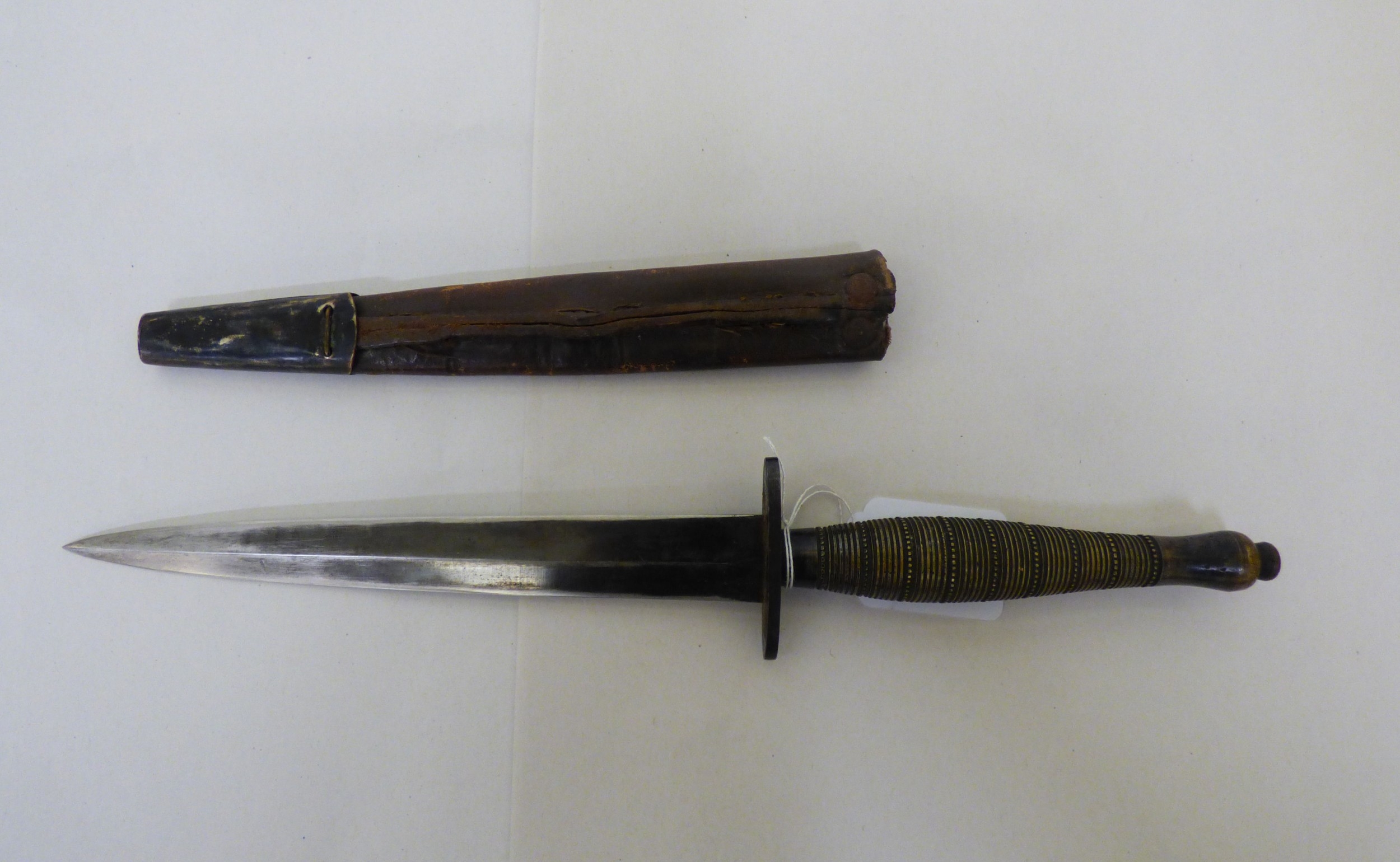 A Fairburn & Sykes design fighting knife the blade 7"L, on a fluted brass handle with a hide sheath