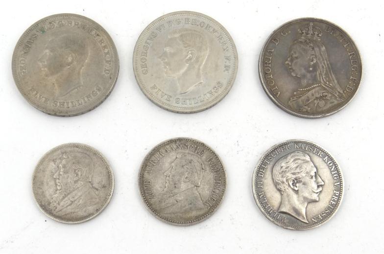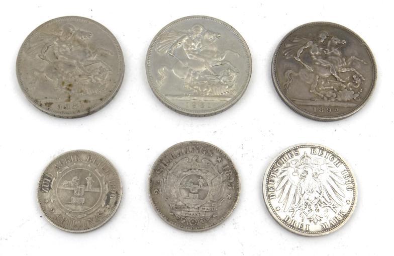Two boxed 1951 Festival of Britain crowns, a 1892 silver crown and three other coins