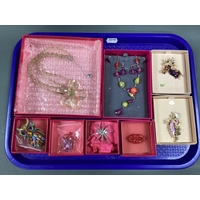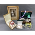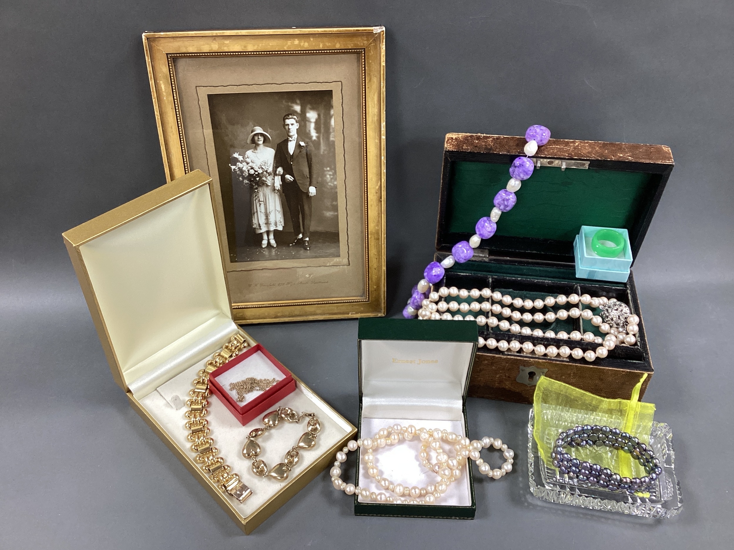 Le Monde des Bijoux 925 Gilt Heart Bracelet, together with an antique jewellery box with lift our tray, a vintage gilt metal bracelet, a fresh water pearl bead necklace, vintage wedding photo in gilt frame, glass ashtray / trinket dish etc :-One Tray