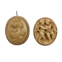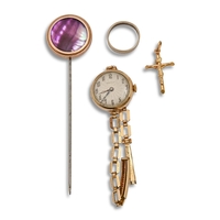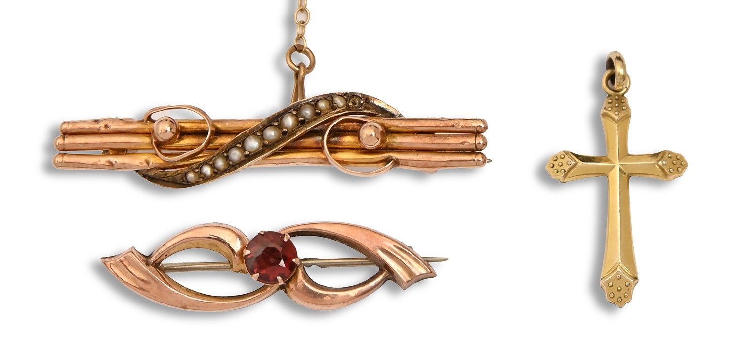 Two split pearl or red paste bar brooches, c1900, in gold, marked 9ct and a gold cross, marked 14ct, various sizes, 4.6g (3)