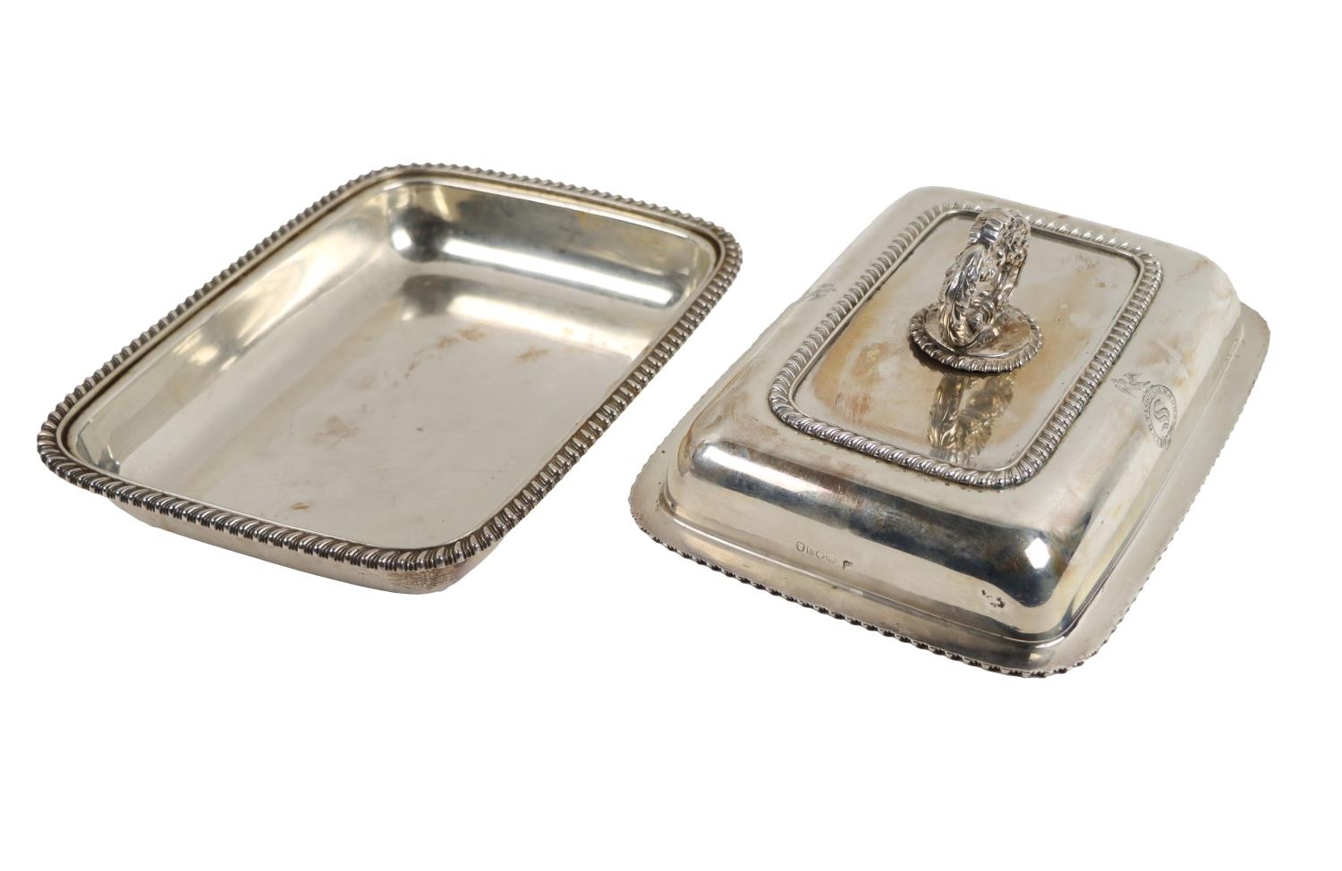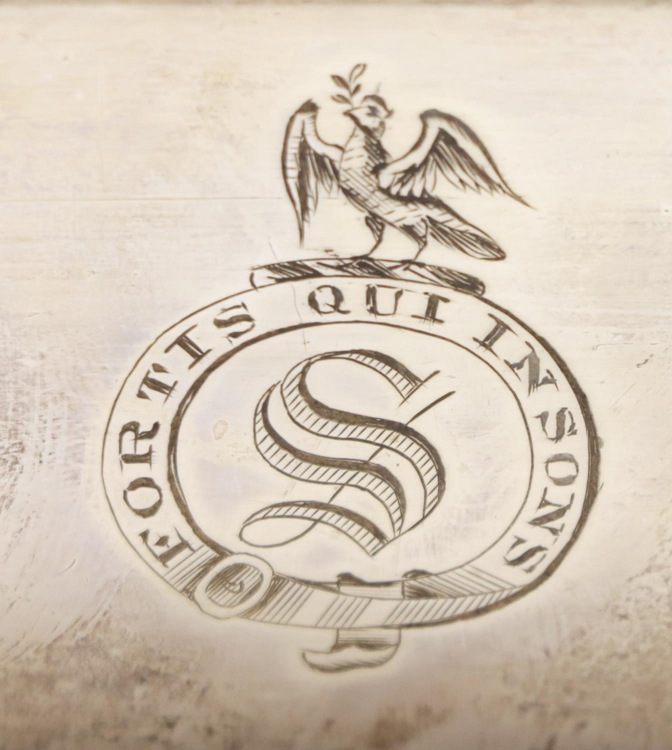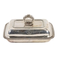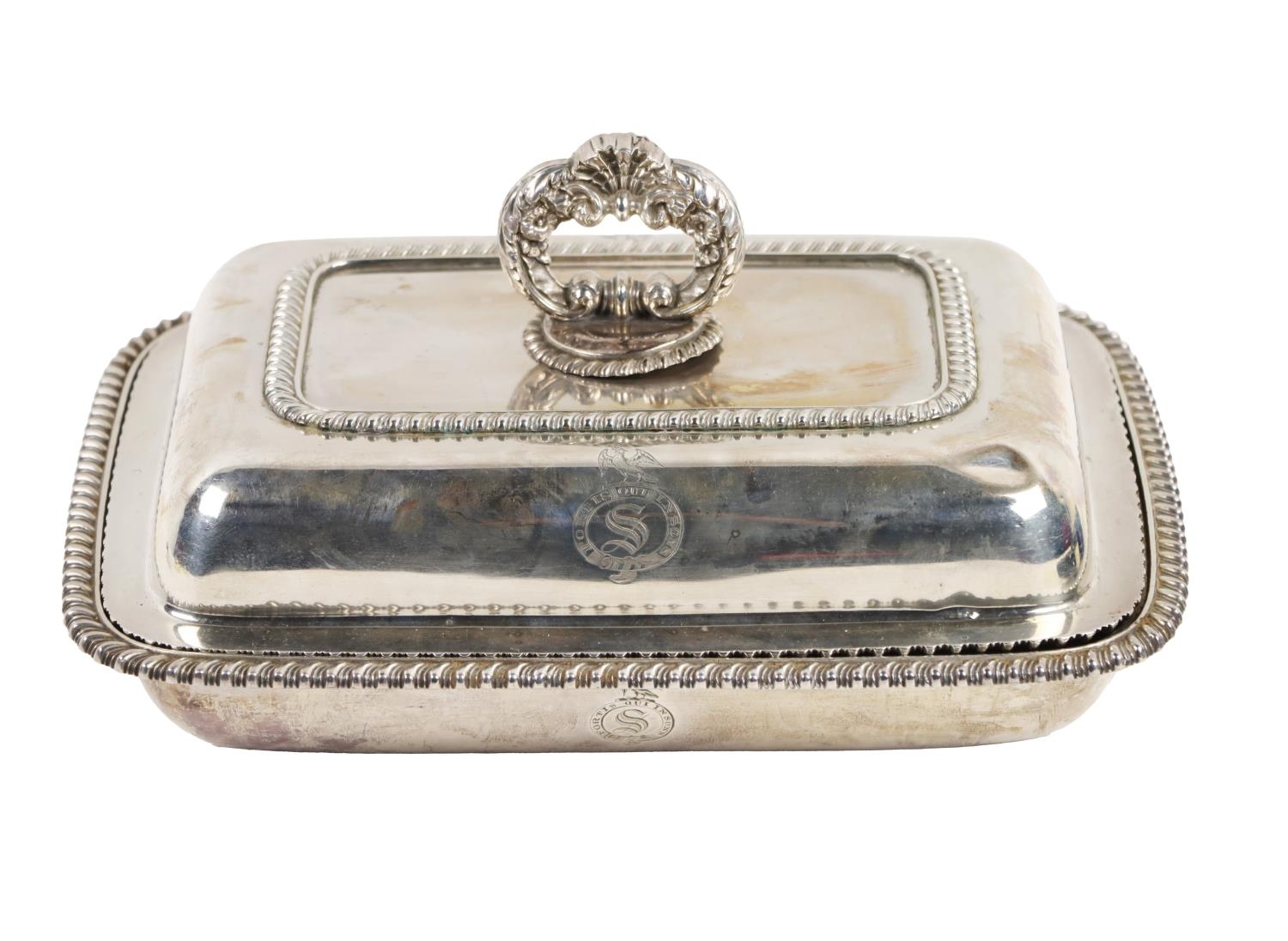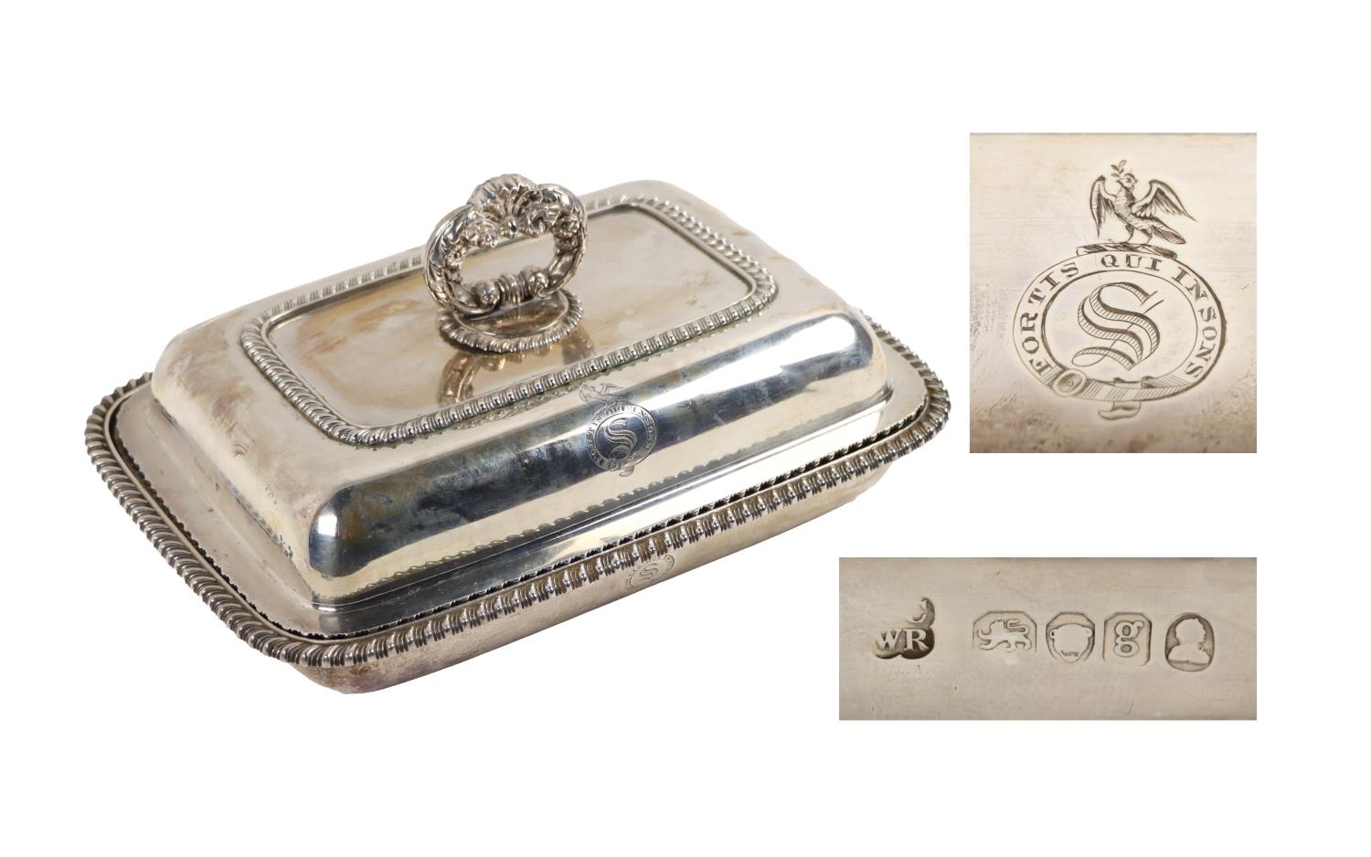 A fine quality Georgian period English silver Entree Dish and Cover, with shell and floral design handle, and crested both sides 'Foris Qui In Sons' with central 'S', hallmarked London, by Joseph Craddock and William Ker Reid, c. 1822, approx. 30cms (12") long, 67 ounces. (1)