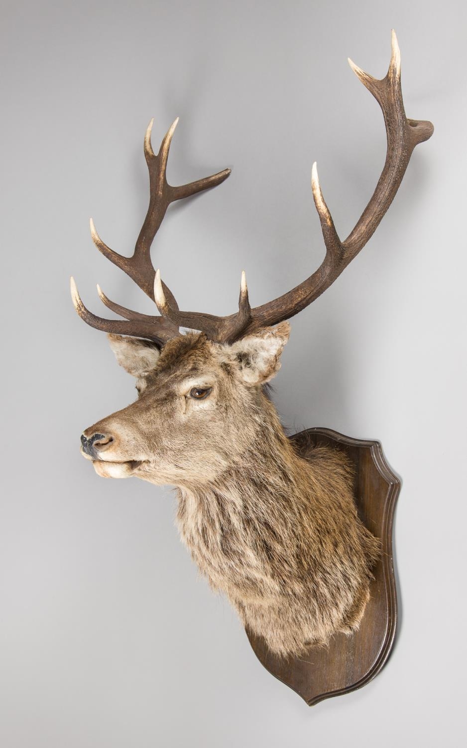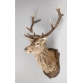 A LARGE AND IMPRESSIVE 20TH CENTURY TAXIDERMY RED DEER SCOTTISH ROYAL STAG SHOULDER MOUNT UPON AN OAK SHIELD.