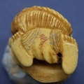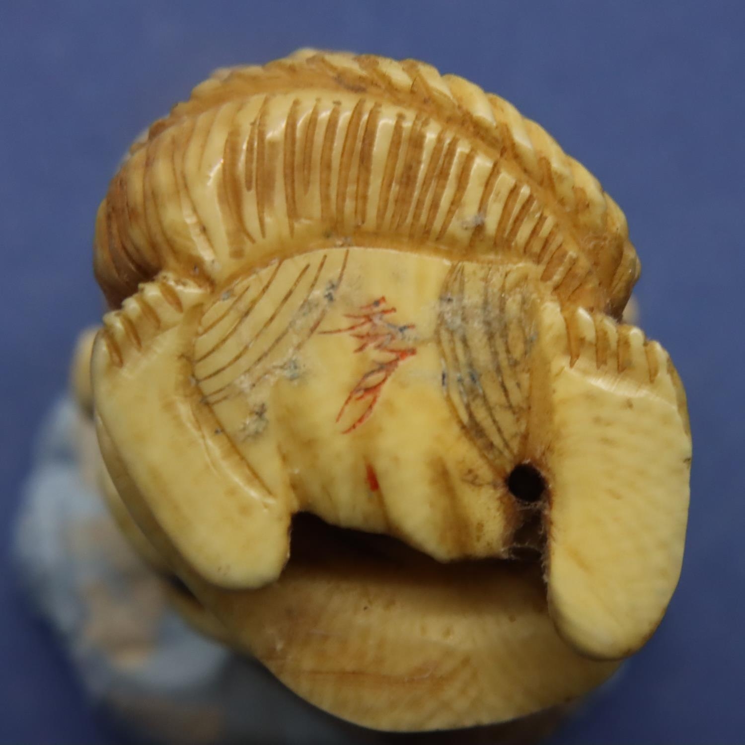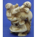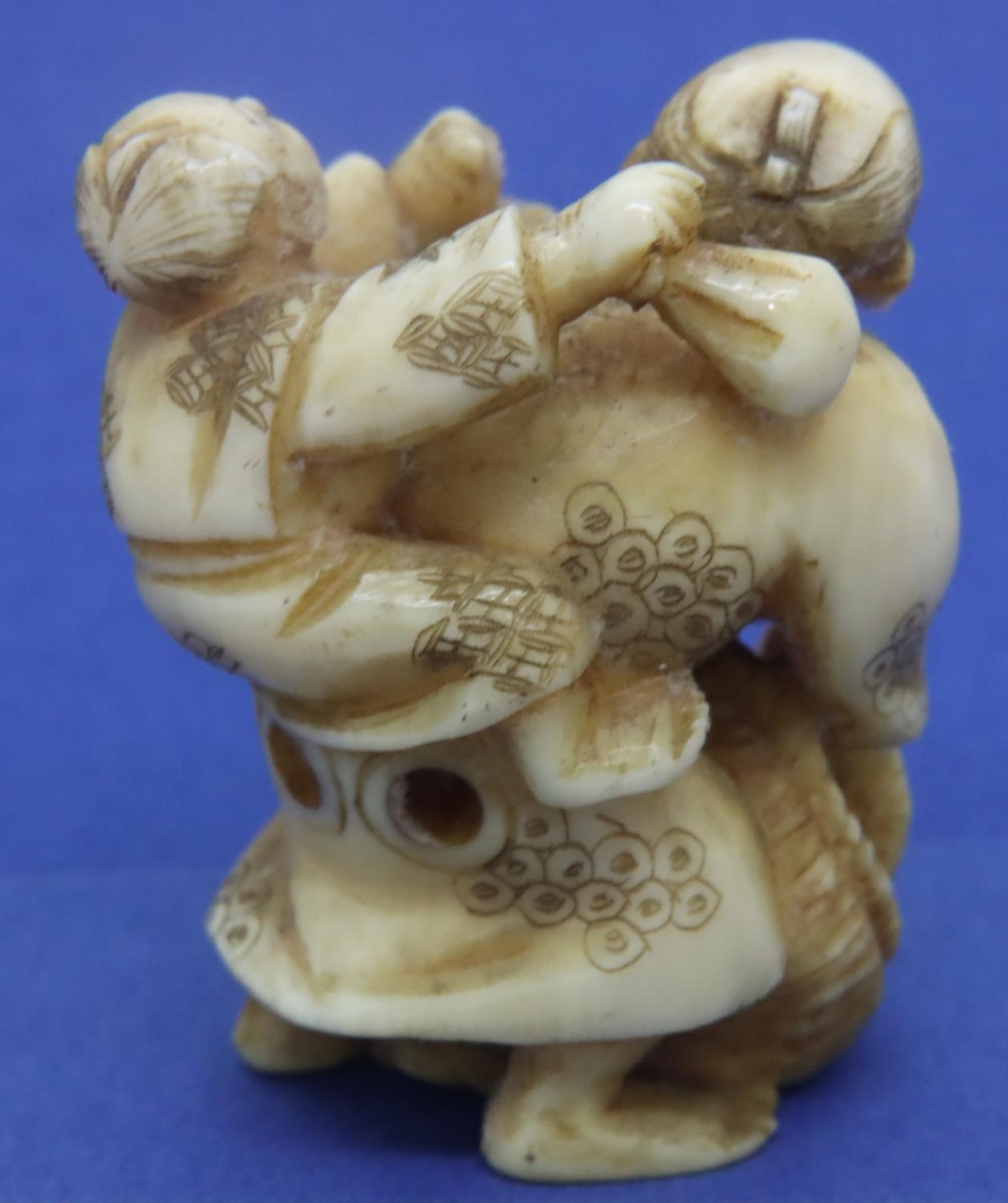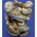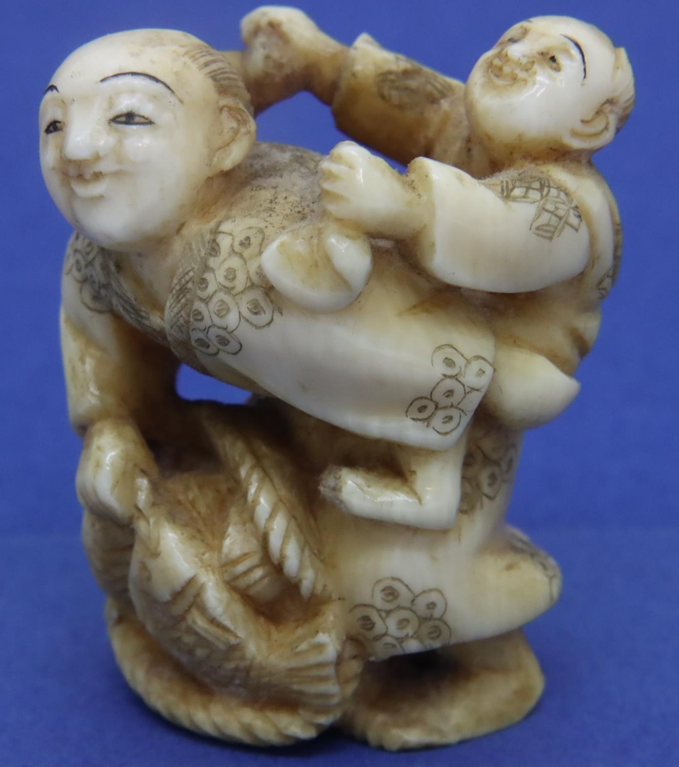 Ivory carved netsuke in the form of a man carrying fish with a boy on his back, H: 38 mm, signed to base. P&P Group 1 (£14+VAT for the first lot and £1+VAT for subsequent lots)
