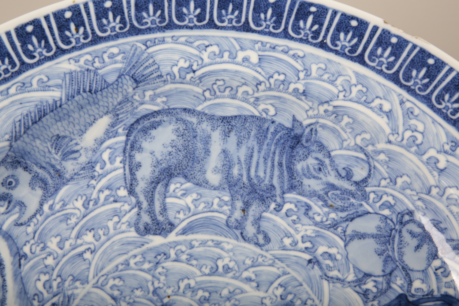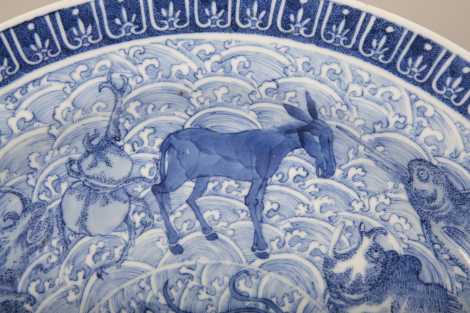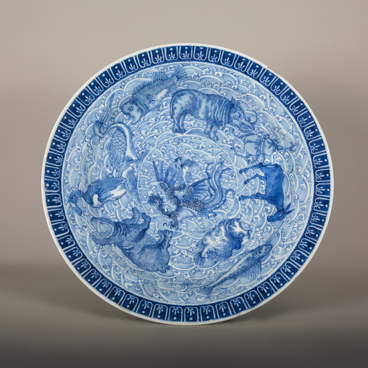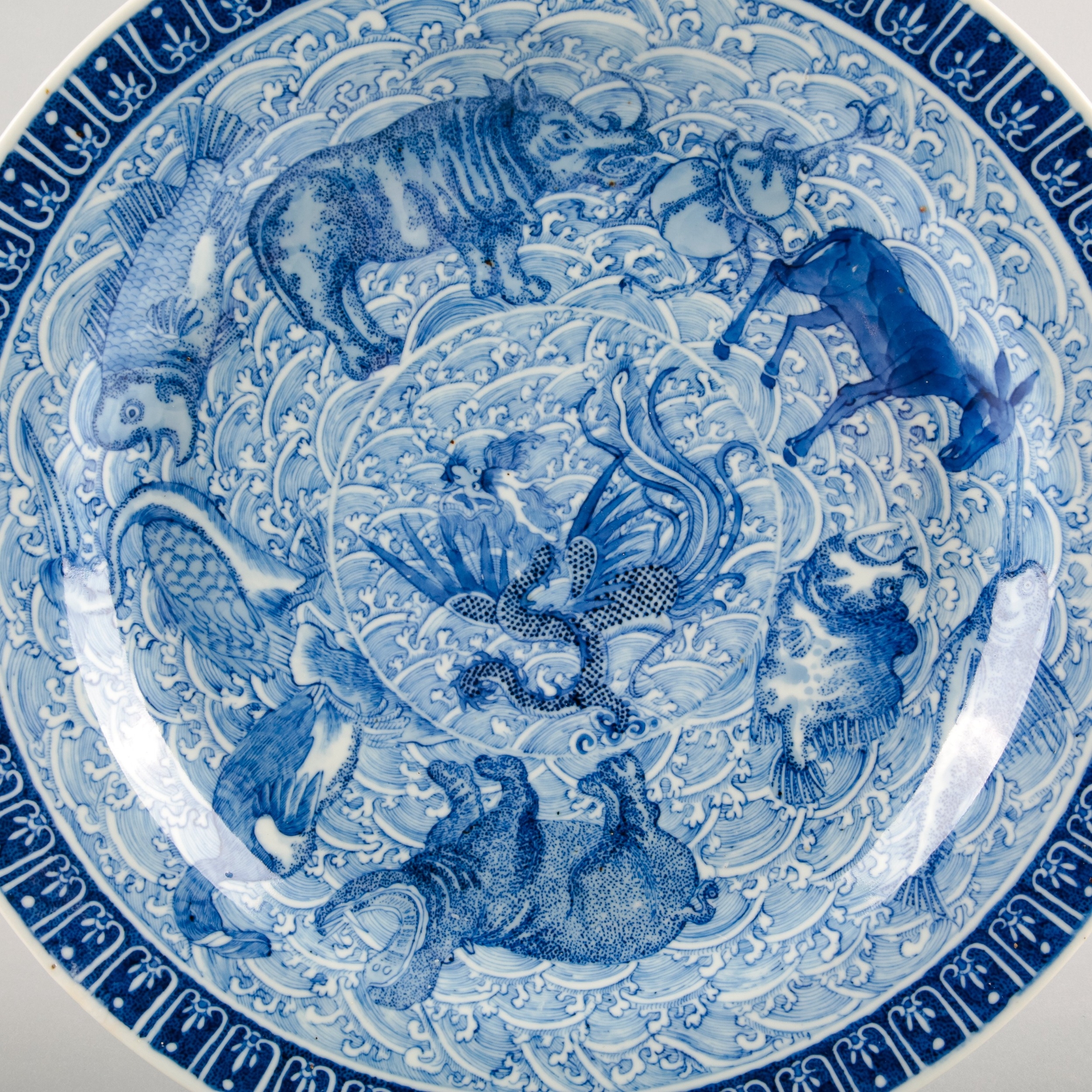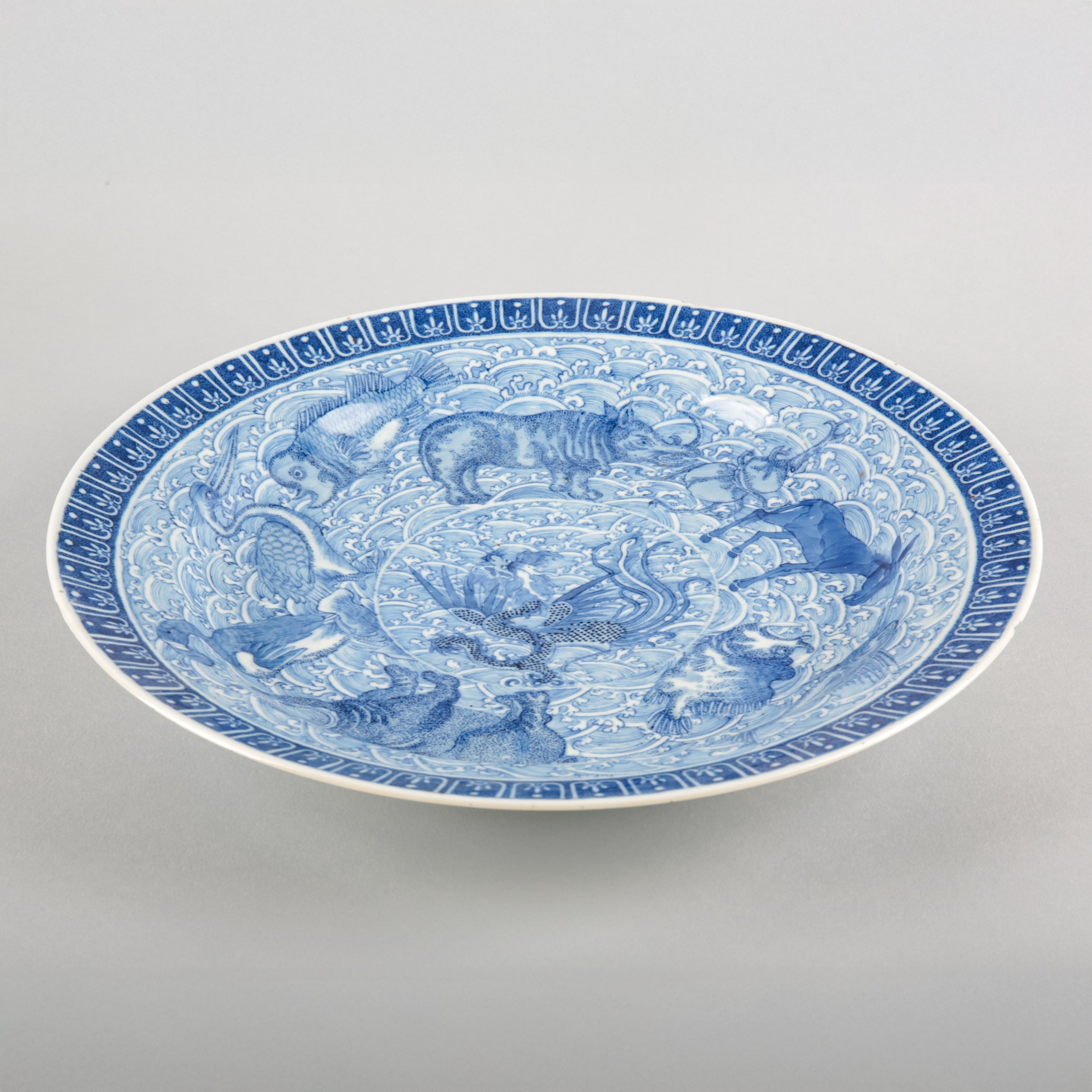 bearing a six character Kangxi mark to the base, likely early 19th century, decorated with a highly unusual array of animals and mythical creatures against a ground of the celestial sea, a phoenix with a dragon's head to the centre, amongst others a rhino, a hippo, a swordfish and a great auk, the underside decorated with Buddhist symbols, 36.5cm diameter