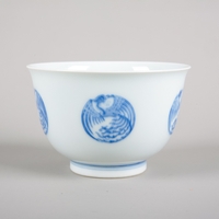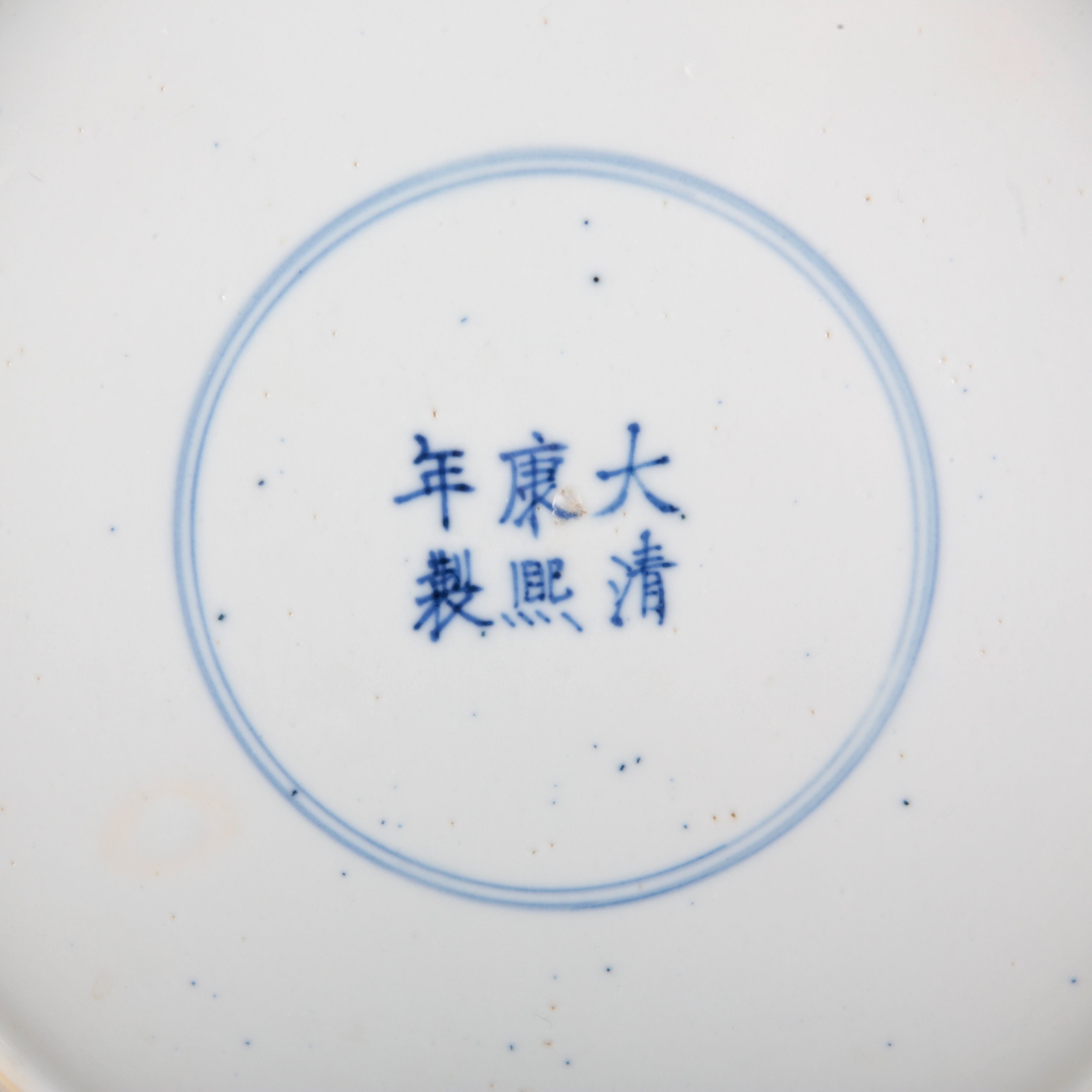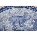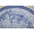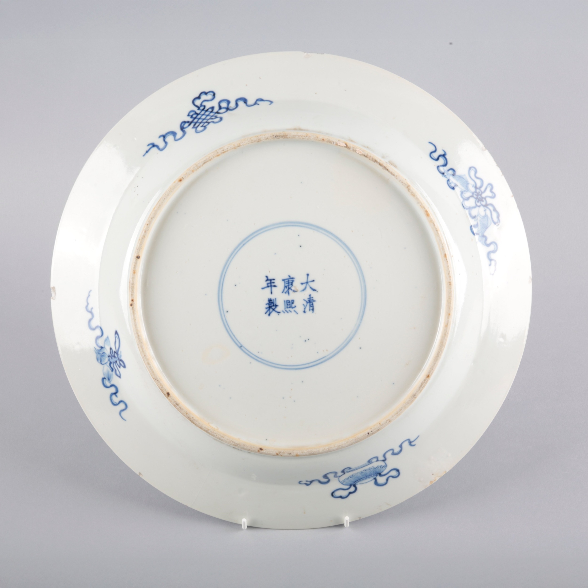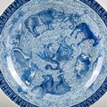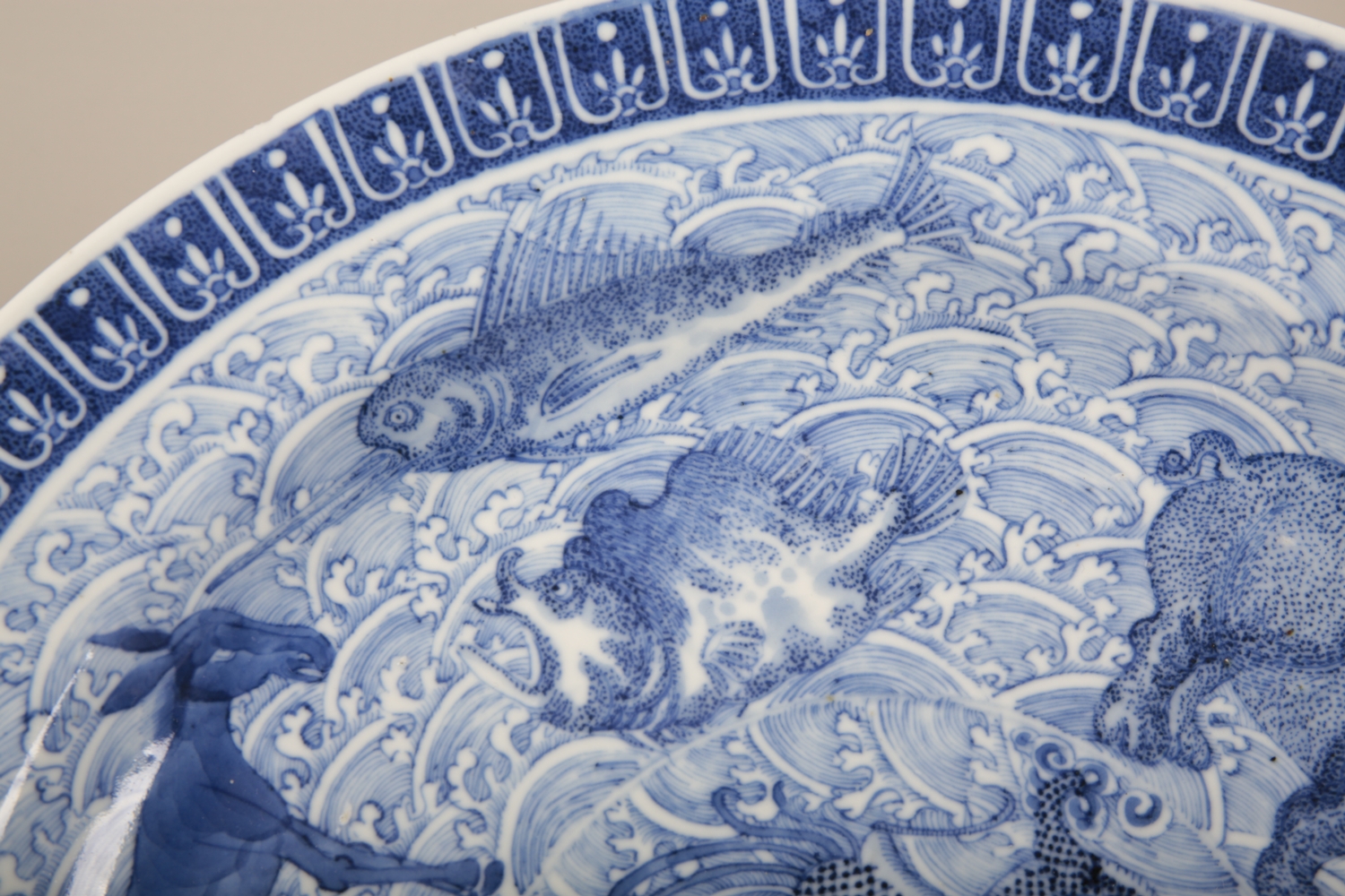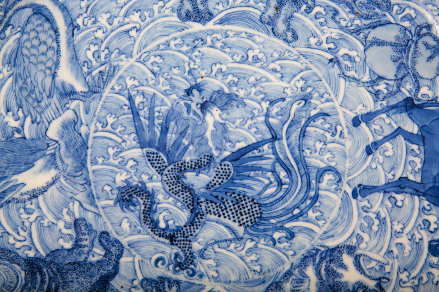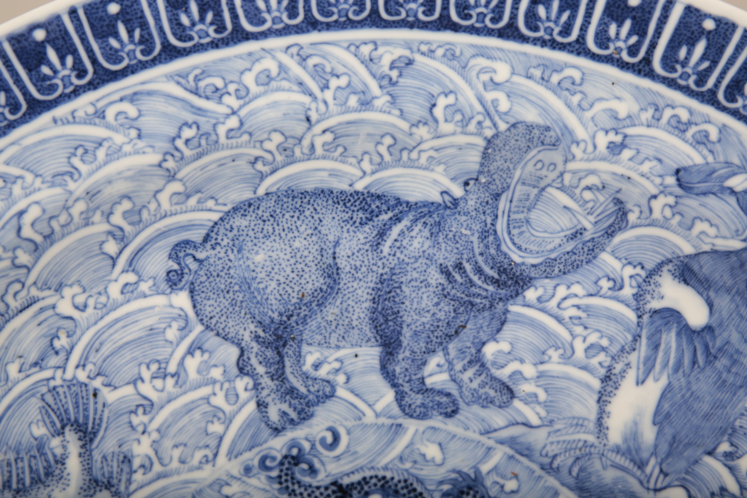 bearing a six character Kangxi mark to the base, likely early 19th century, decorated with a highly unusual array of animals and mythical creatures against a ground of the celestial sea, a phoenix with a dragon's head to the centre, amongst others a rhino, a hippo, a swordfish and a great auk, the underside decorated with Buddhist symbols, 36.5cm diameter