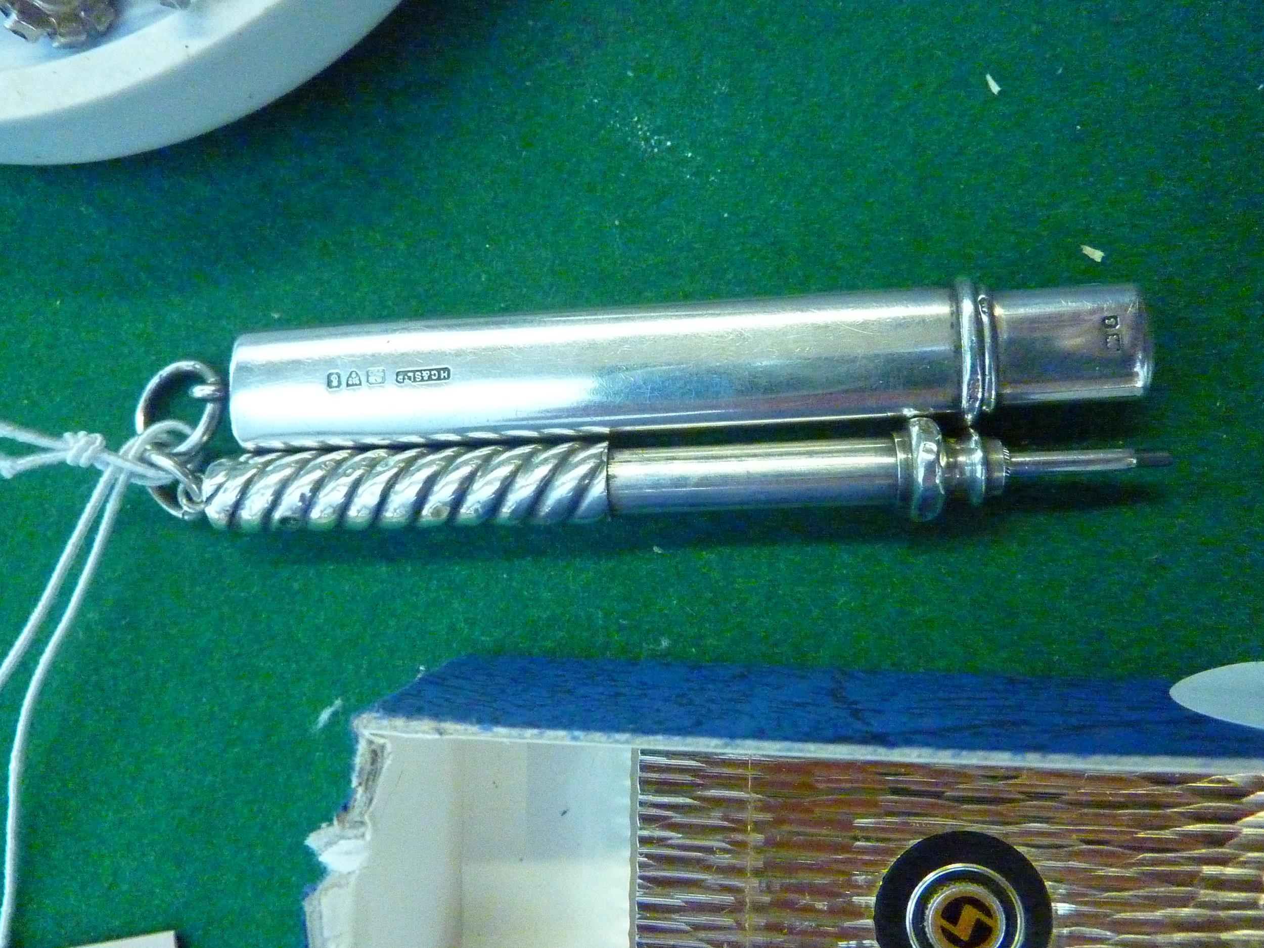 A silver propelling pencil and a silver flat pencil holder