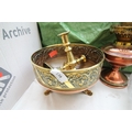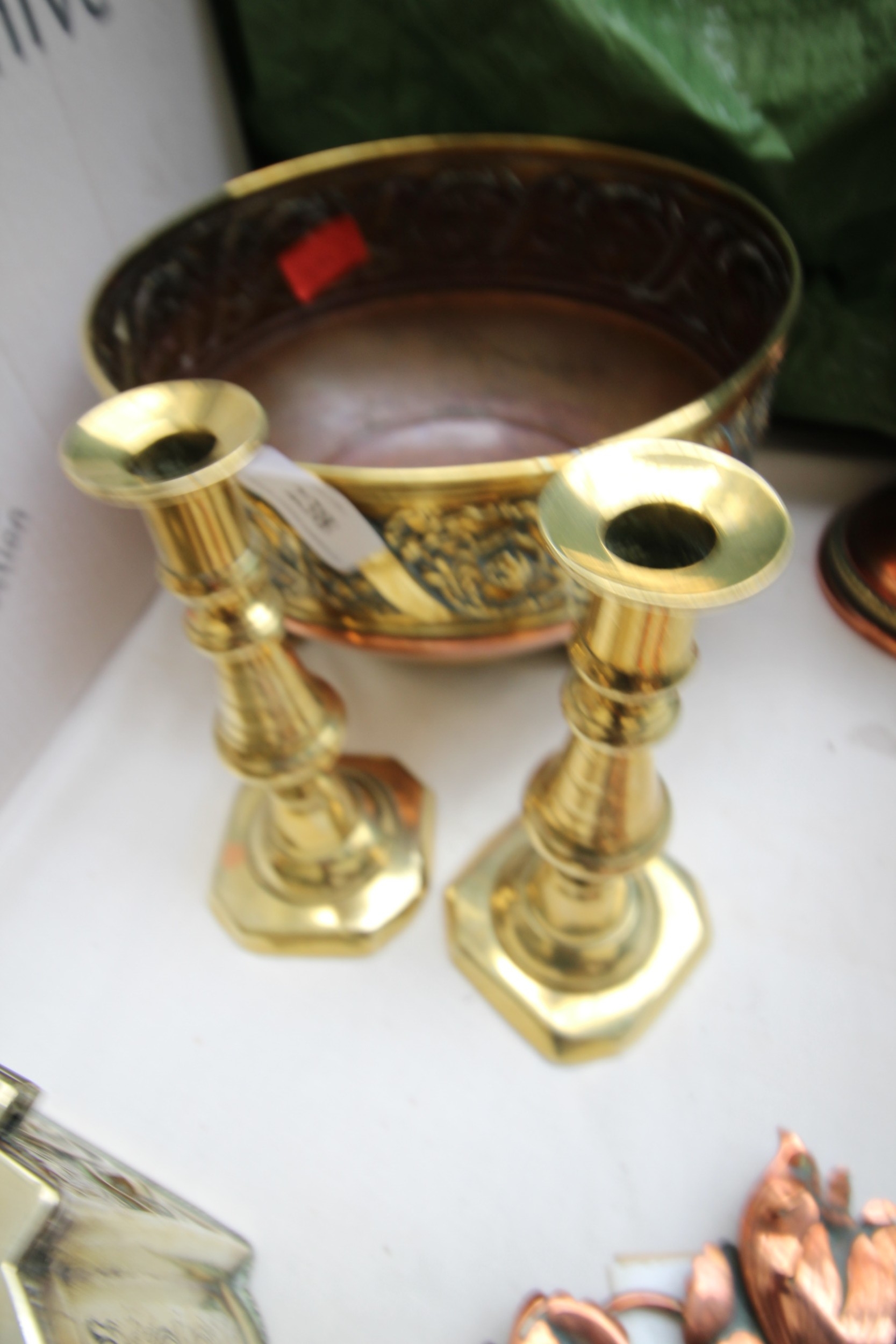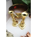 Large brass and copper bowl on legs, together with early push-up candlesticks