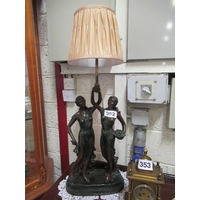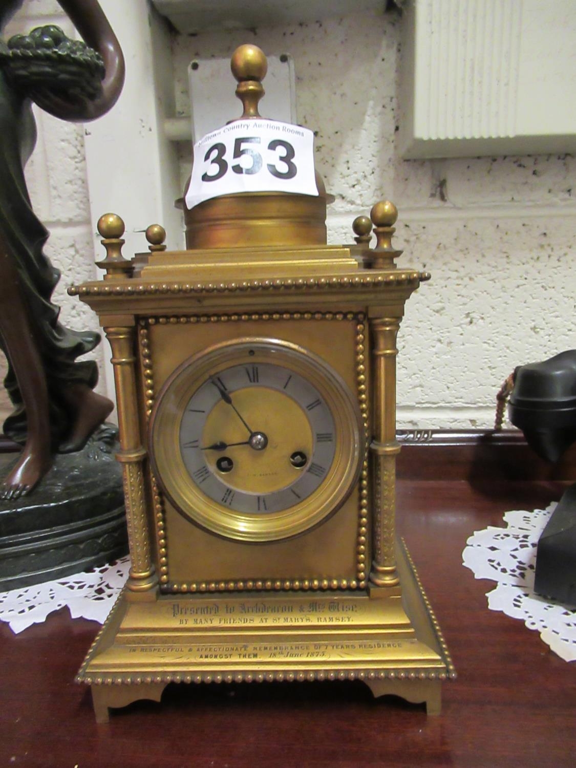 Brass mantle clock with key and pendulum. H:30cm x 18cm x 14cm.