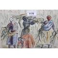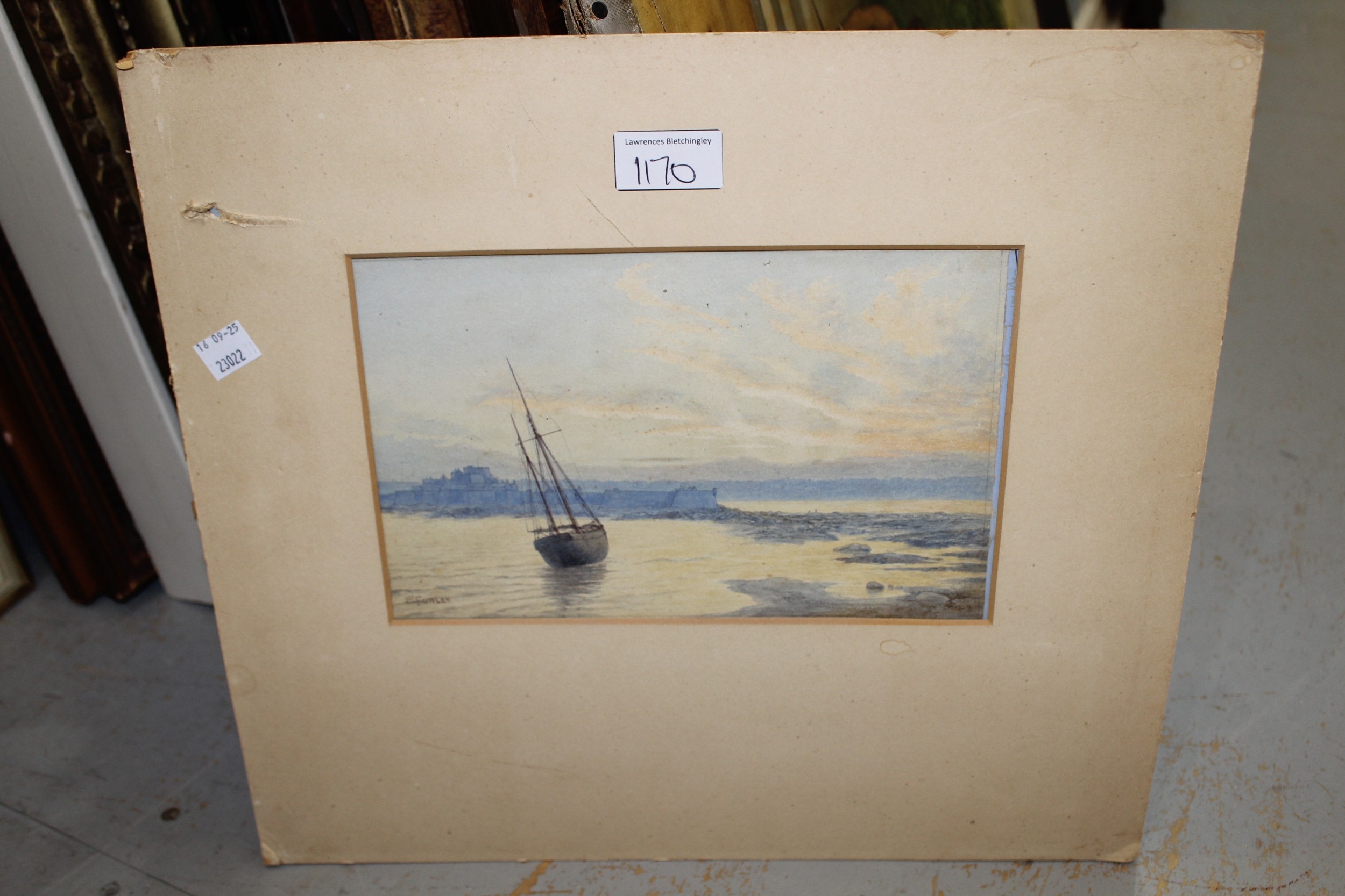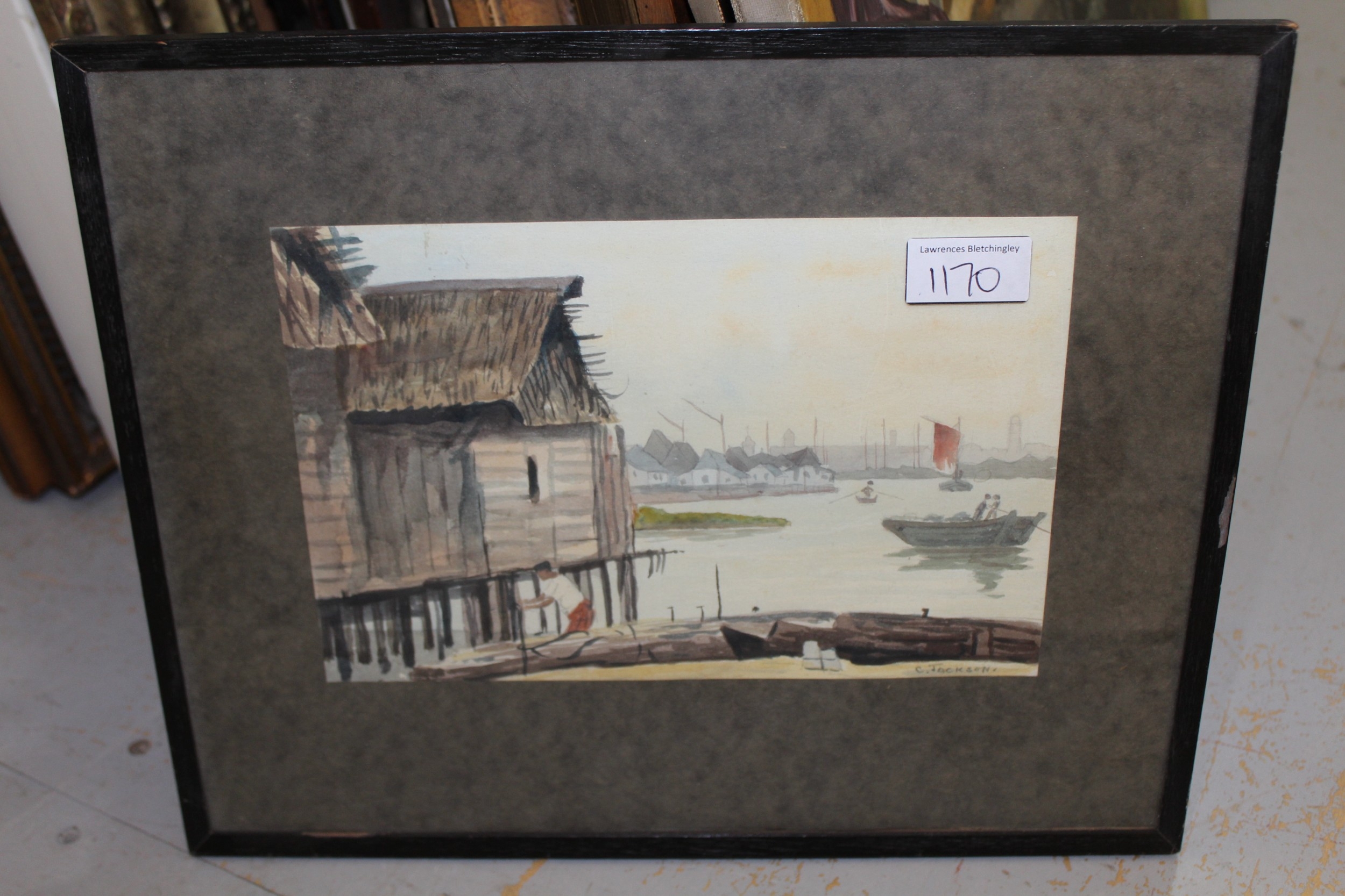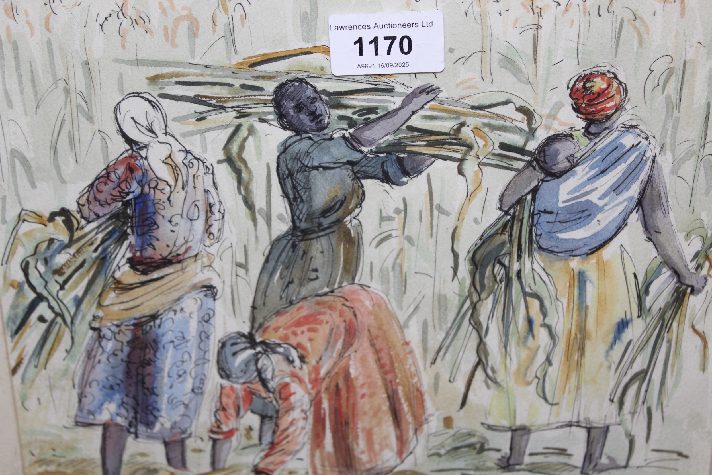 Lindsey Ford, watercolour, figures working in sugarcane, 22 x 26cm, together with another watercolour, river scene with boats and figures, signed C. Jackson, 16 x 24cm, framed and an unframed watercolour, beached sailing boat, signed E. Furley, 15 x 24cm