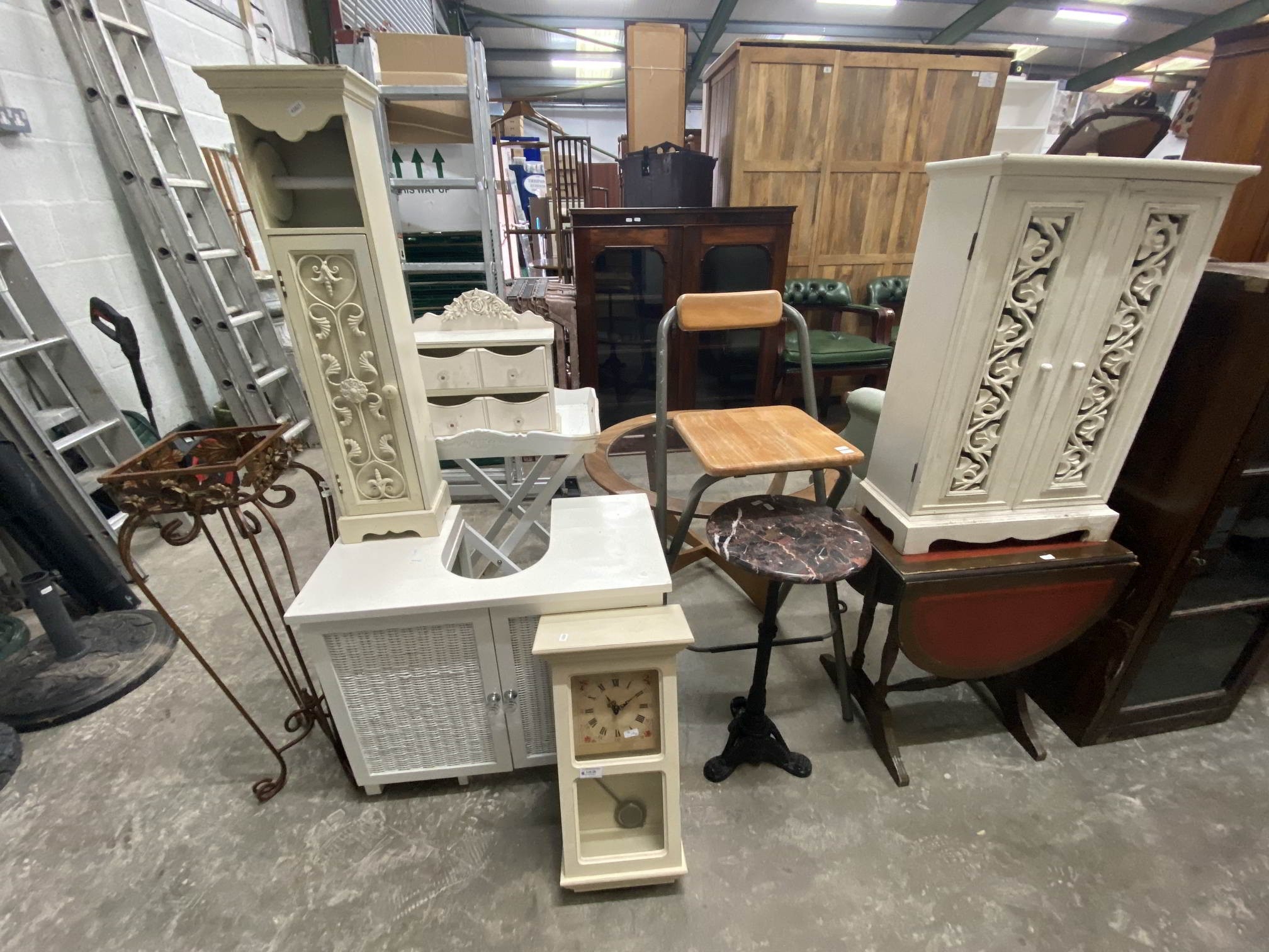 Shabby chic butlers table 70H 57W 40D, Laura Ashley wall clock etc