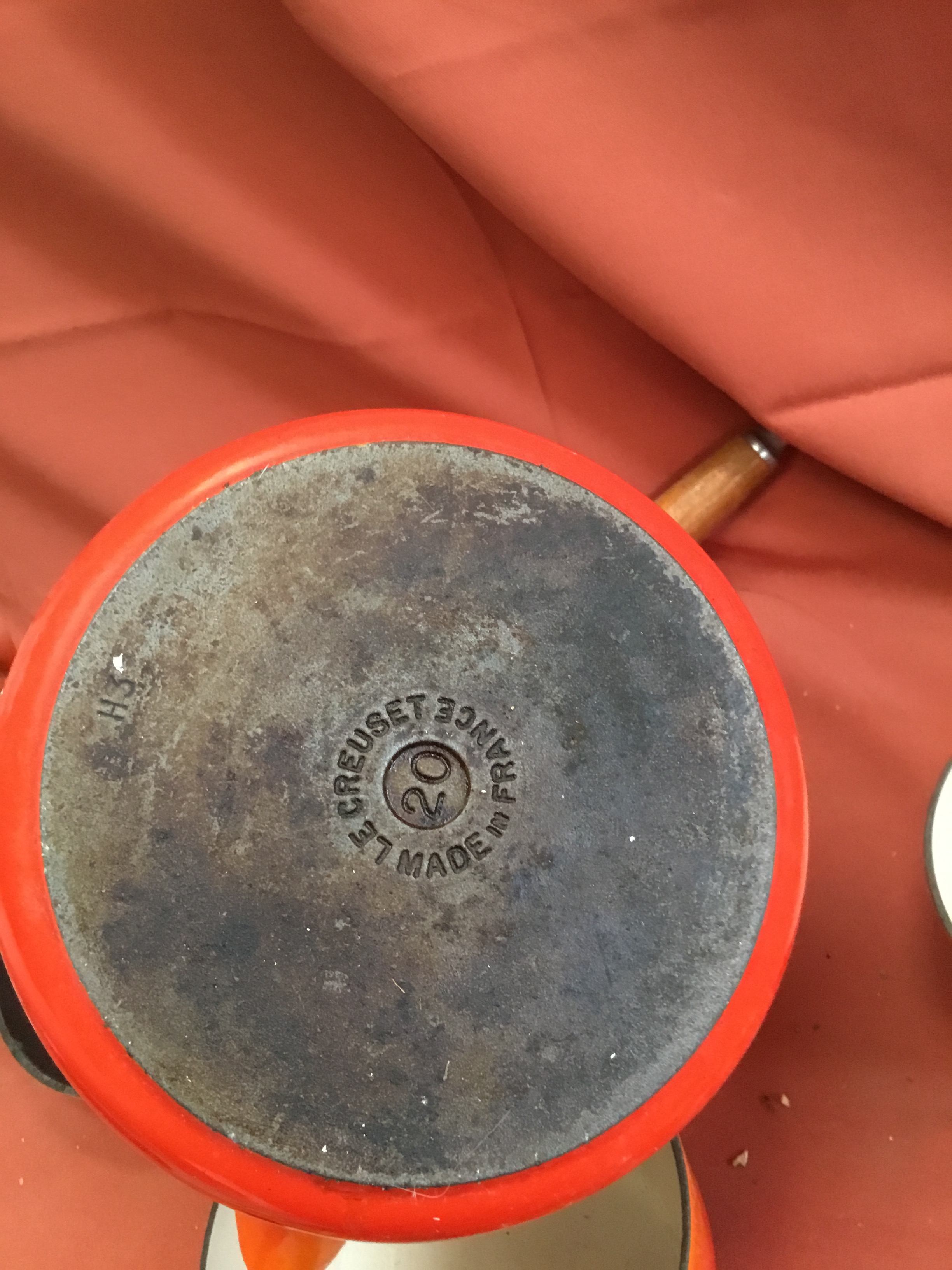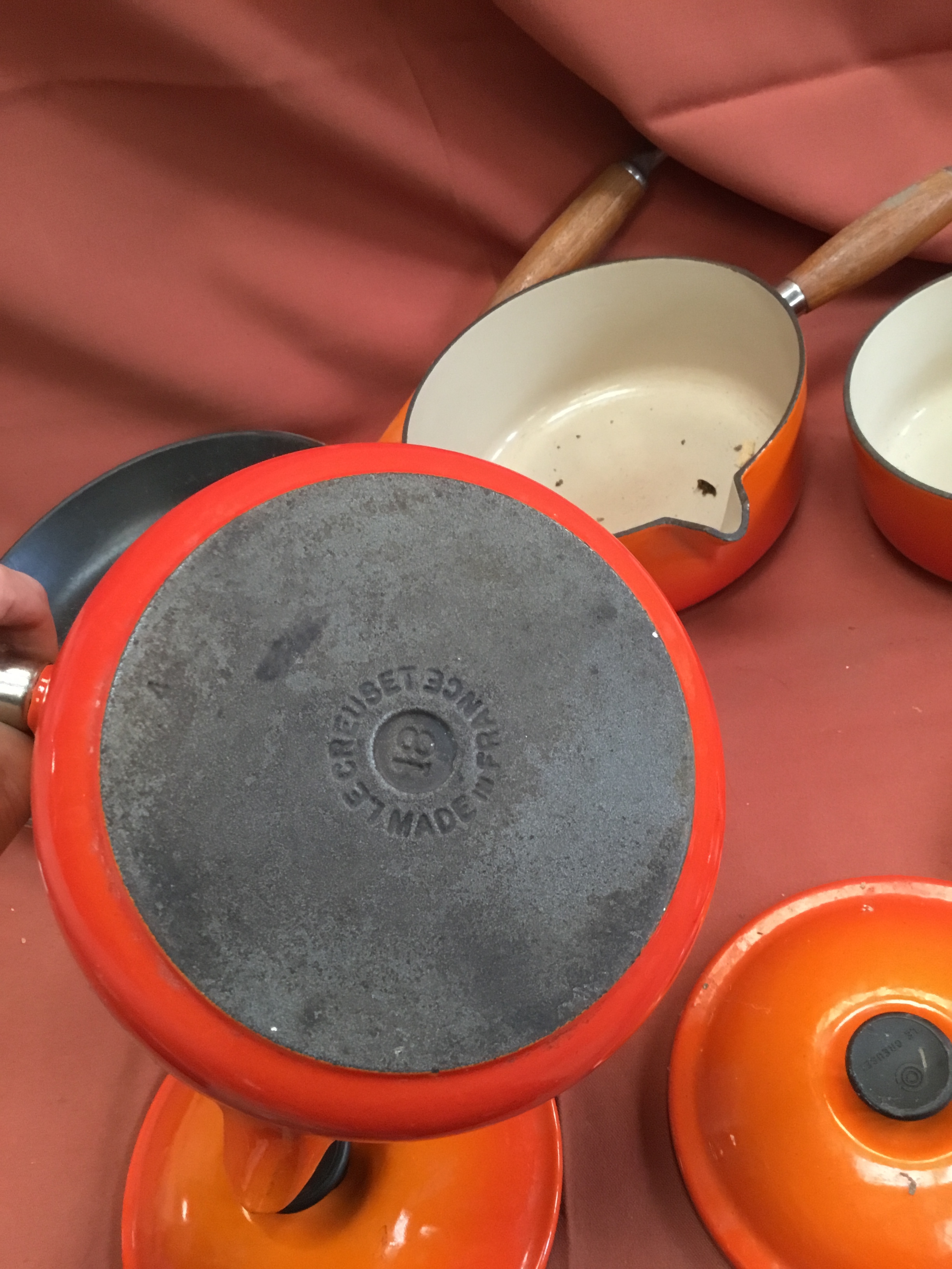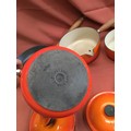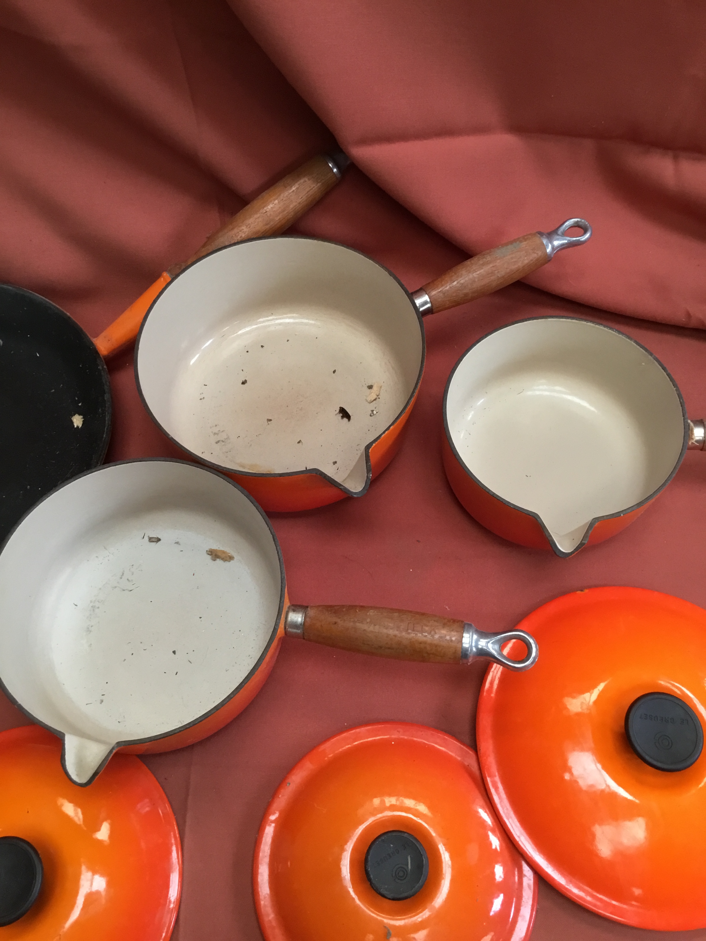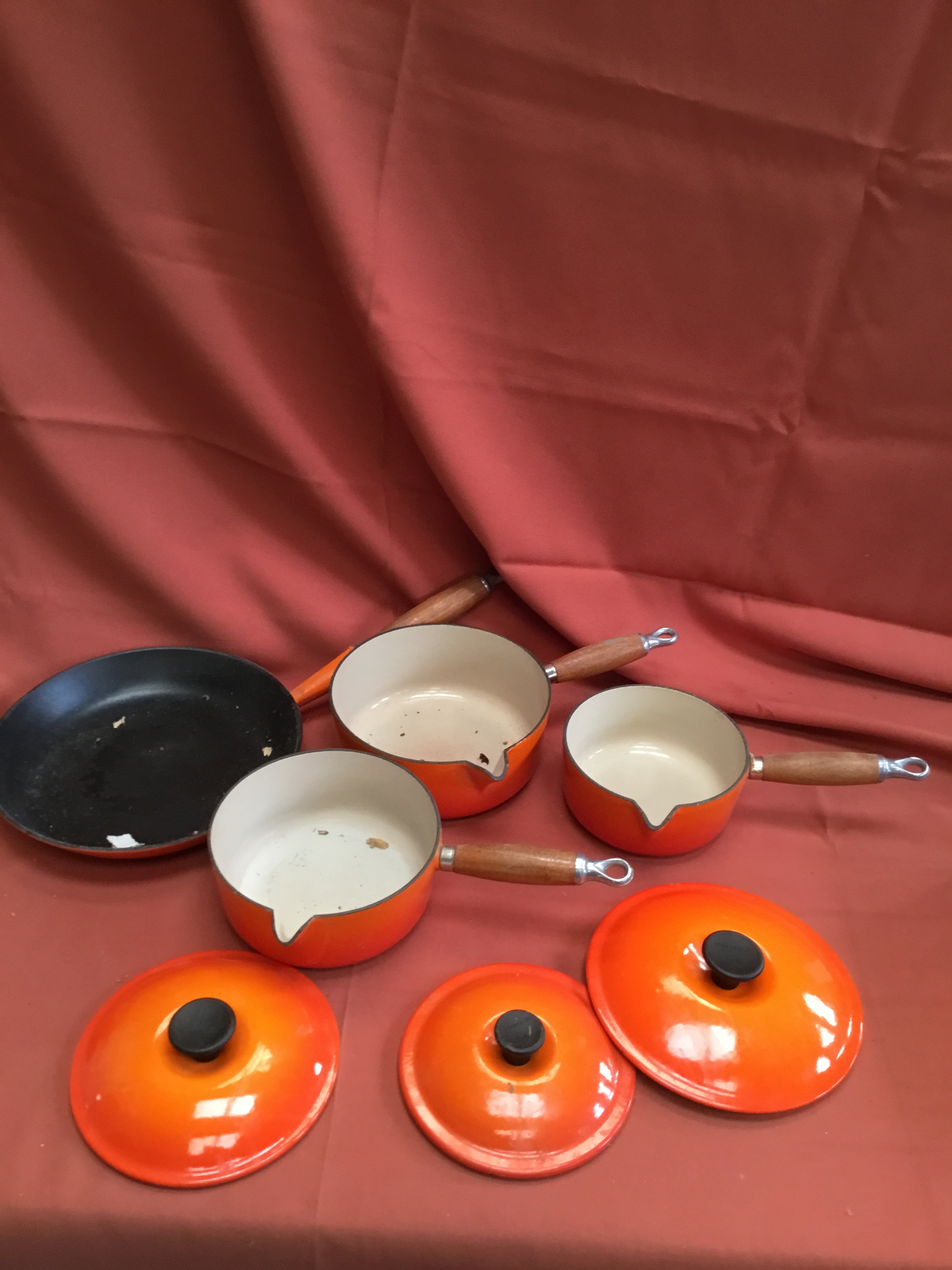 Le Creuset burnt orange cast iron set of pan inc number 16, 18 & 20 saucepans & frying pan 26