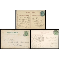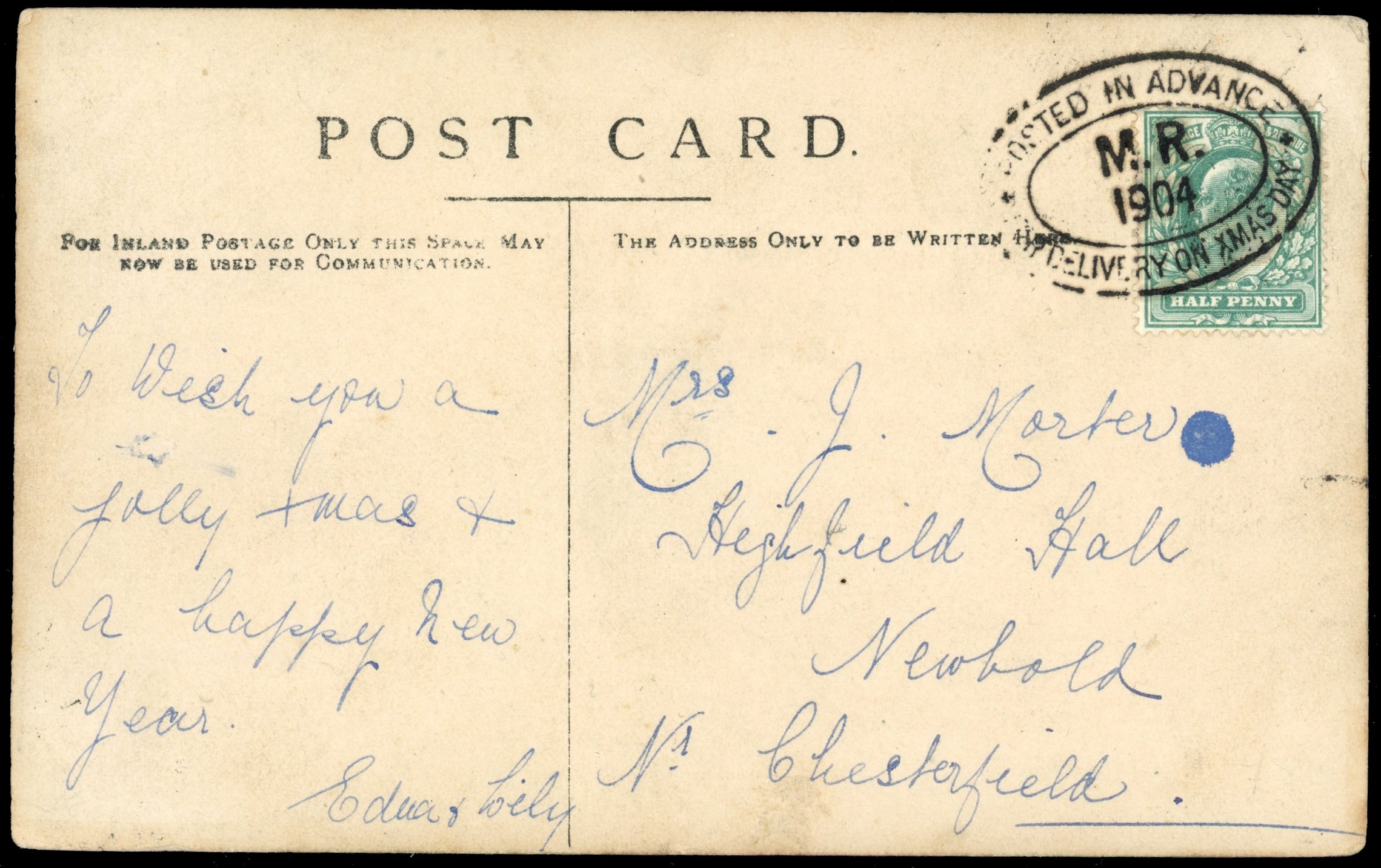 1903-08 selection of six picture postcards all with â??Posted in Advance for Christmasâ?? cancels comprising Double-ring oval. type 2, ½d blue-green 1903, 1904, ½d yellow-green 1904, 1905 and Columbia machine, type 5, ½d yellow-green 1907, 1908; also cover with Liverpool, type 4, 1906. Fair to