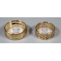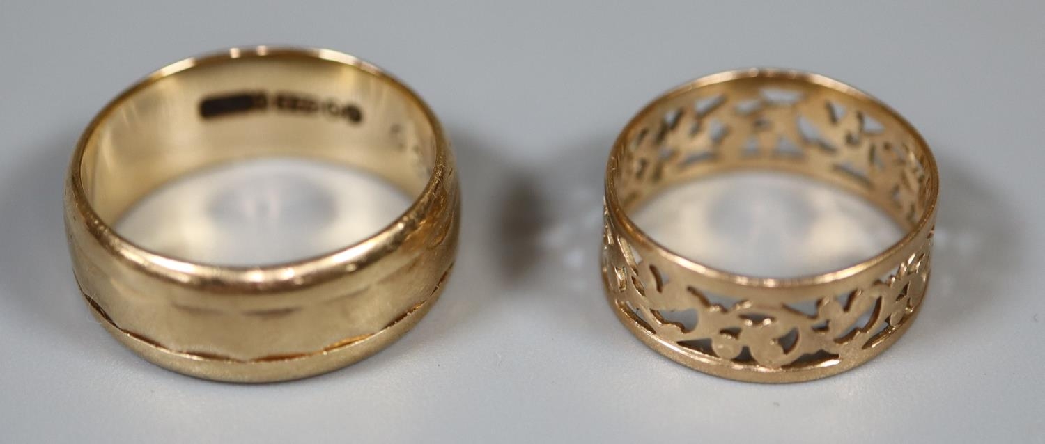 A 9ct gold ring and a 14ct pierced gold ring. Ring size K and G. Approx weight in total 5.4 grams.
