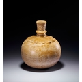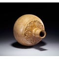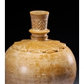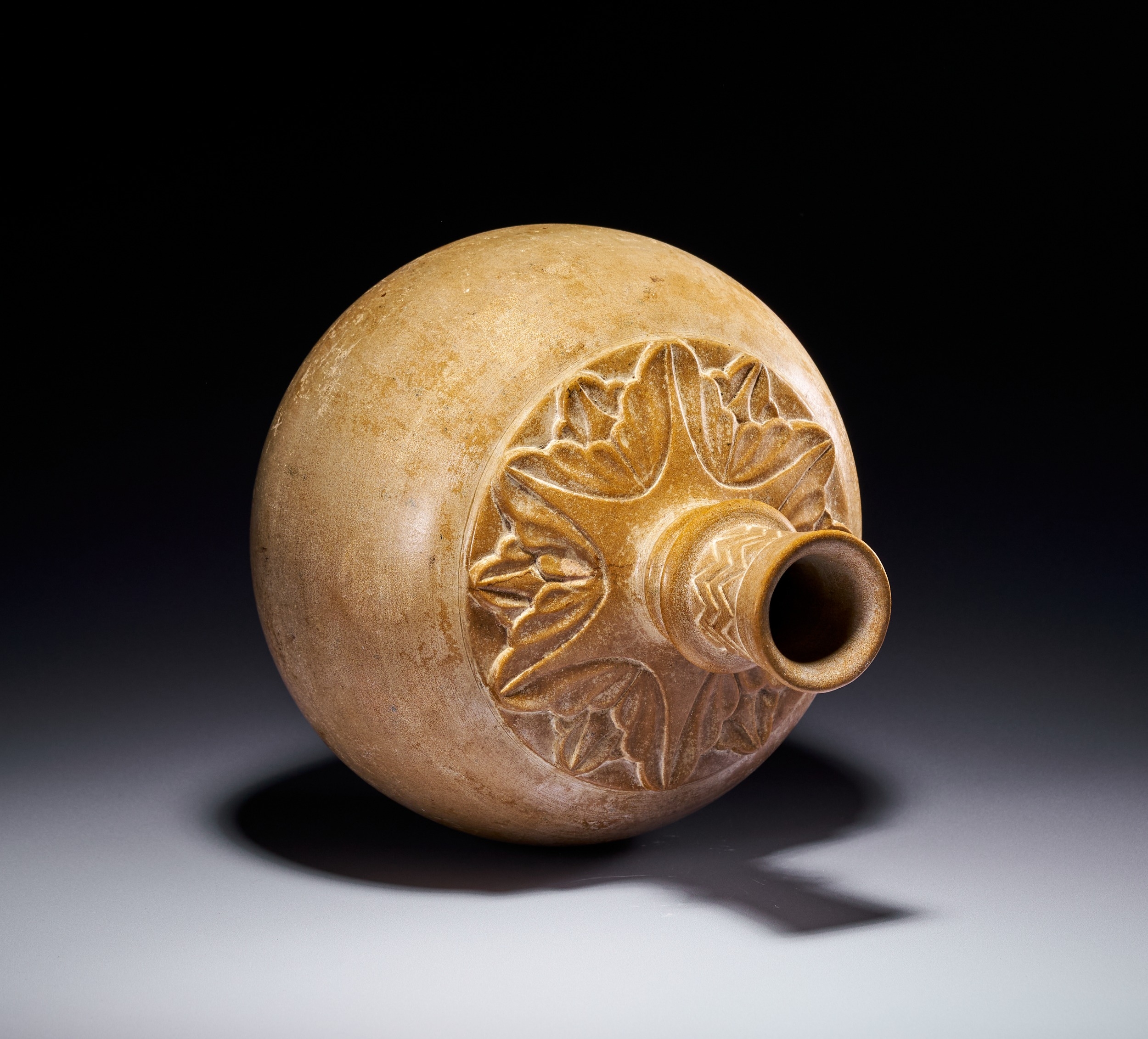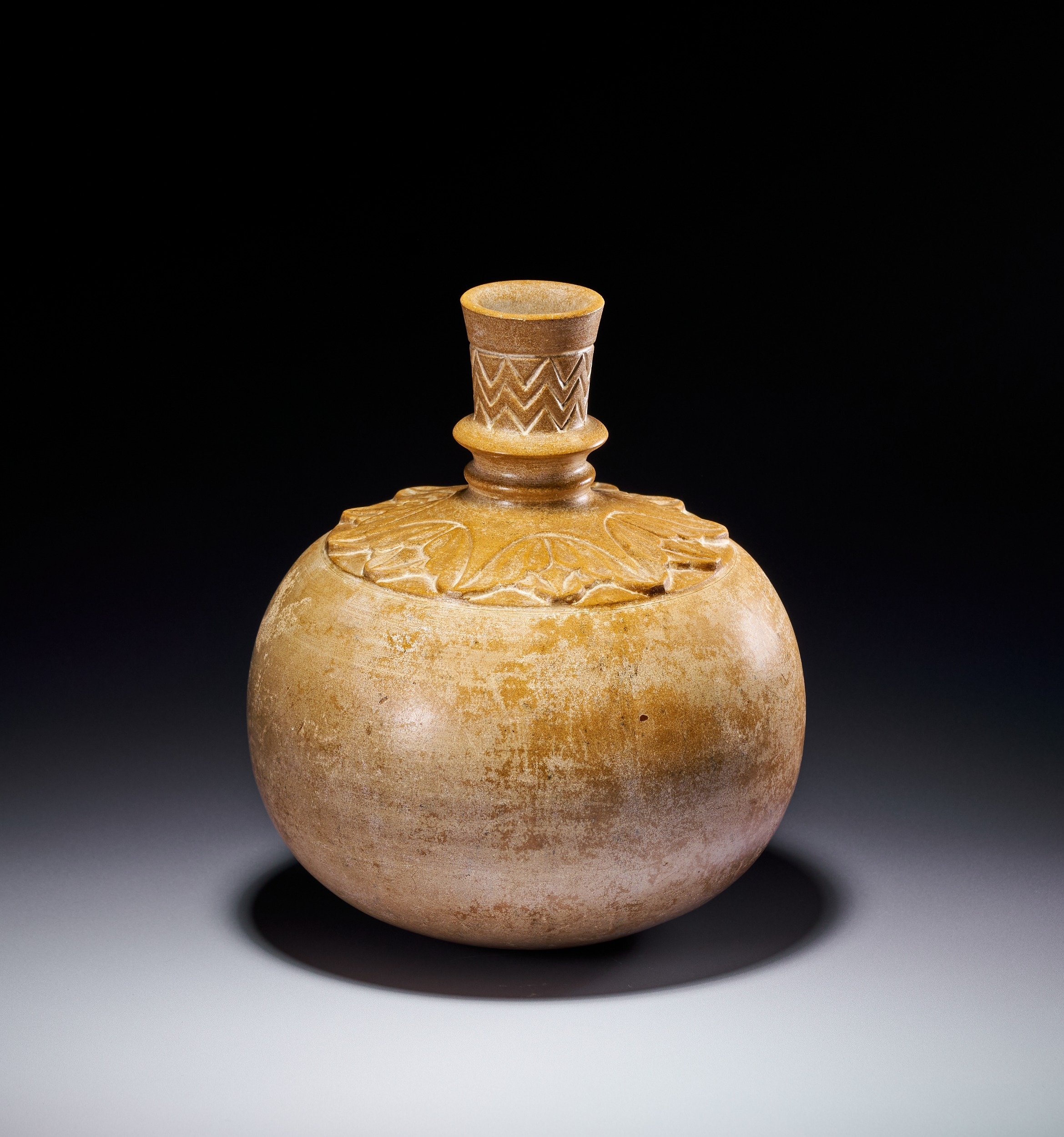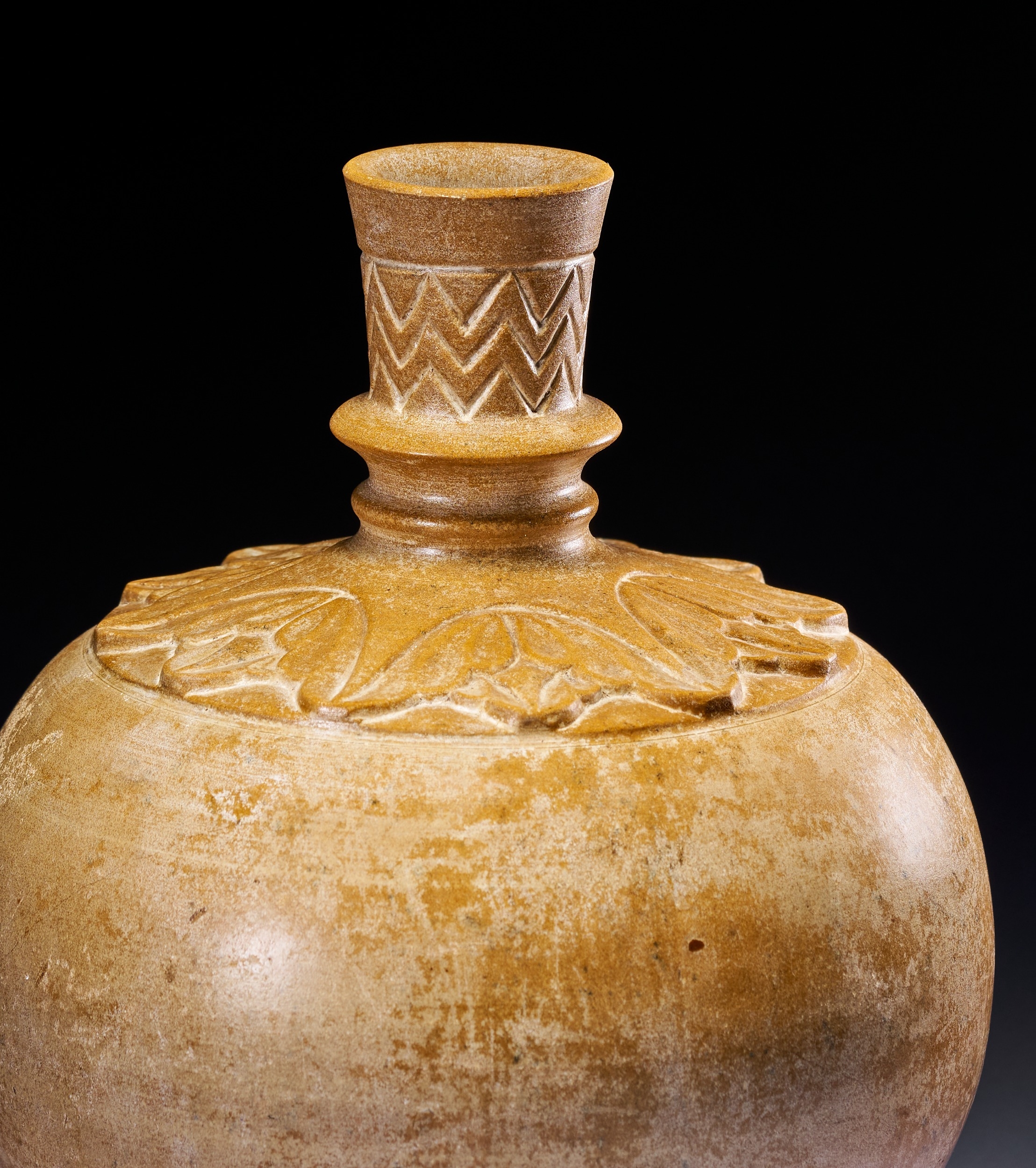 The form features a globular body with a rounded base and a slender, tapering neck. The neck is accented with a central knop and terminates in a flared rim. Decorative elements include a wide band of deeply carved foliate or lotus-leaf motifs encircling the shoulder. The upper portion of the neck is decorated with an incised zigzag or chevron pattern.
