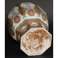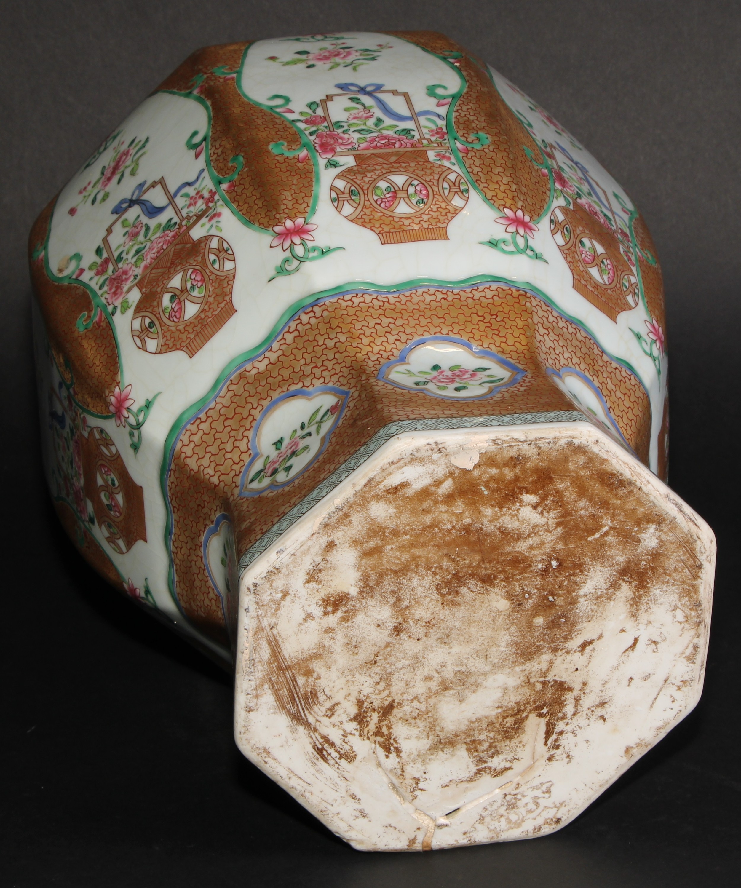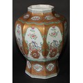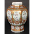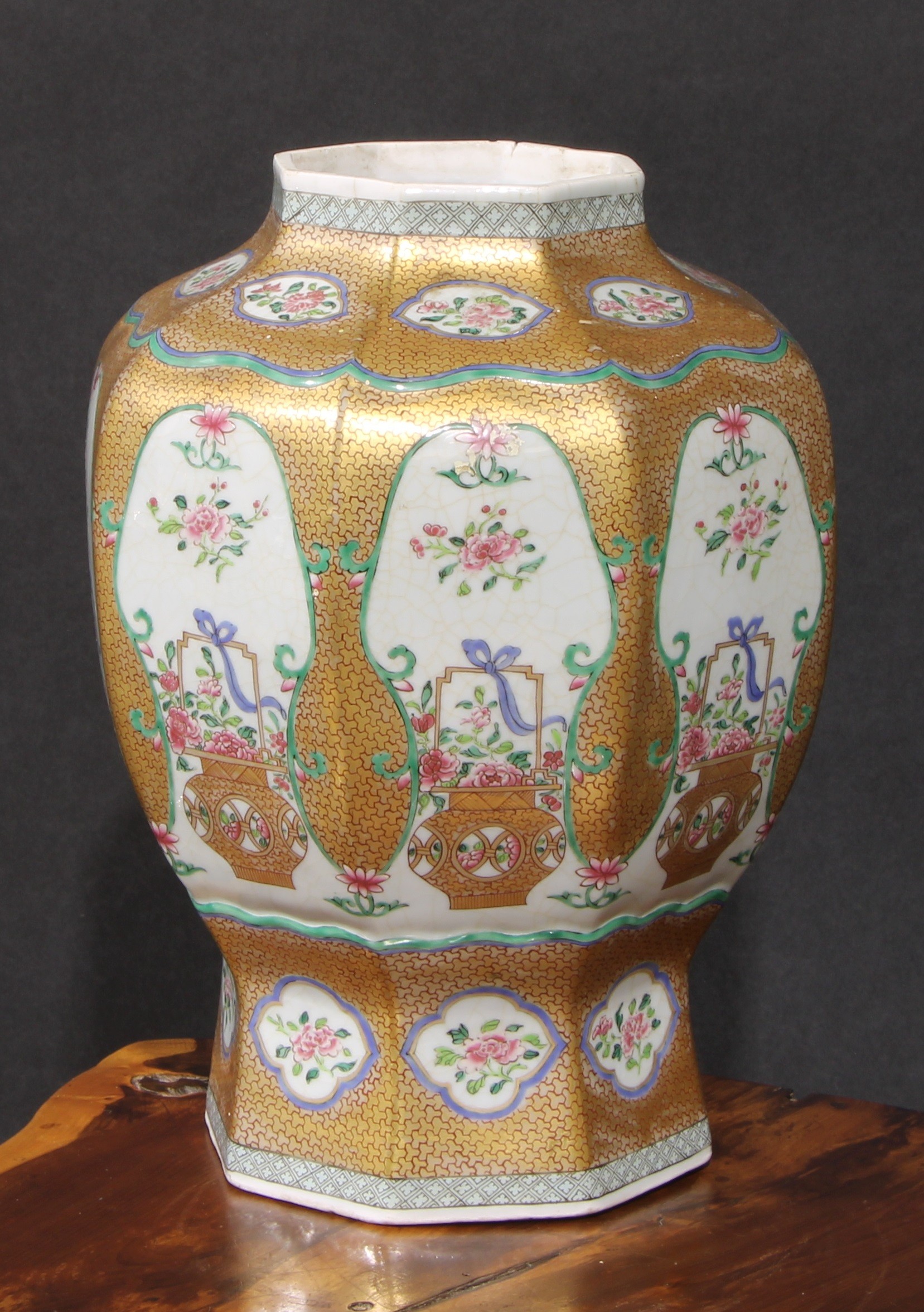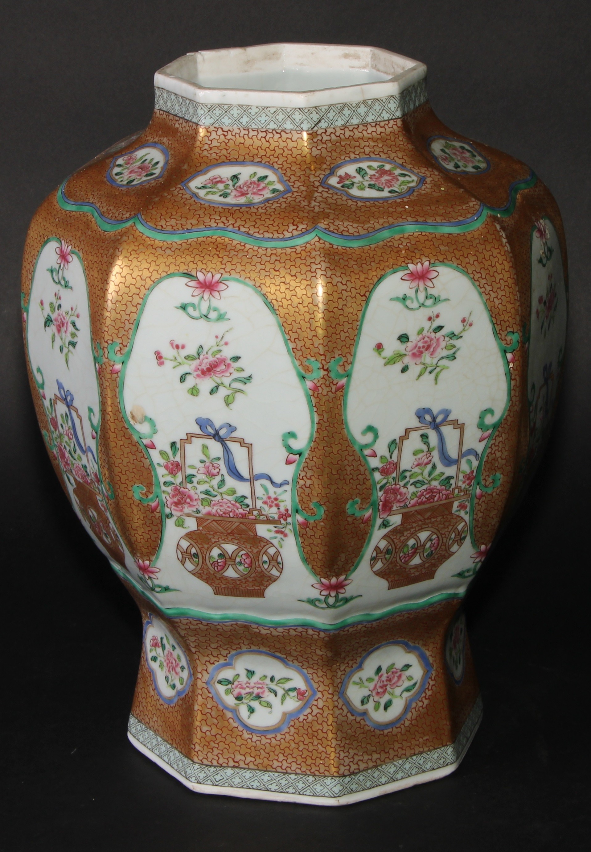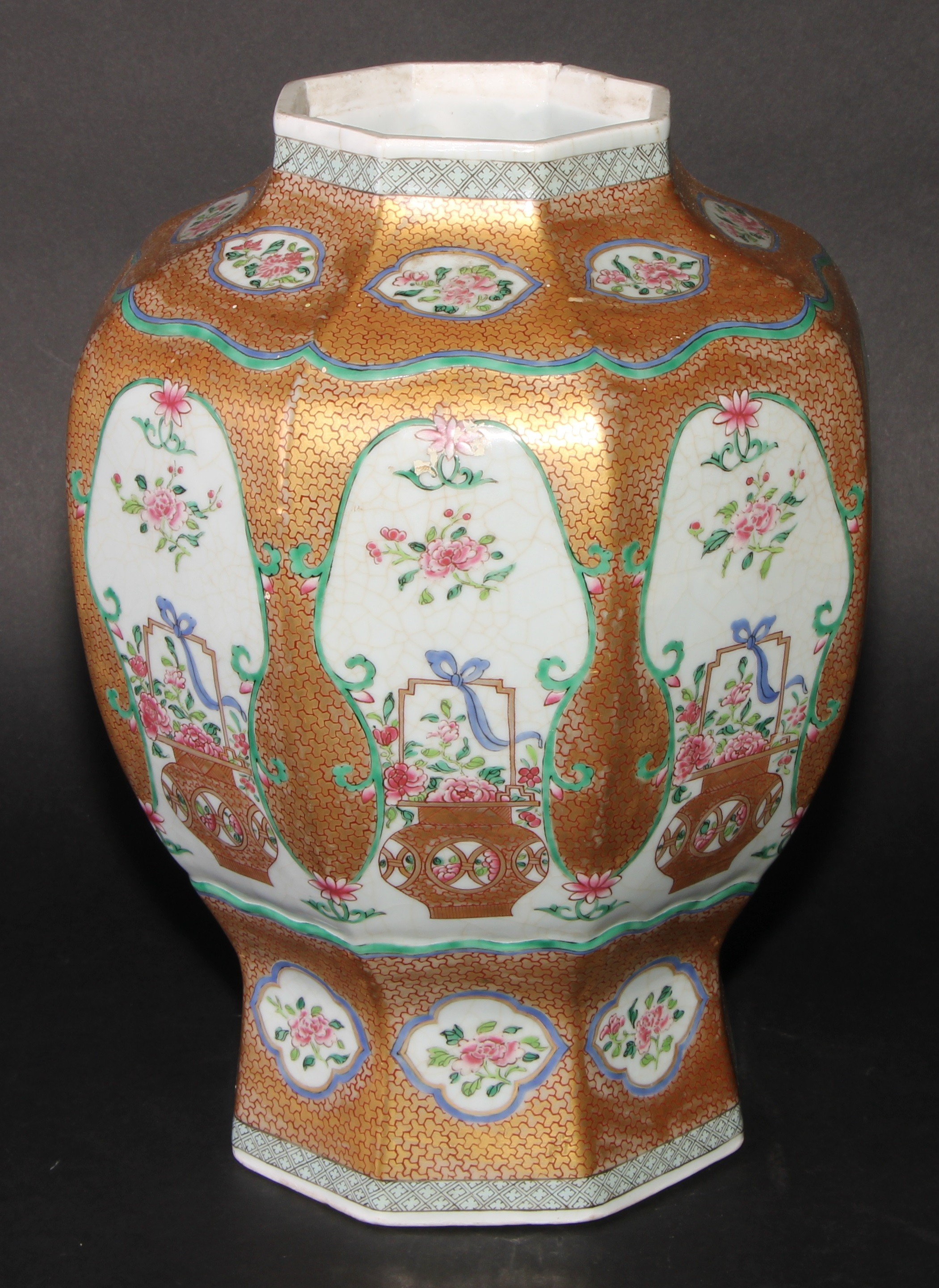 A 19th century Chinese famille rose octagonal baluster vase, painted with baskets of flowers, gilt scale ground, 31cm high