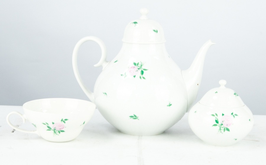 TWENTY THREE PIECE ROSENTHAL FINE PORCELAIN TEA SERVICE FOR SIX PERSONS, printed with pink roses on a moulded ground, comprising: