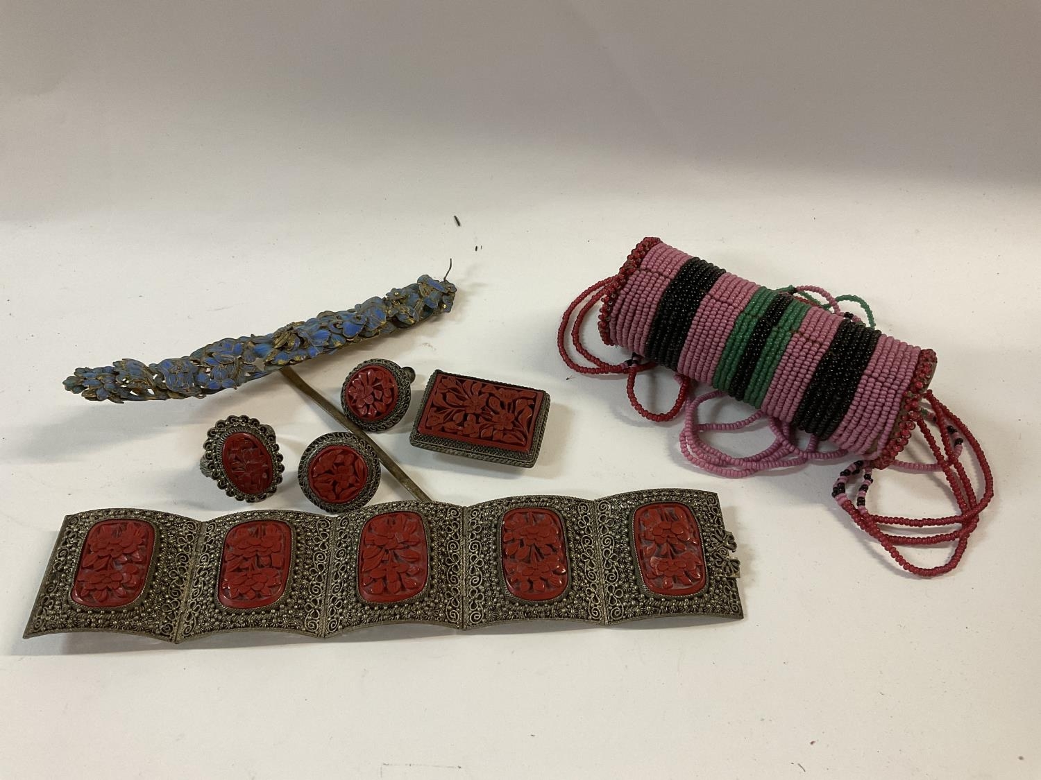 A Chinese carved cinnabar lacquer and filigree jewellery suite together with an enamelled hair pin and a beaded item.