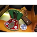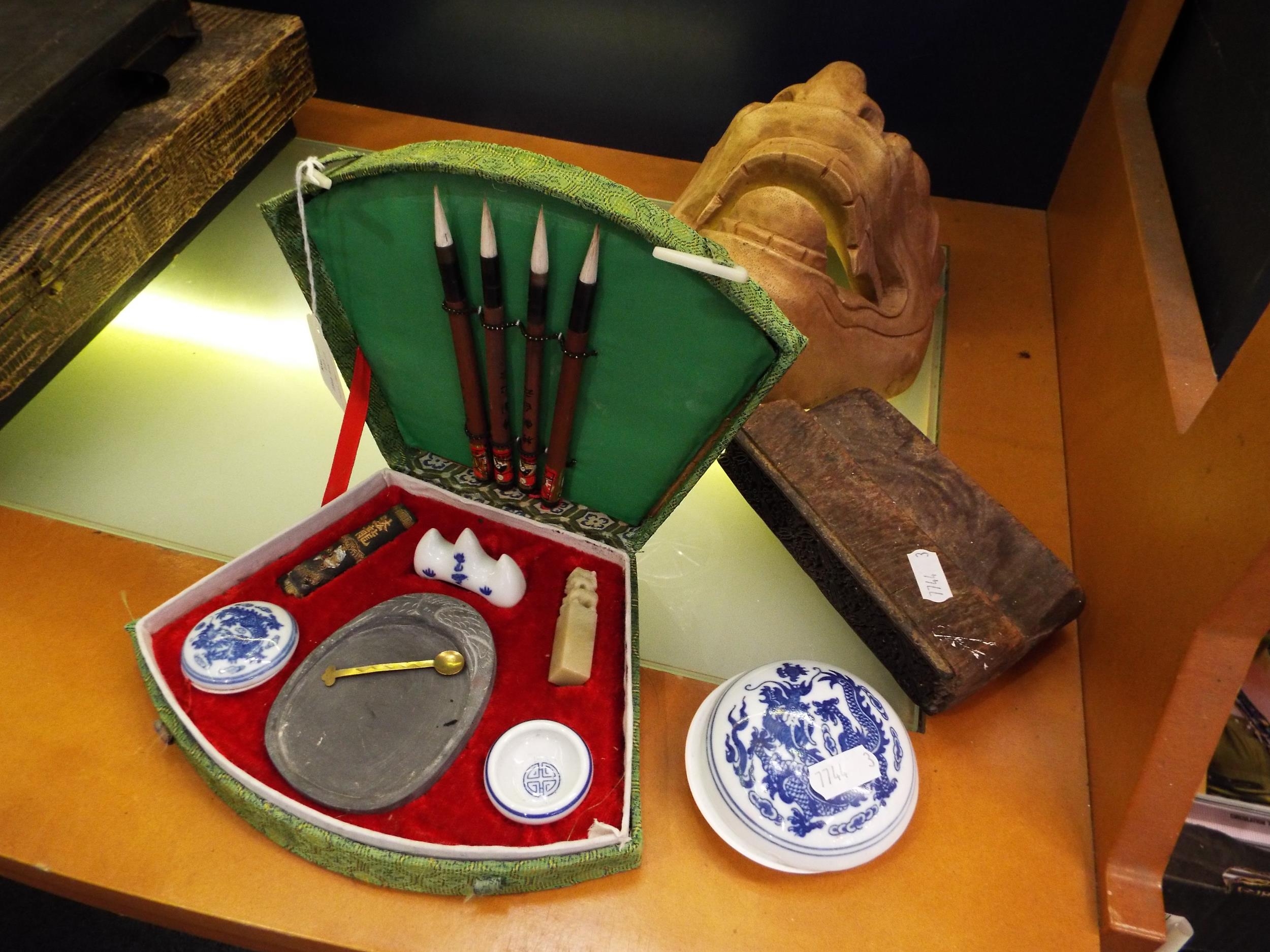 An Oriental carved wooden mask together with a wooden printing block and a Chinese seal set