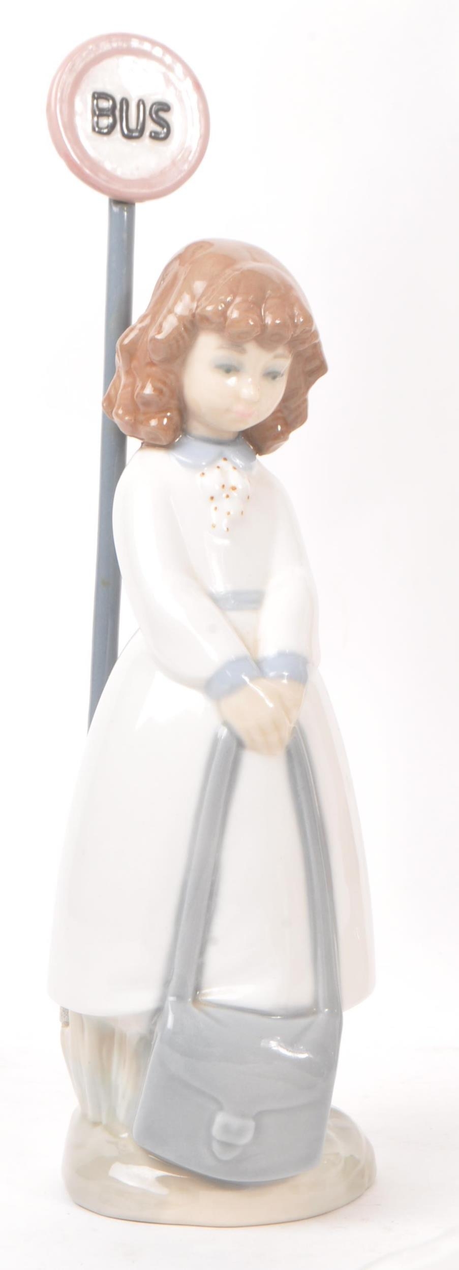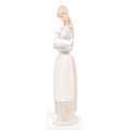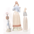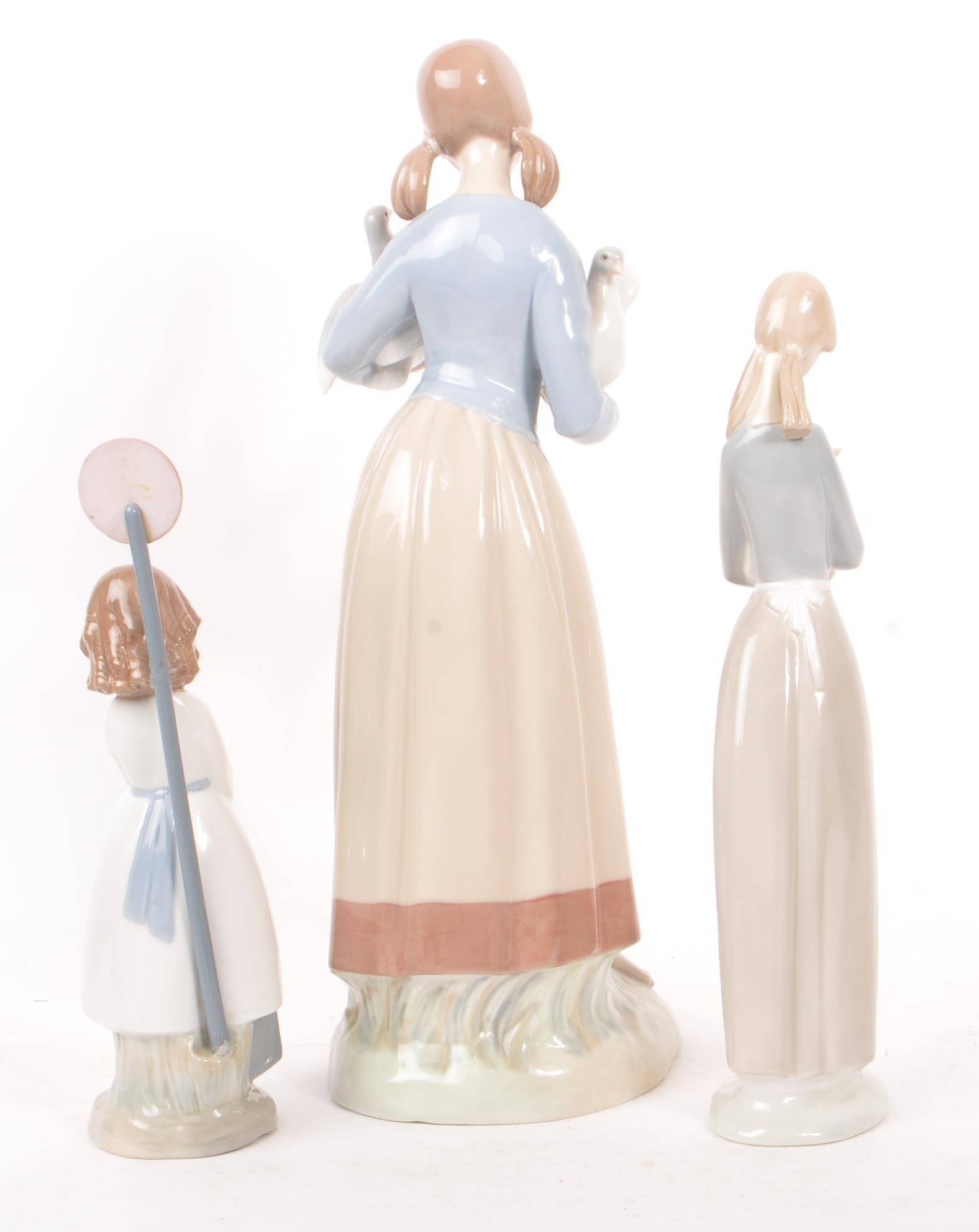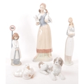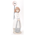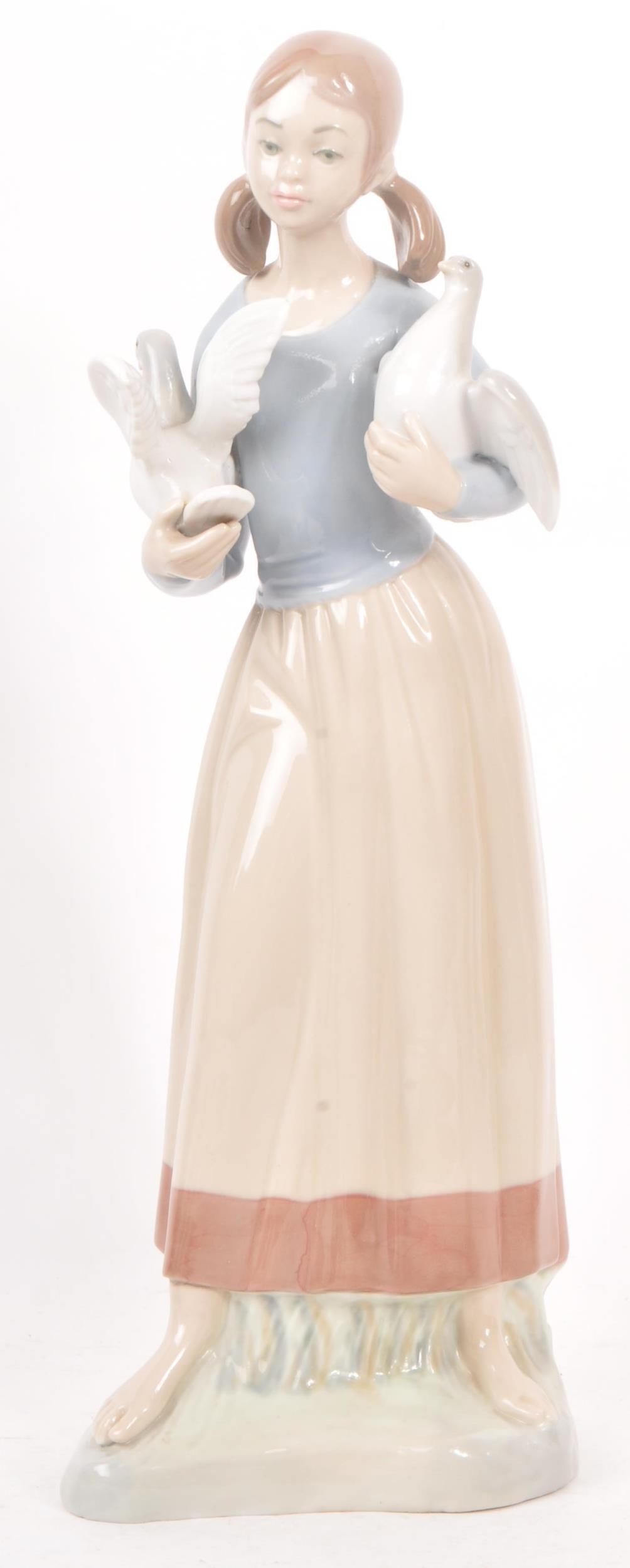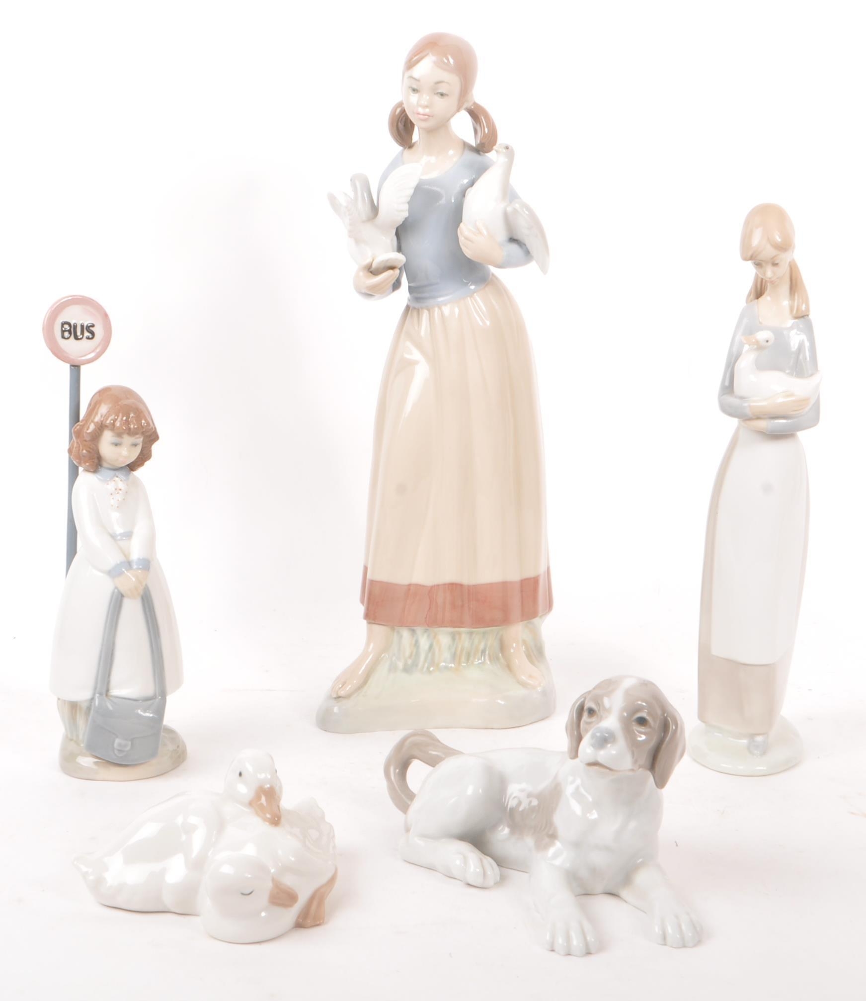 Nao by Lladro - A collection of five 20th Century porcelain china figurines to include Nao by Lladro comprising of girl holding duck, dog and two ducks sleeping. Together with a Zaphir figure of young girl by bus stop and another large figurine in the style of Lladro of girl holding two doves. Largest measuring approx. 34cm tall.