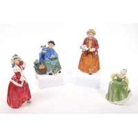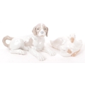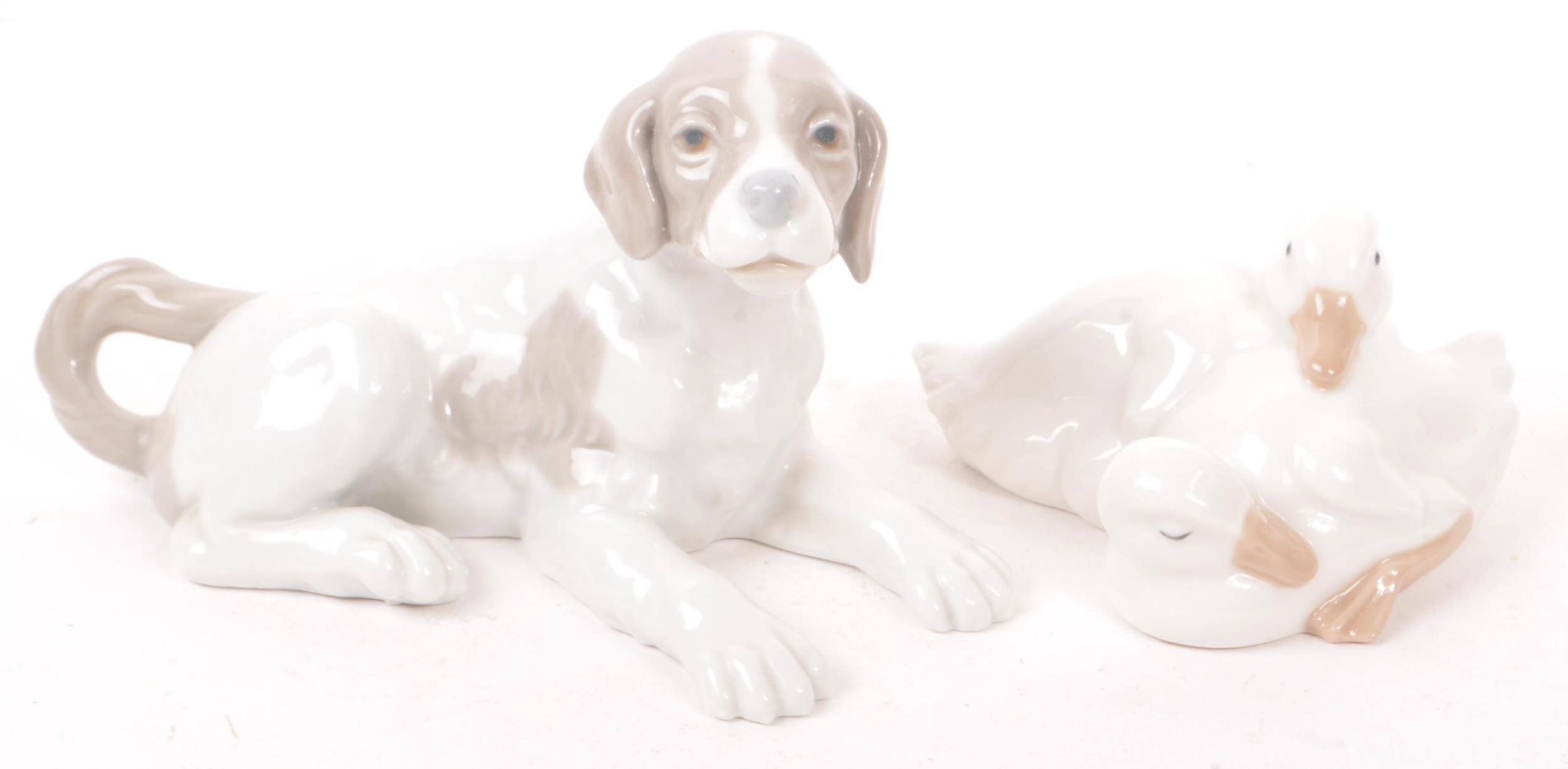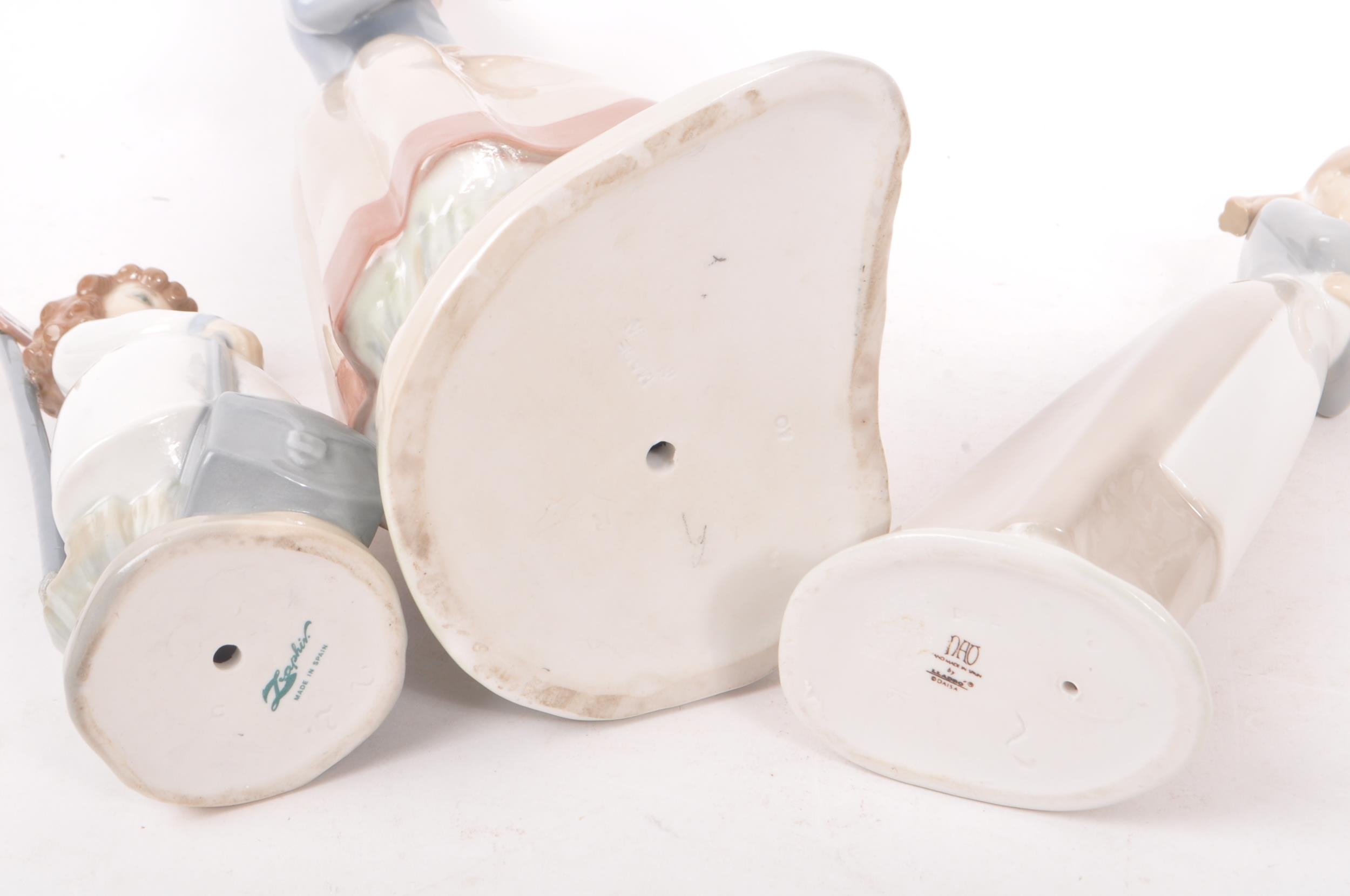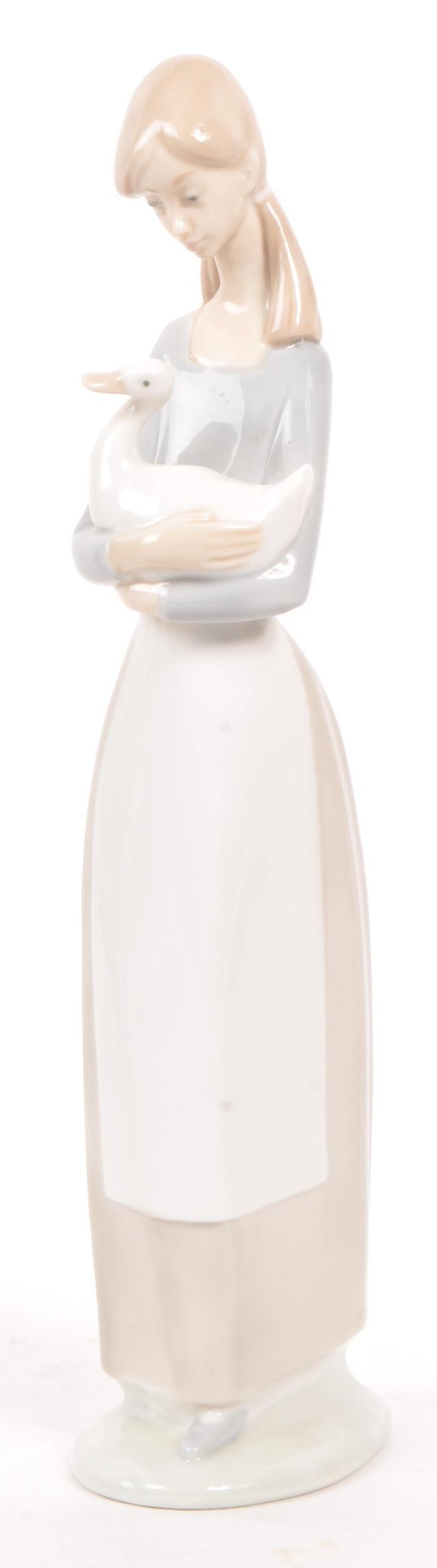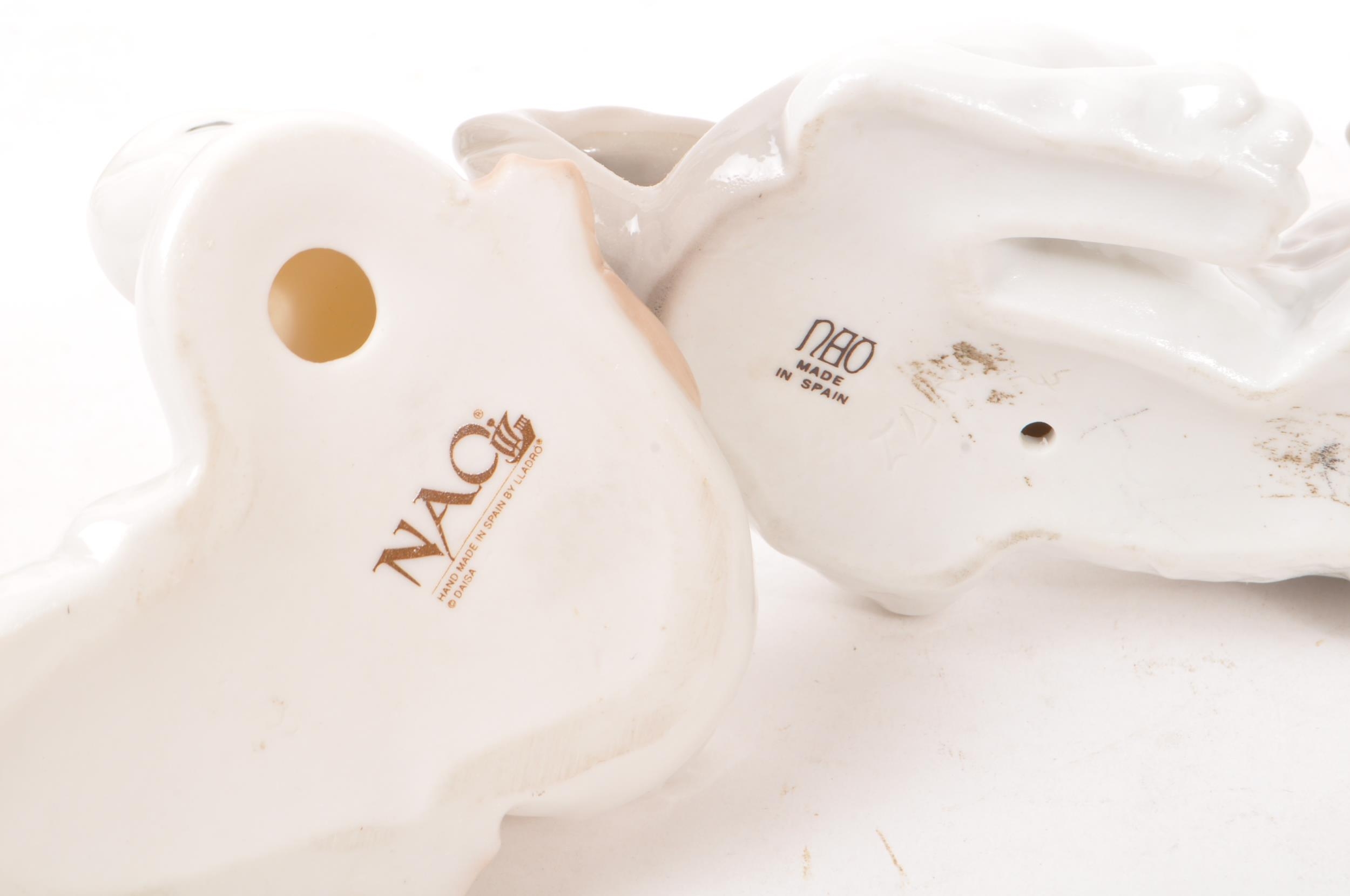 Nao by Lladro - A collection of five 20th Century porcelain china figurines to include Nao by Lladro comprising of girl holding duck, dog and two ducks sleeping. Together with a Zaphir figure of young girl by bus stop and another large figurine in the style of Lladro of girl holding two doves. Largest measuring approx. 34cm tall.