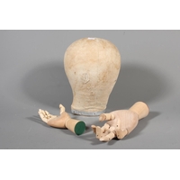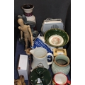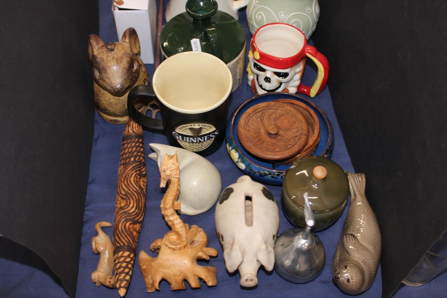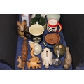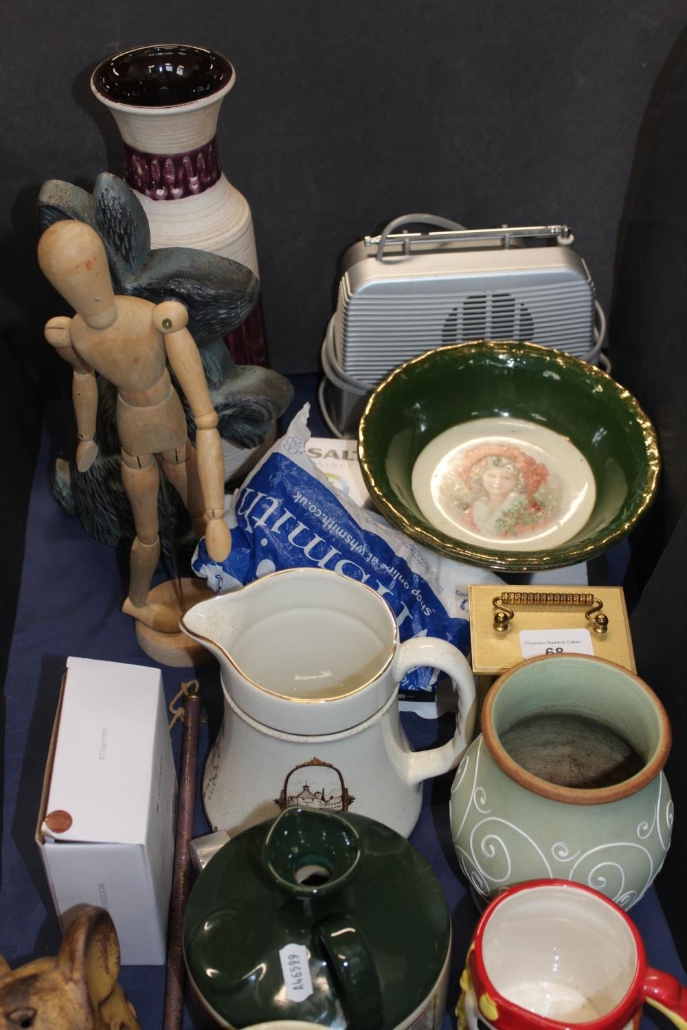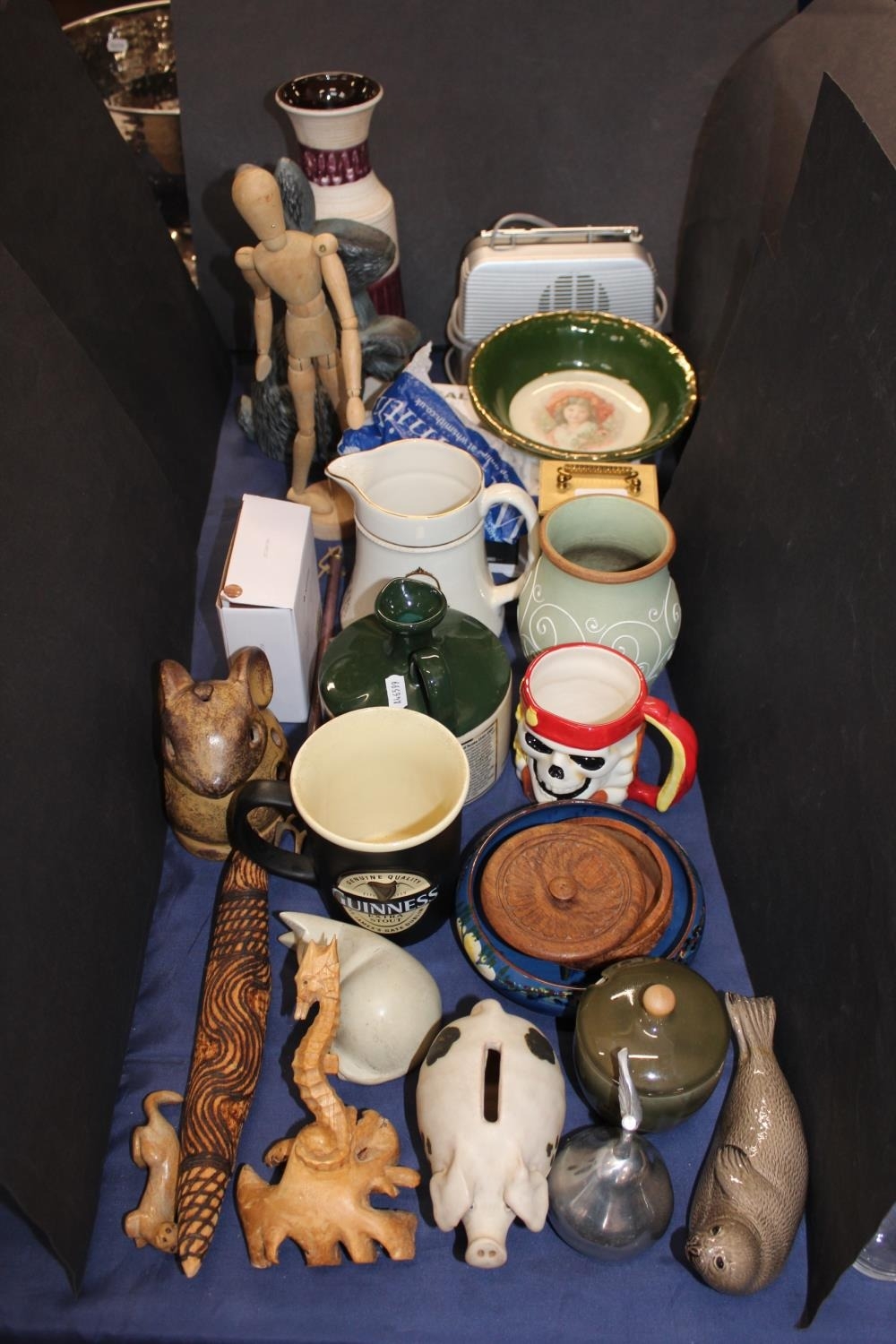 Cast metal door stop in the form of a rabbit, artist lay figure, Austrian fat lava style vase, Denby vase, Glenfiddich whisky jug, Glenfiddich Mary Queen of Scots flagon etc.