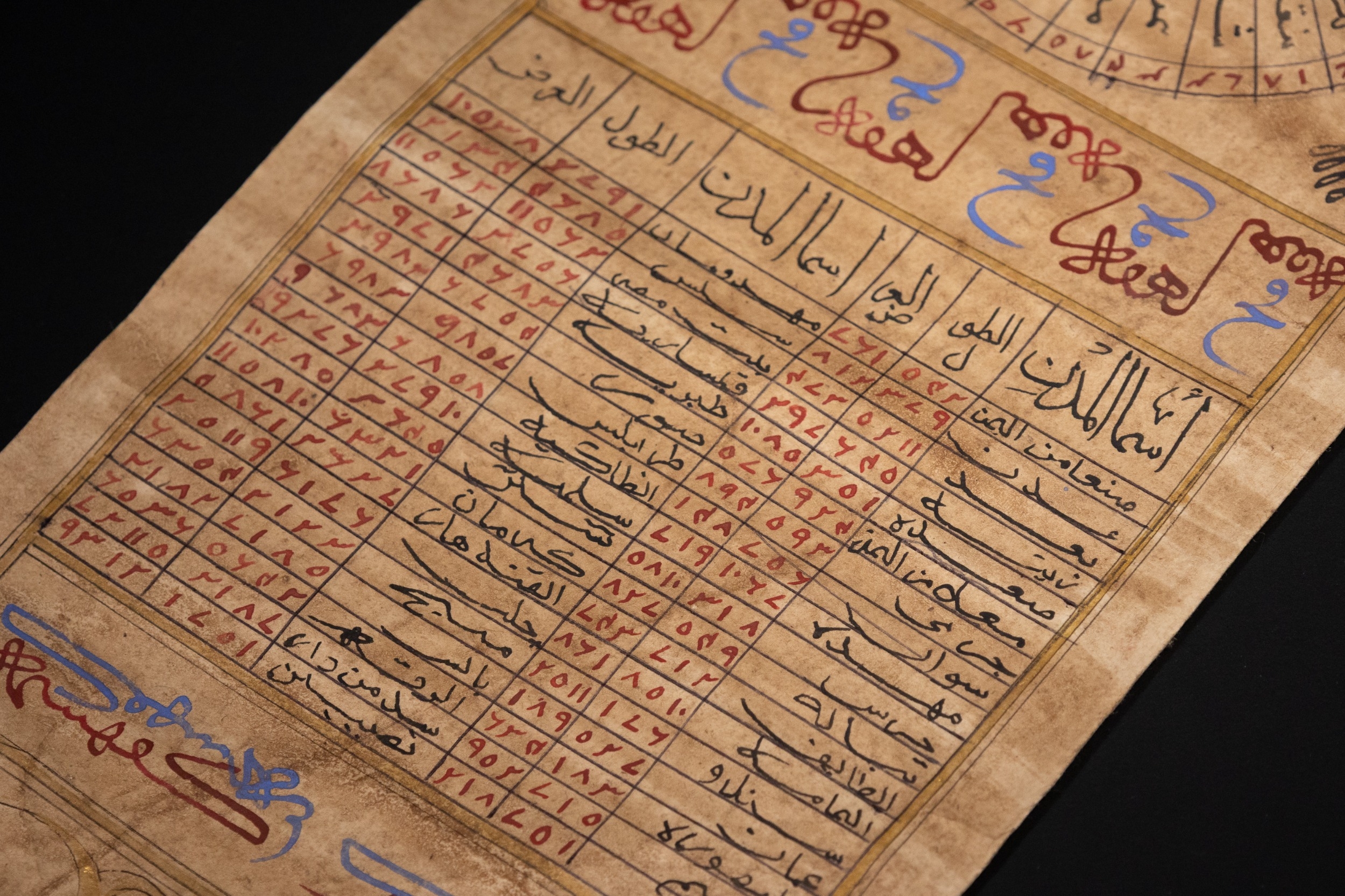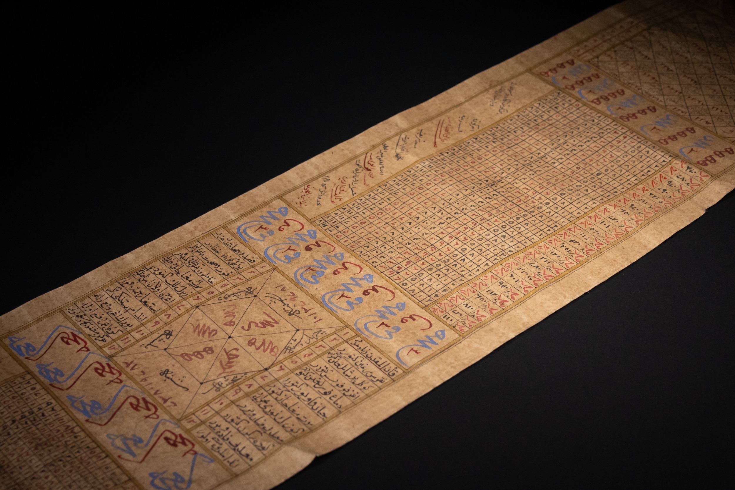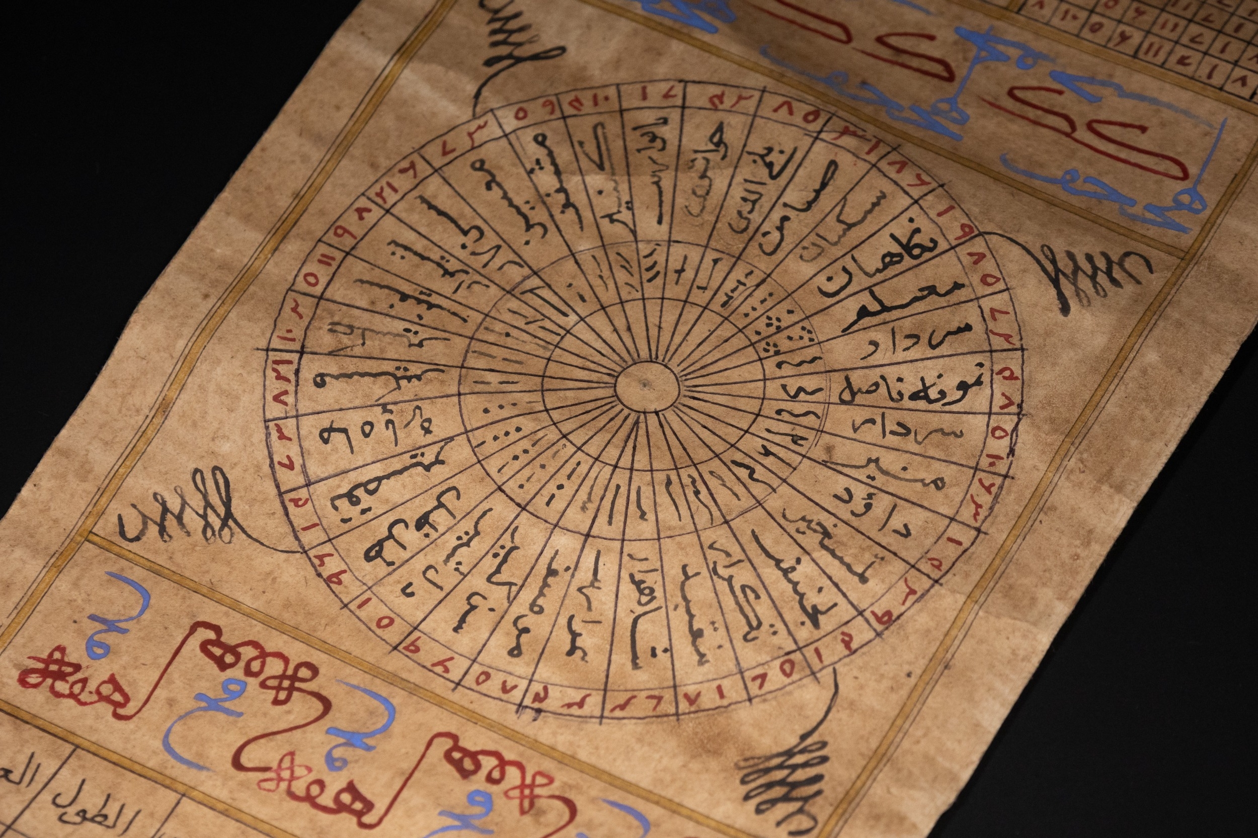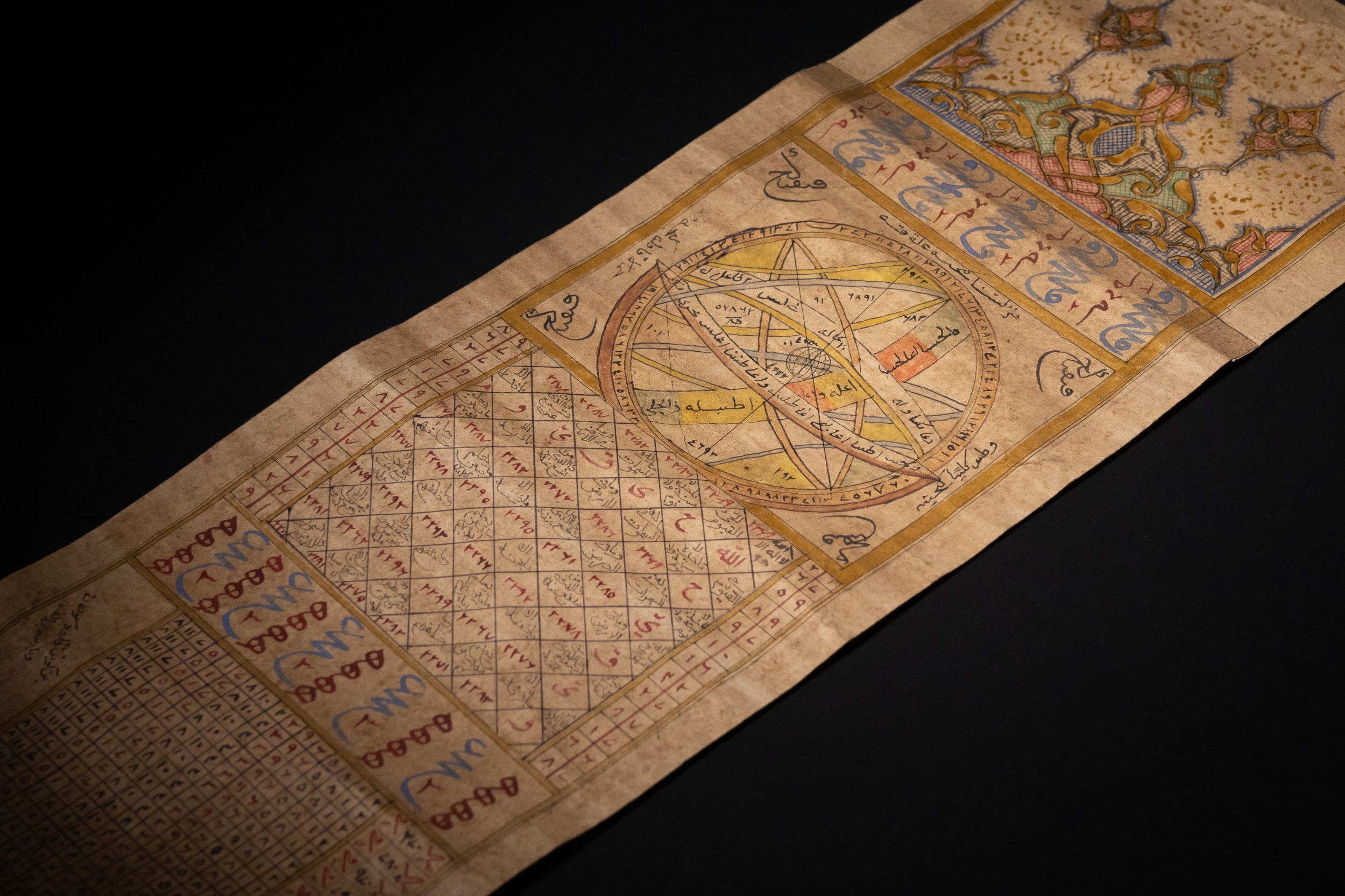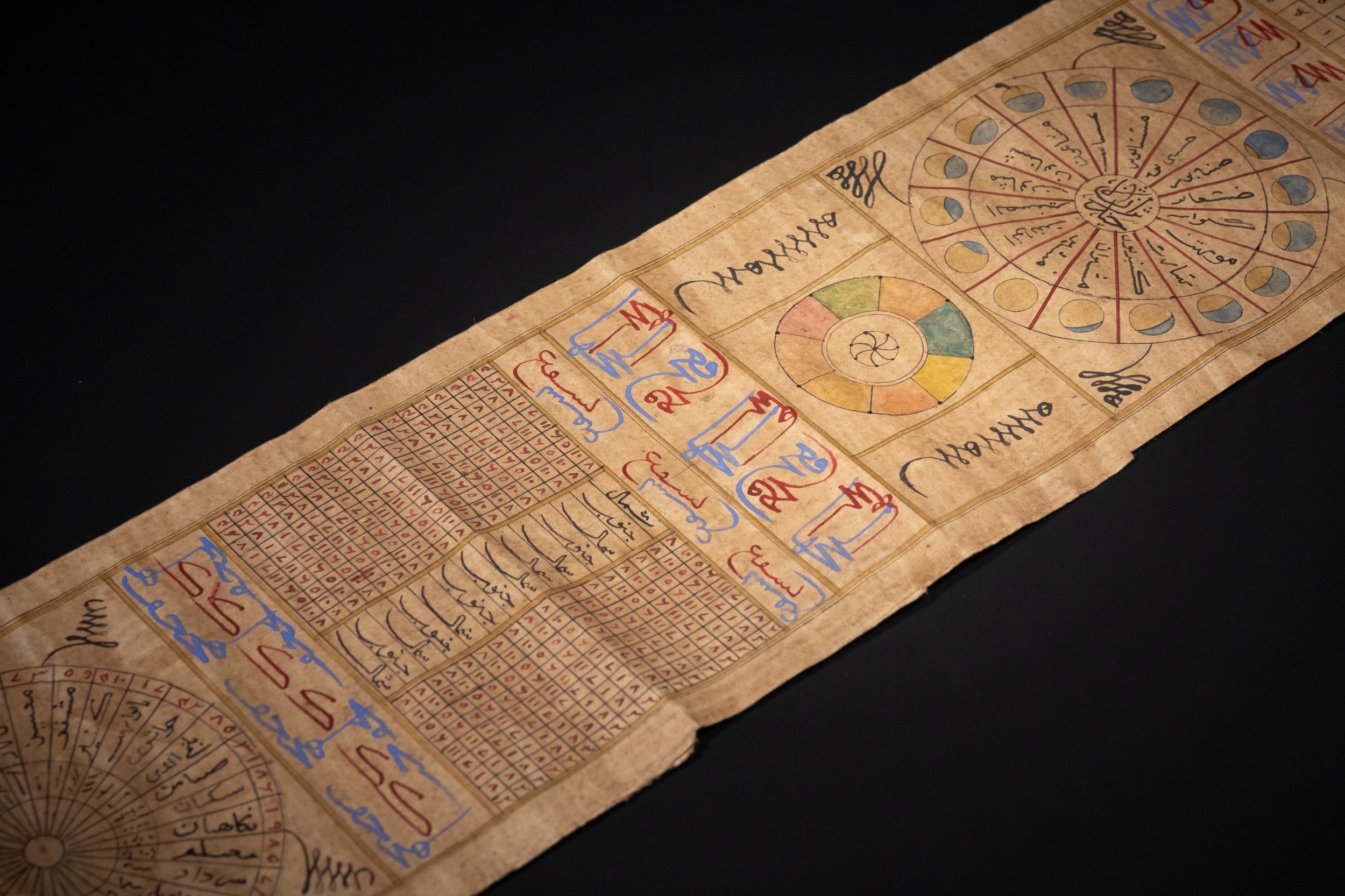 An illuminated Ruzname (almanac or calendar) scroll, copied by Sulayman known as Hikmati, originating from Ottoman Turkey and dating to the late 18th/early 19th Century. This hand-illustrated manuscript is executed on aged paper, featuring extensive Arabic calligraphy in black, red, and blue inks. The scroll incorporates numerous numerical tables and complex diagrams, including a celestial sphere with astrological or astronomical markings, a sequence depicting moon phases, and various radial charts. A notable section is clearly labeled '????? ?????' (Asma' al-Mudun - Names of Cities) with associated '?????' (Al-T?l - Longitude) and '?????' (Al-?Ar? - Latitude) values, indicating geographical or cartographic content. Decorative motifs, including arabesque patterns and stylized calligraphic elements, are present throughout the composition.