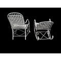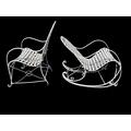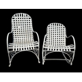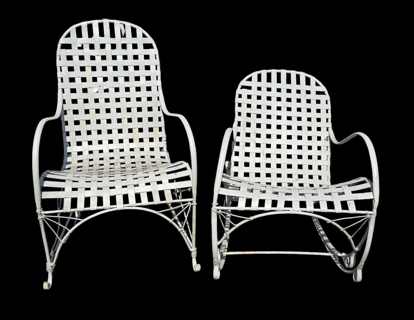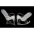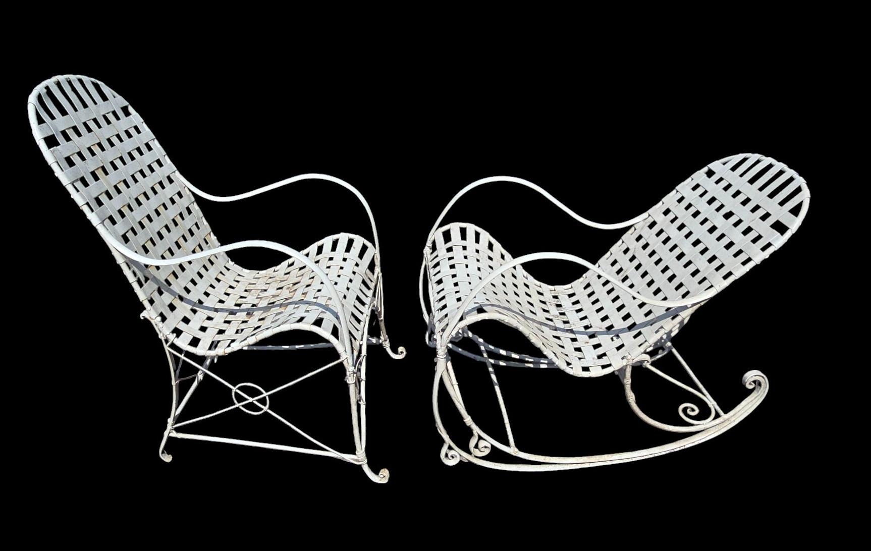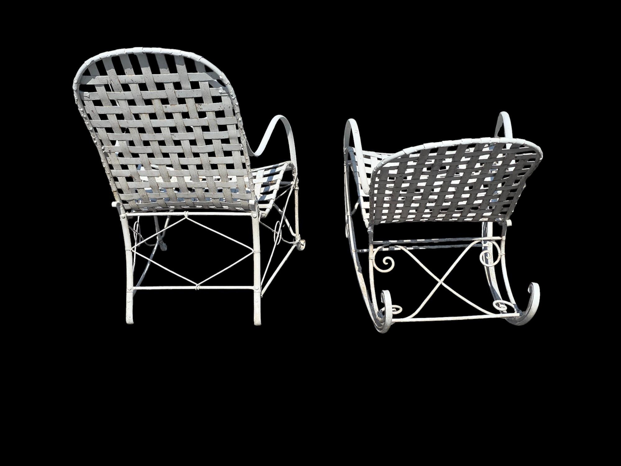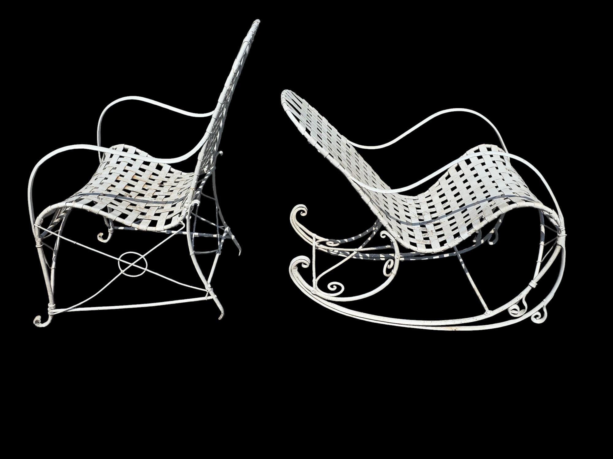 A distressed painted metal garden rocking chair with woven slat seat; together with a similar elbow chair (2). Provenance: property of the late actor Michael Gough