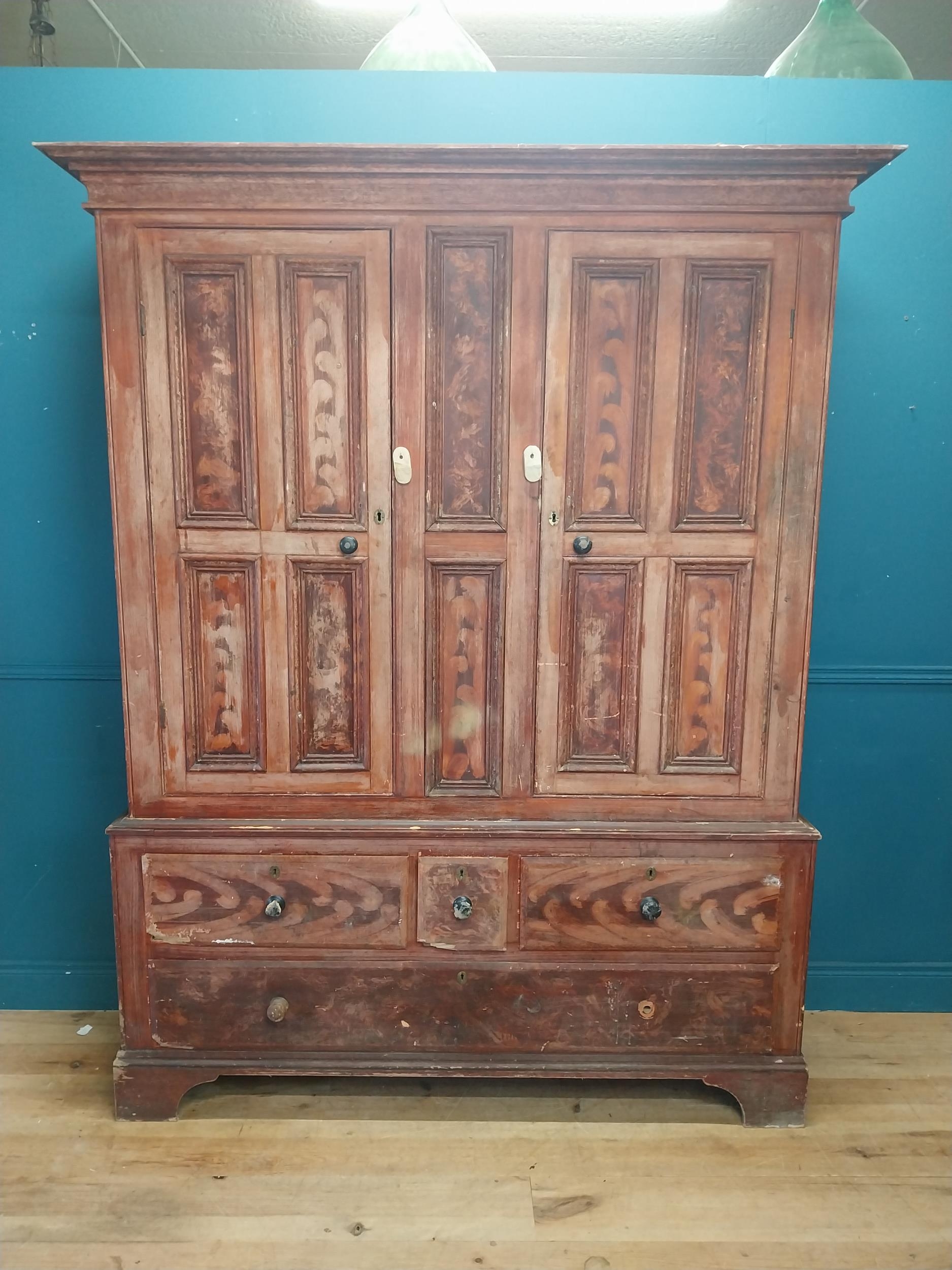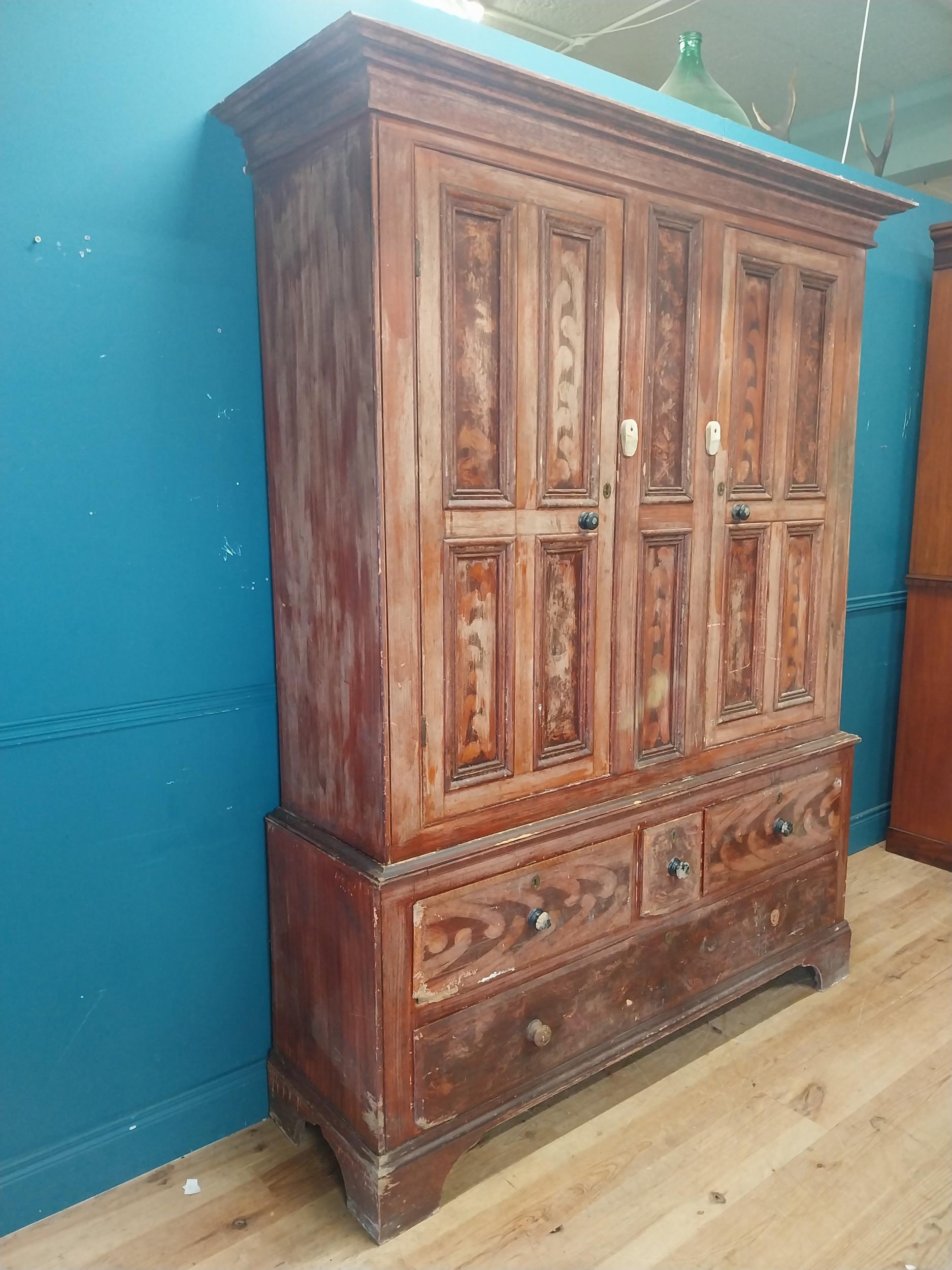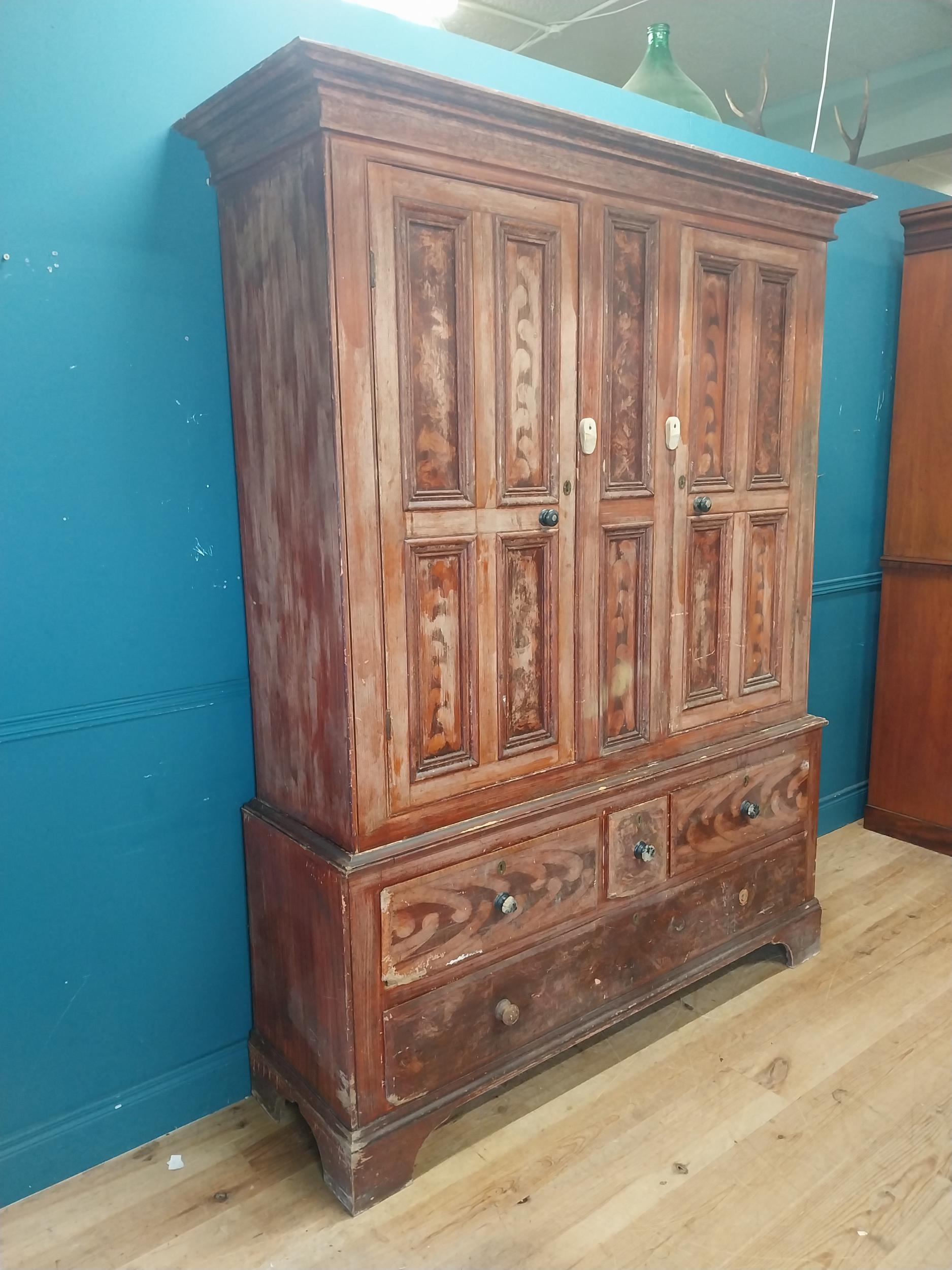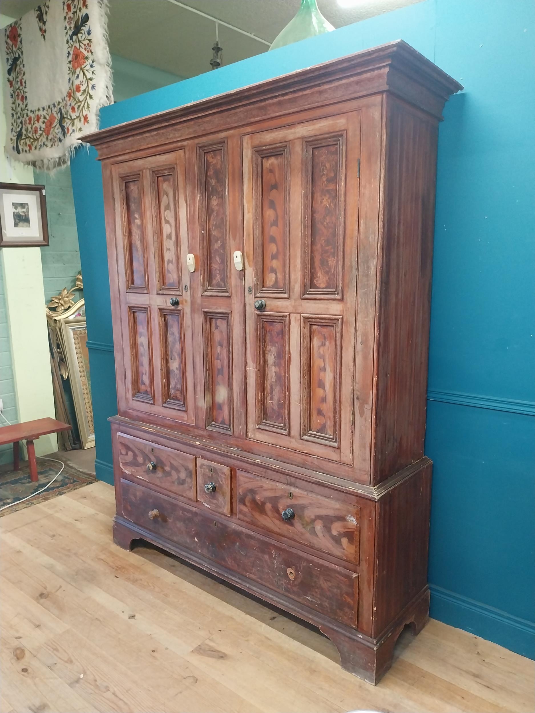 19th. C. Irish scumbled pine harness cupboard County Antrim, the two long doors each with four inverted panels enclosing a painted interior, above a small drawer flanked by two short drawers over a long drawer raised on bracket feet. { 213cm H X 160cm W X 47cm D }.
