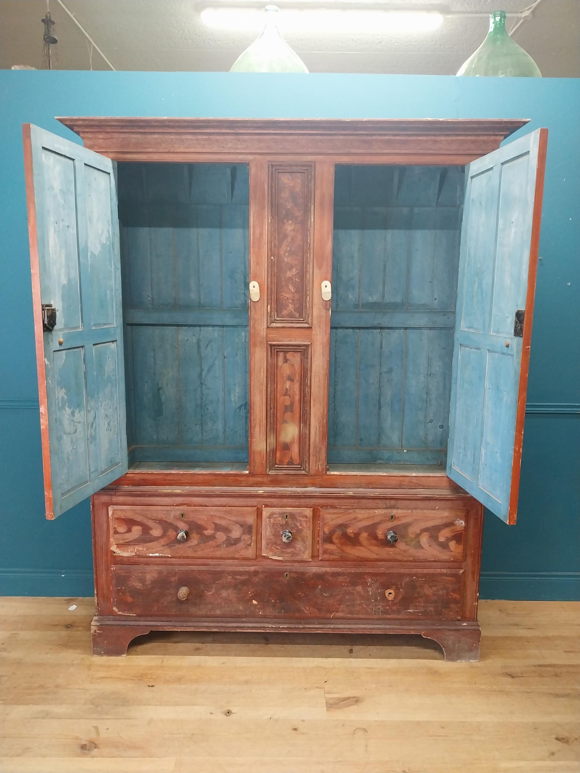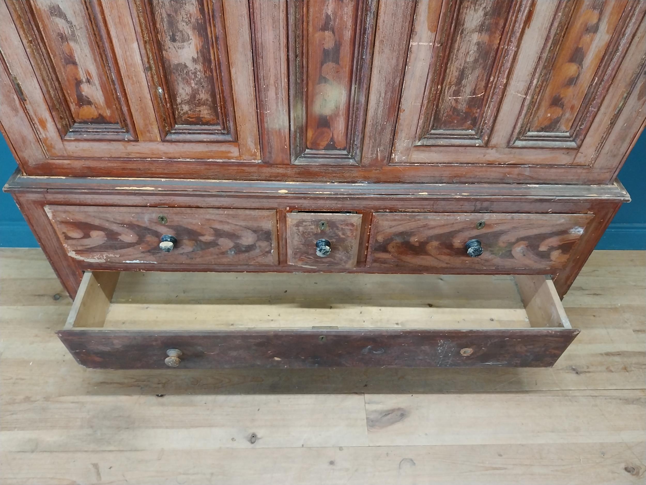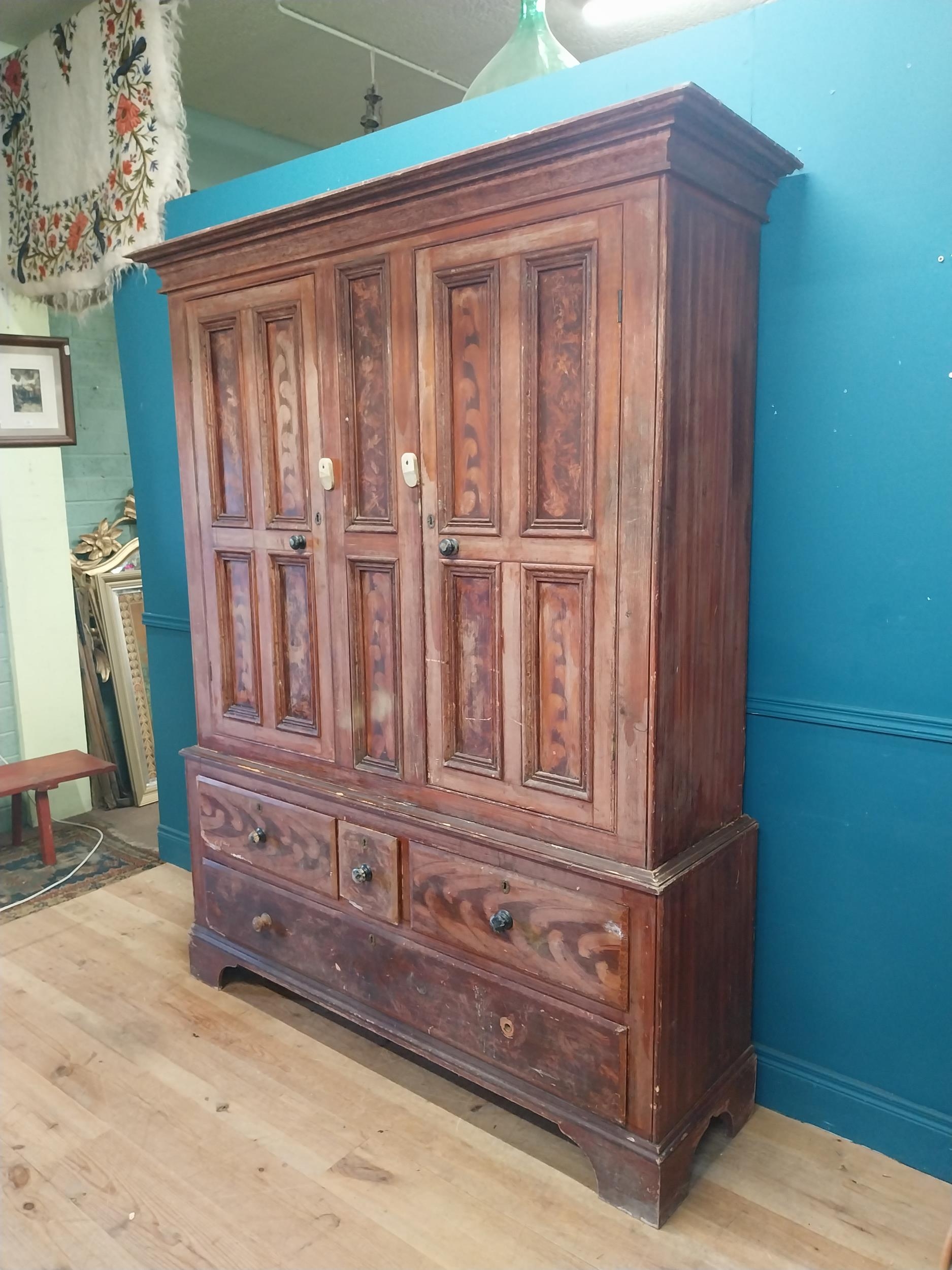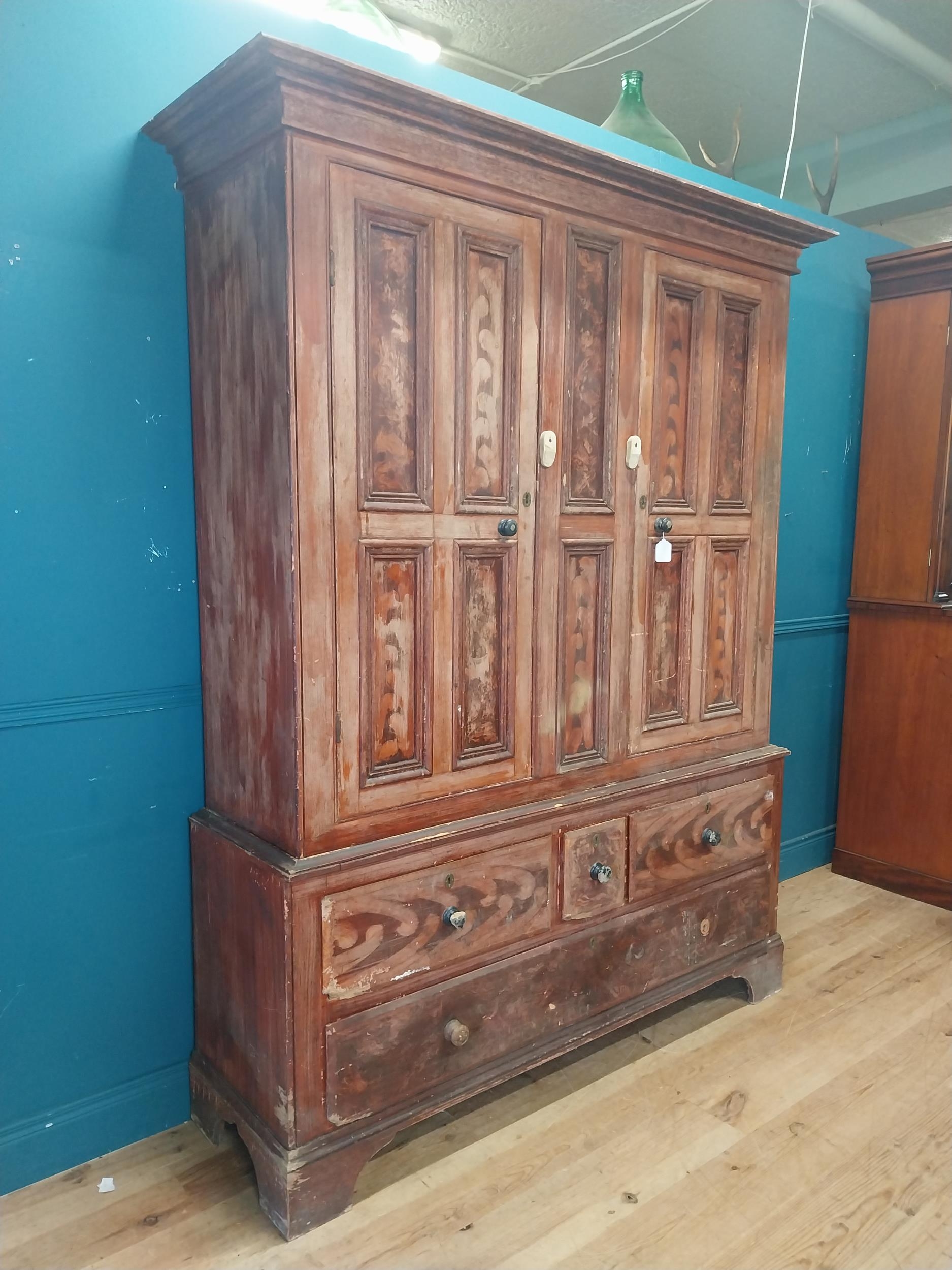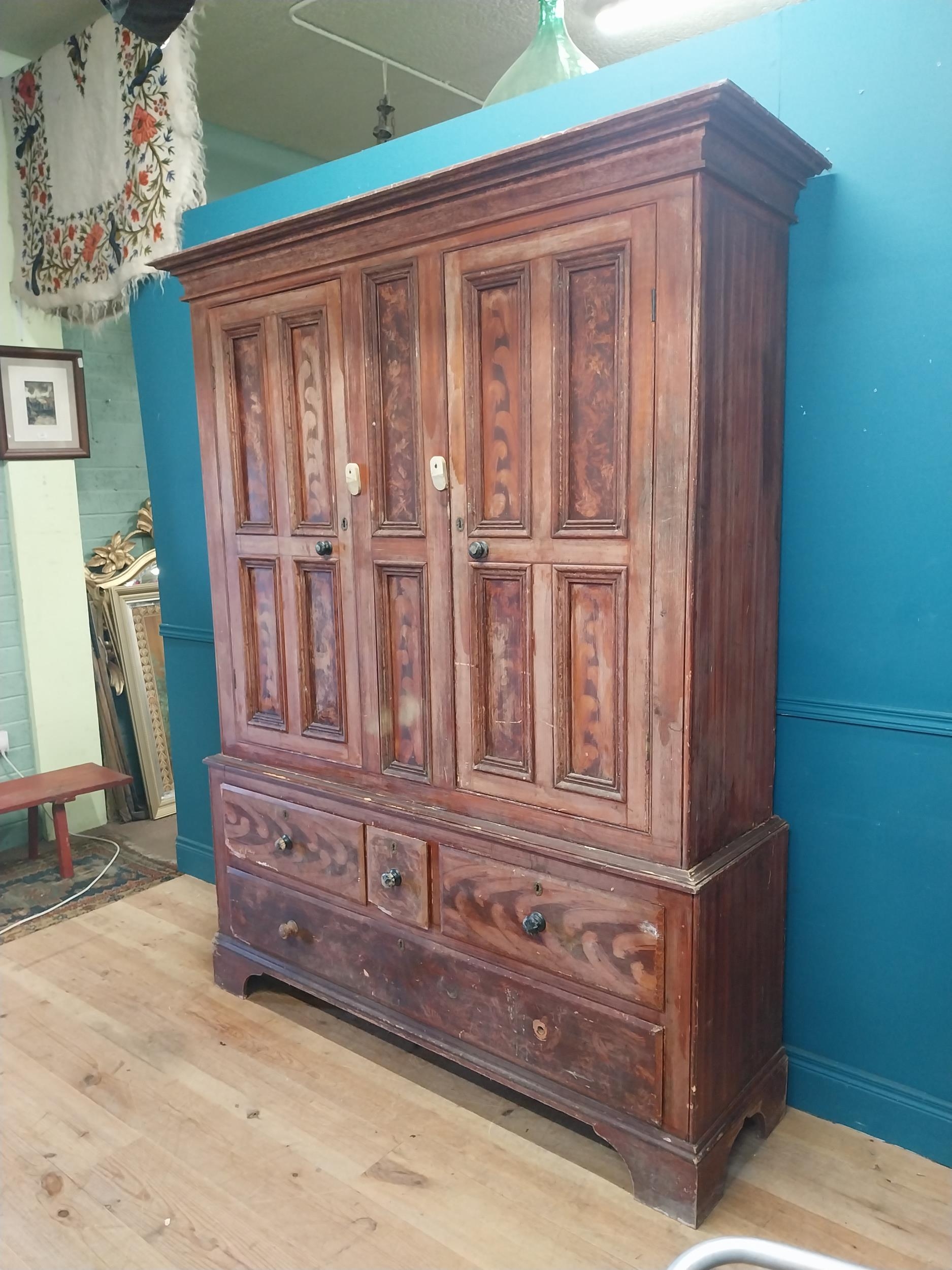19th. C. Irish scumbled pine harness cupboard County Antrim, the two long doors each with four inverted panels enclosing a painted interior, above a small drawer flanked by two short drawers over a long drawer raised on bracket feet. { 213cm H X 160cm W X 47cm D }.