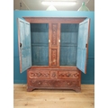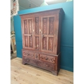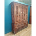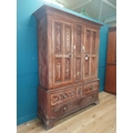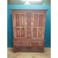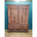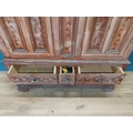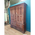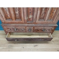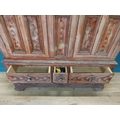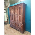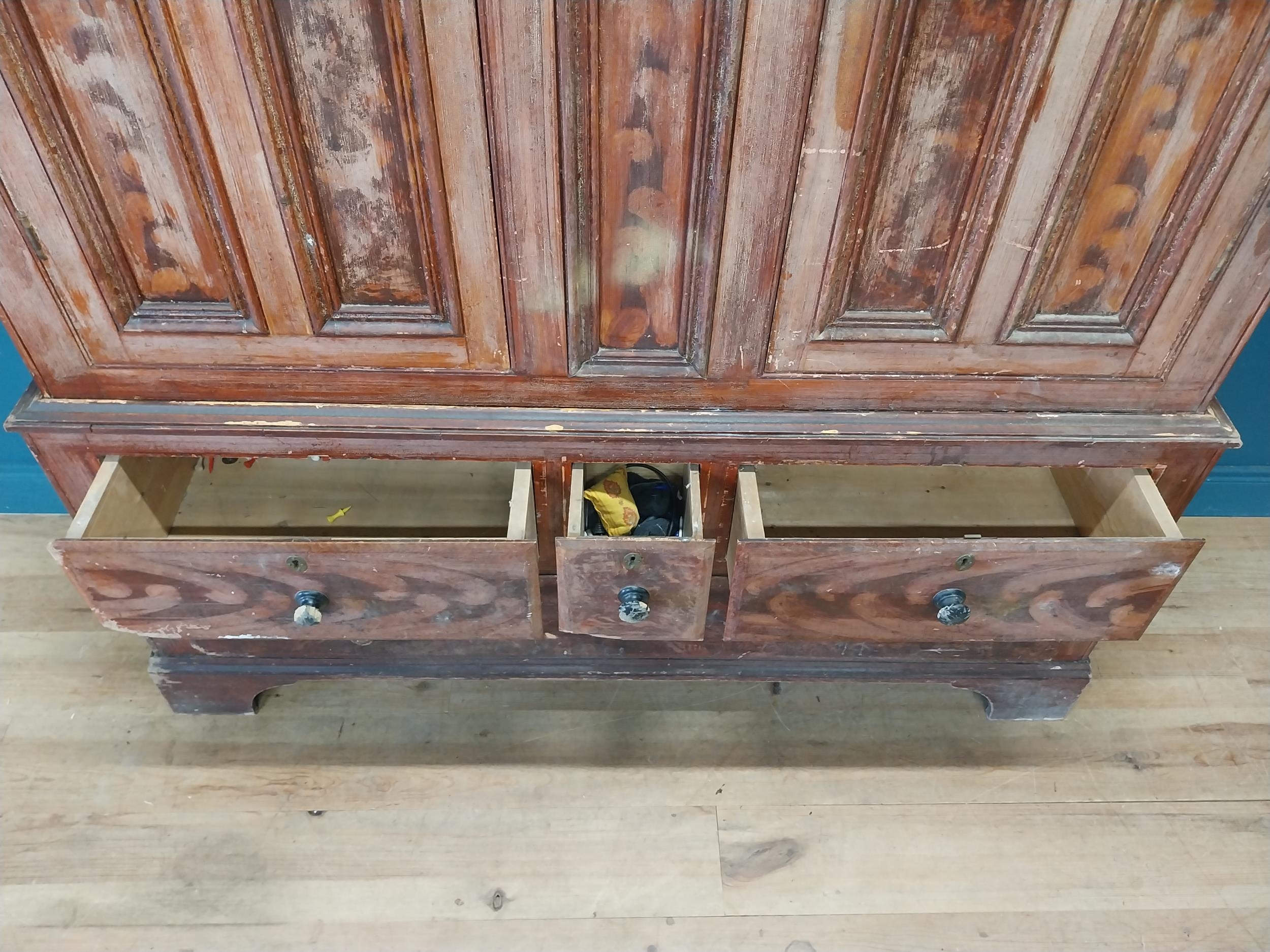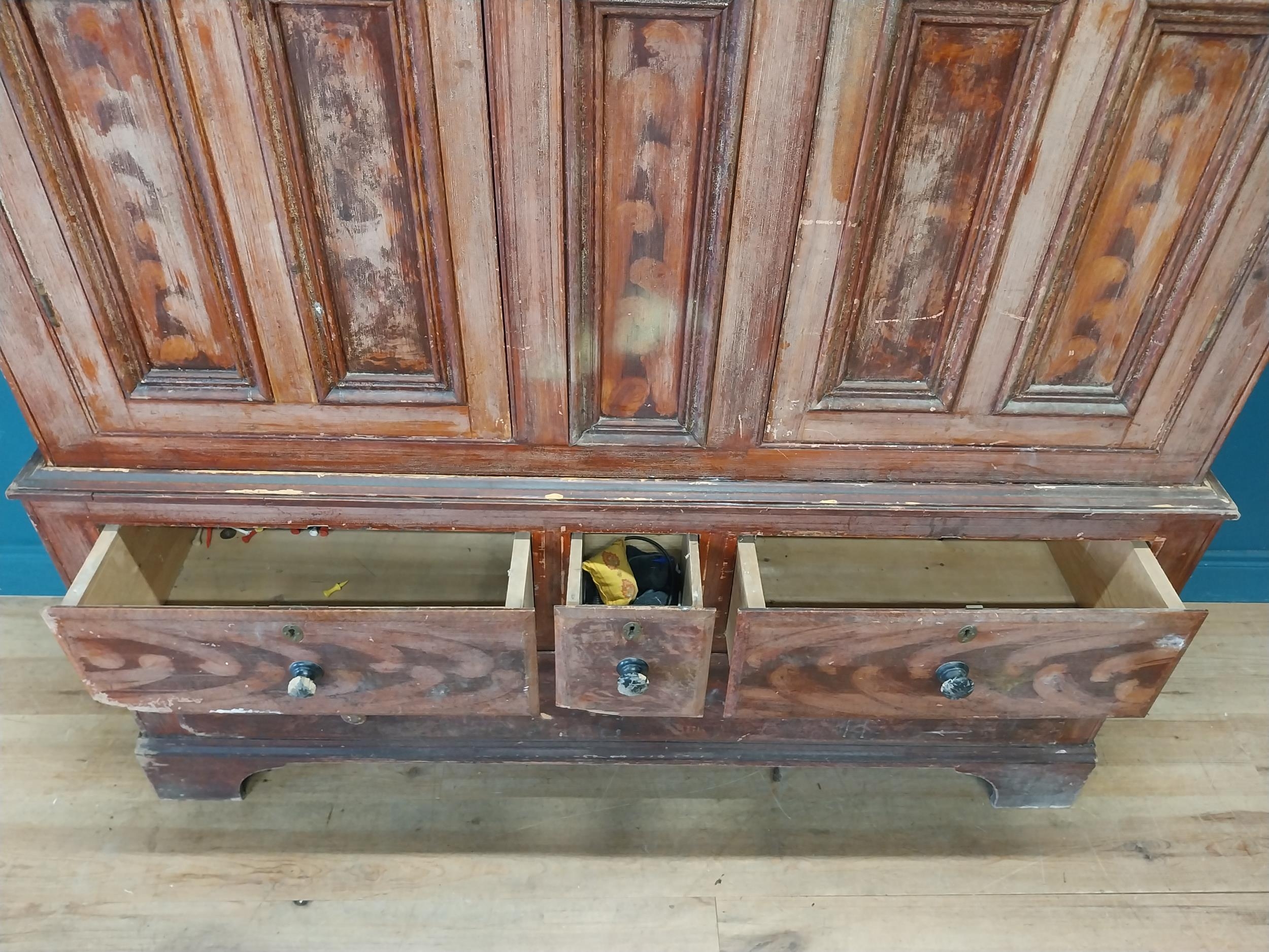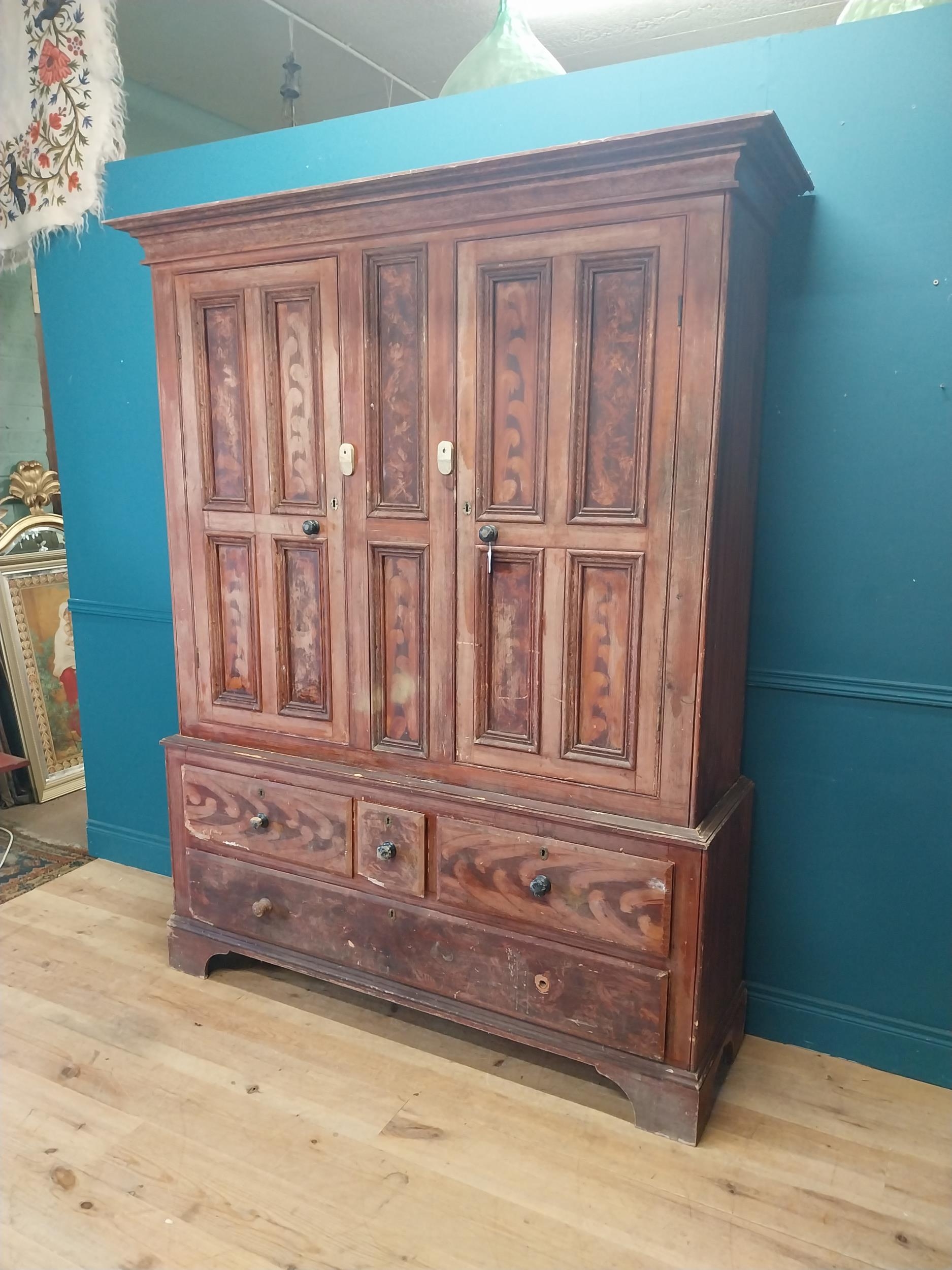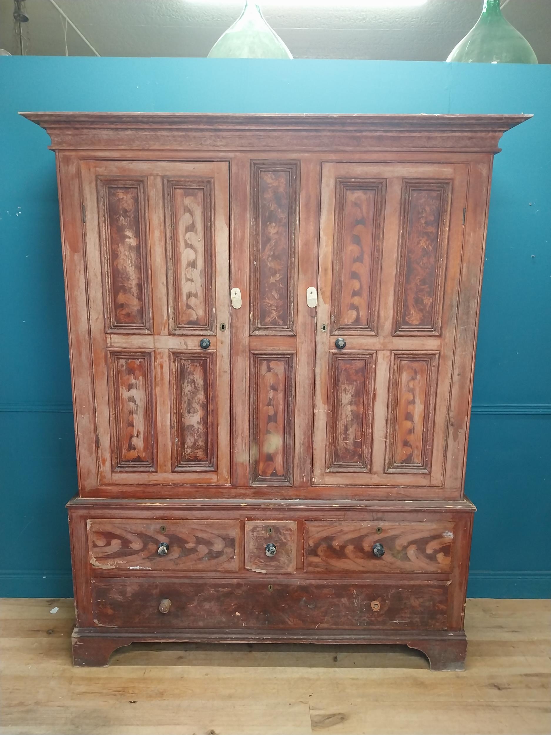 19th. C. Irish scumbled pine harness cupboard County Antrim, the two long doors each with four inverted panels enclosing a painted interior, above a small drawer flanked by two short drawers over a long drawer raised on bracket feet. { 213cm H X 160cm W X 47cm D }.
