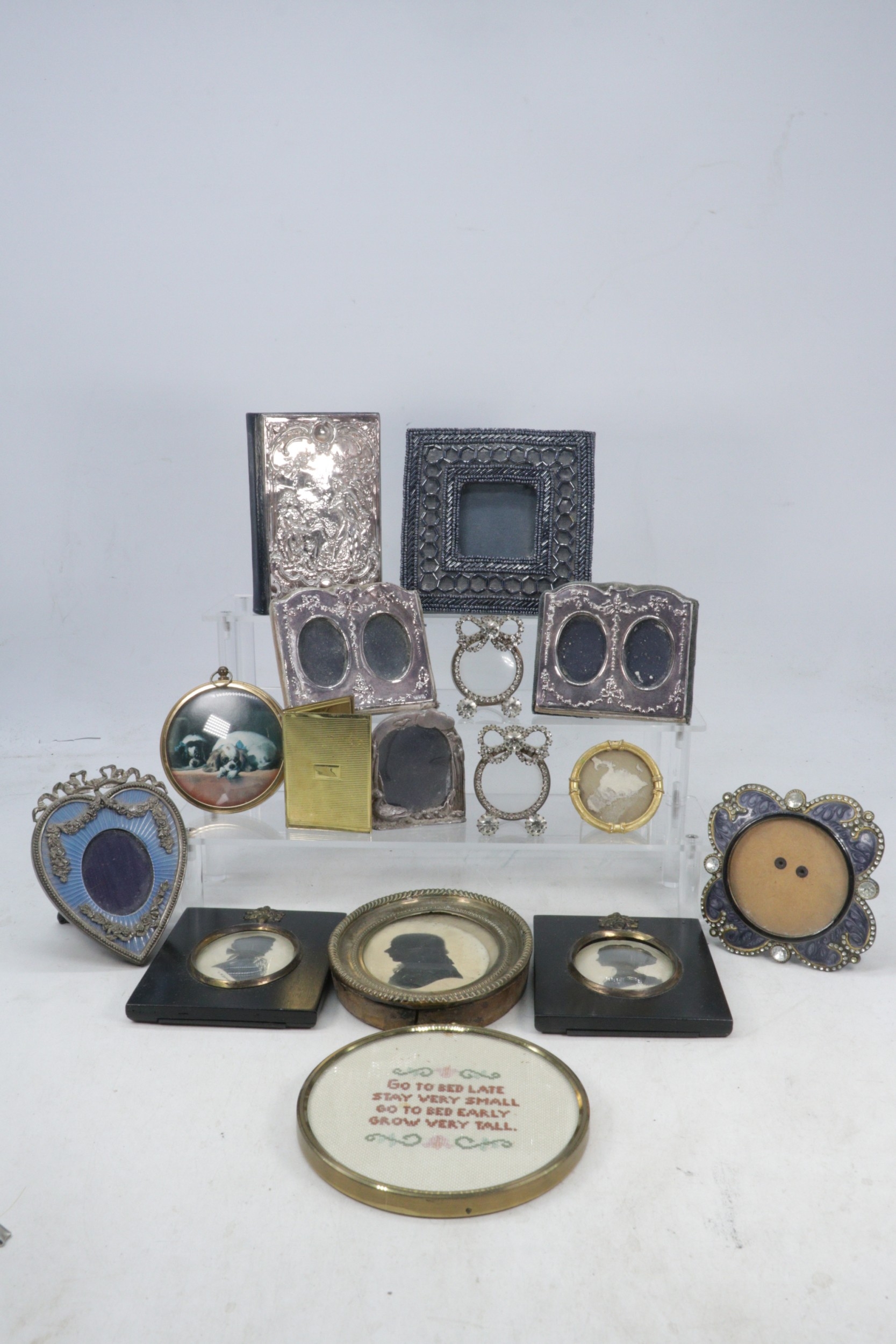 Silver fronted address book, small silver fronted jewel frame x2, some silhouettes