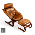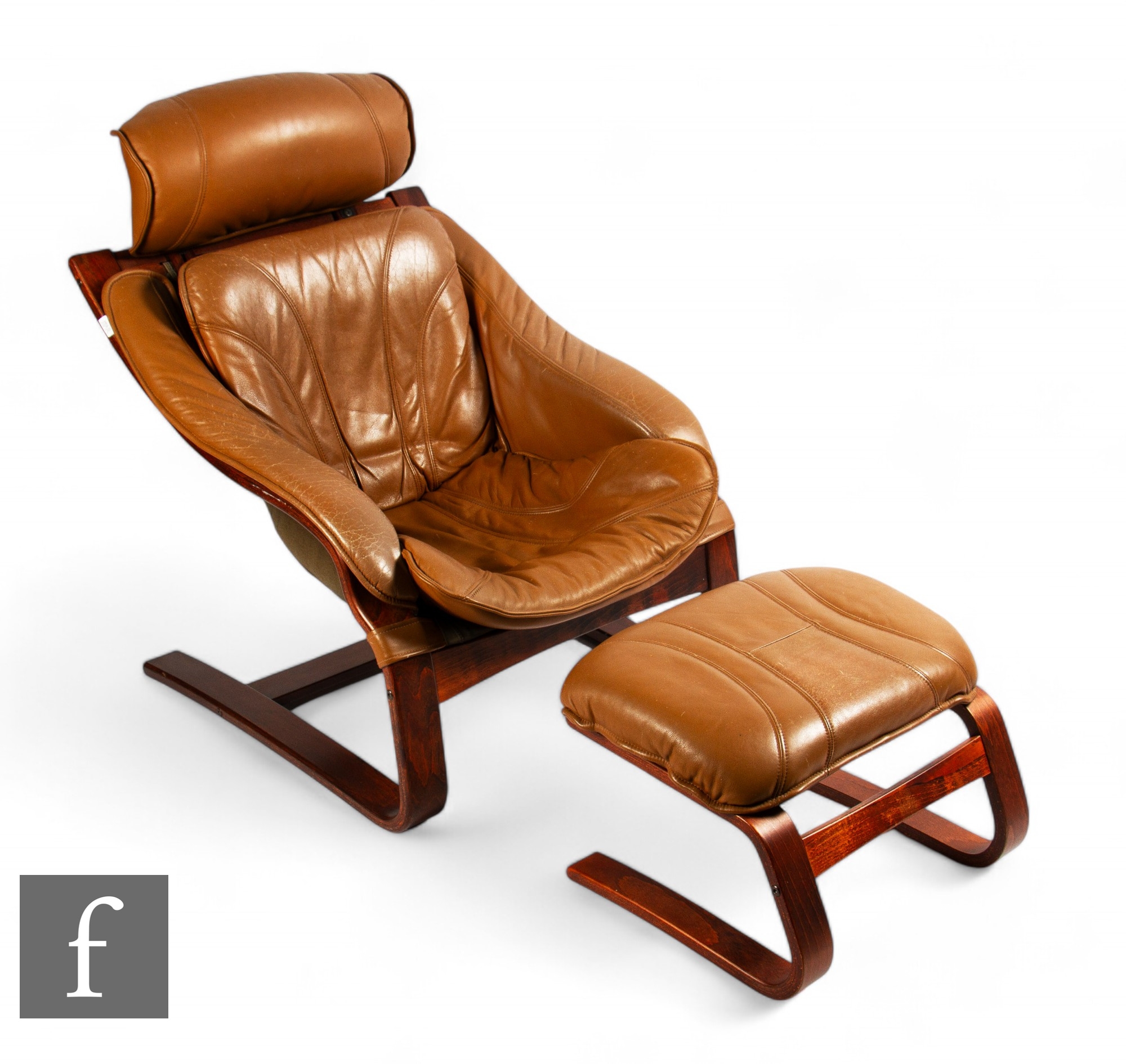 Star Furniture - A 1970s Danish tan leather cantilever armchair and footstool, the stained teak frame with padded soft leather seat, chair height 94cm.