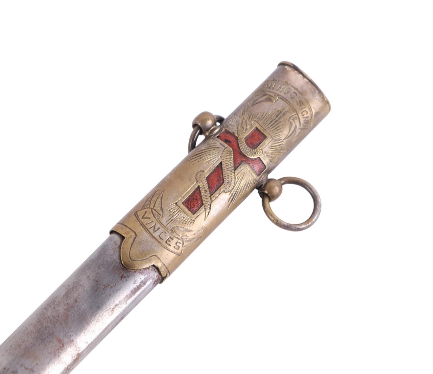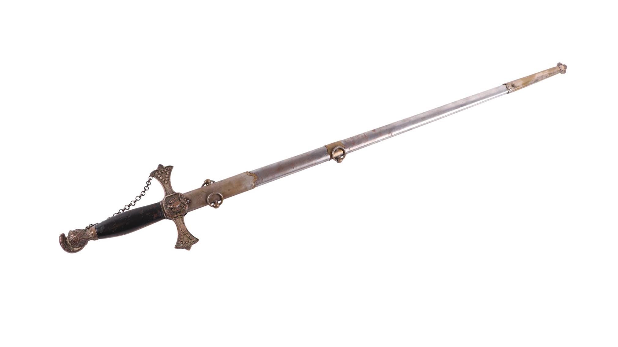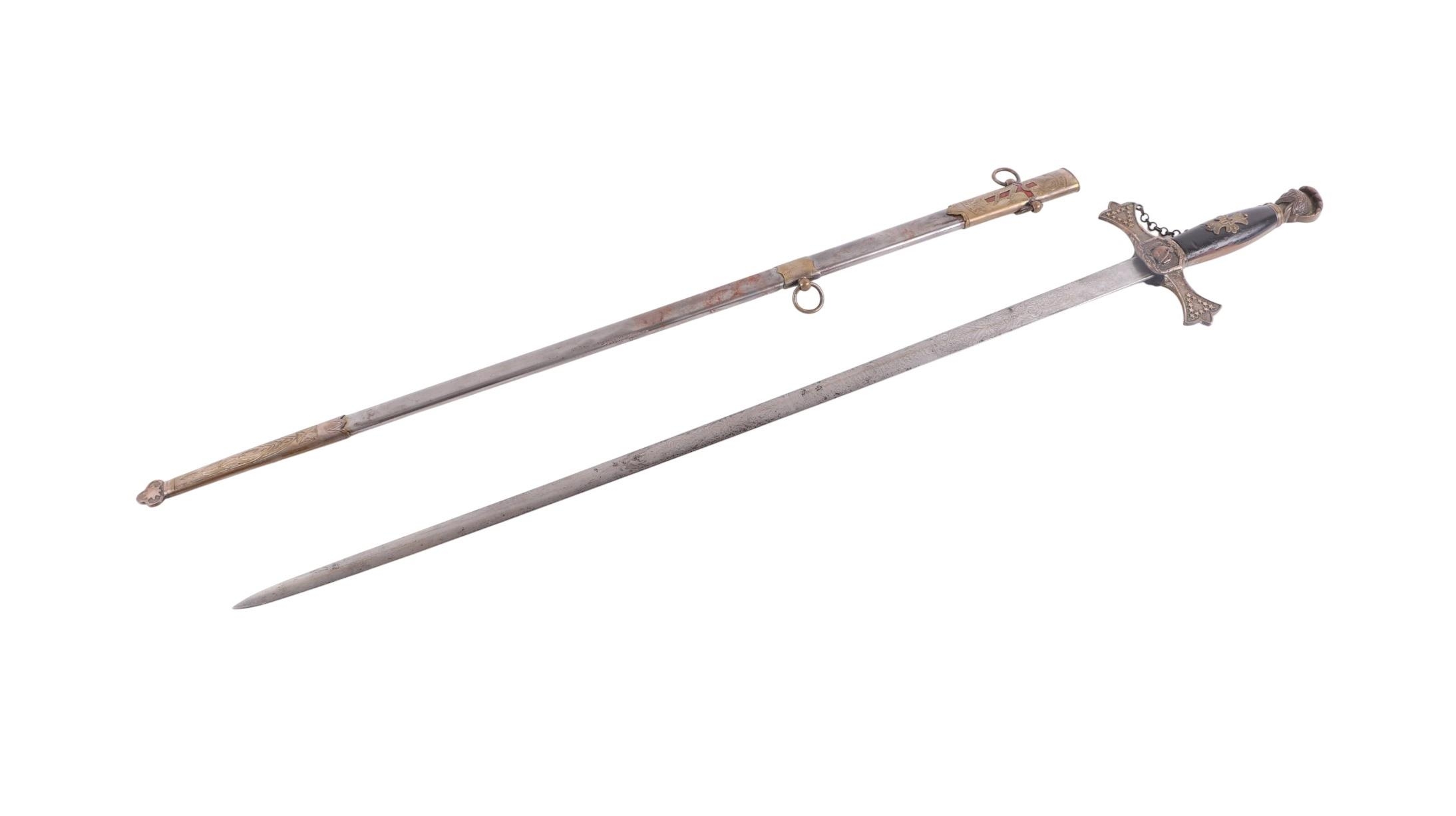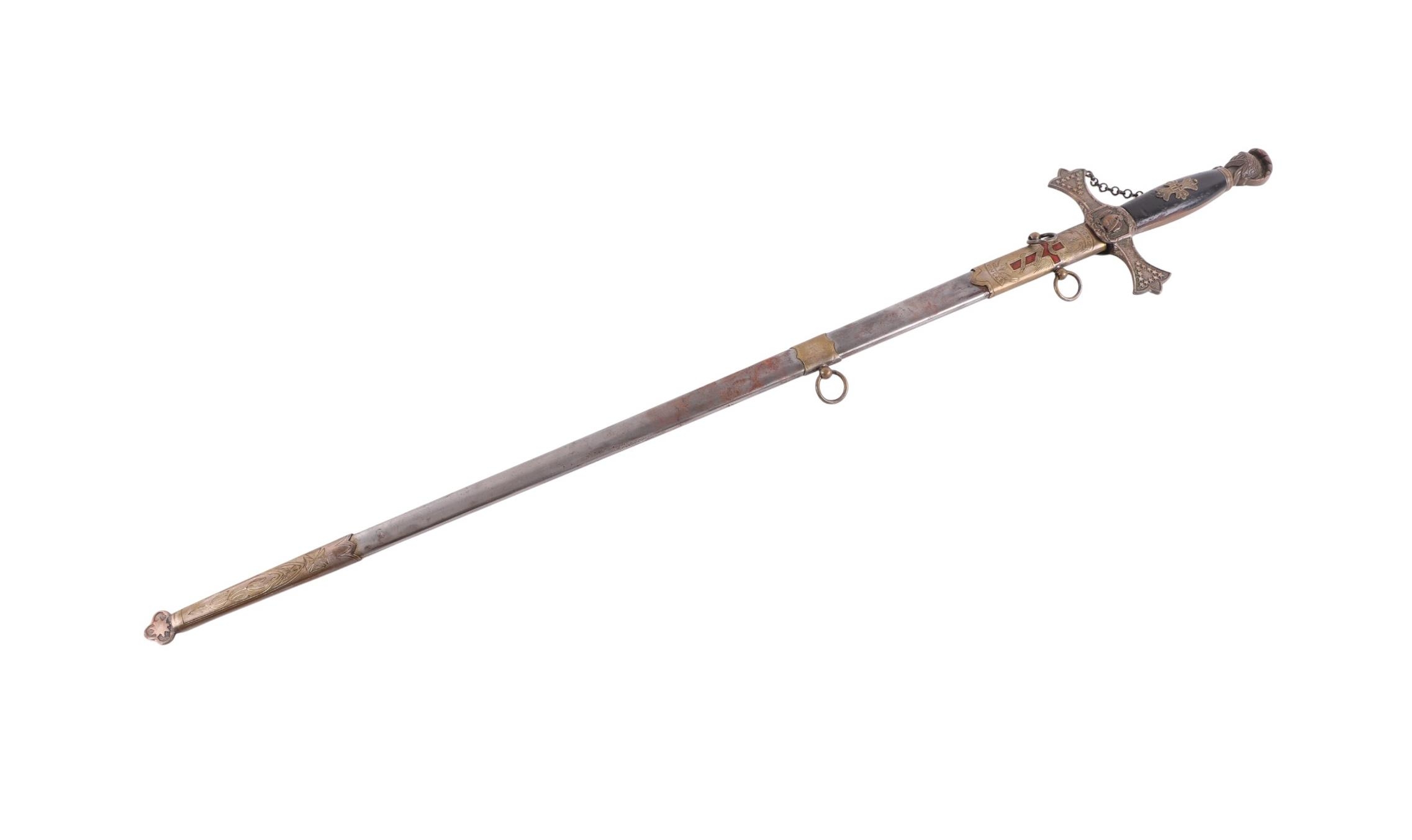 A 19th century American Masonic Knights Templar ceremonial fraternity sword by Ames in its metal scabbard. Having a knights helmet pommel, a wooden handle and metal crosspiece connected by a chain. The scabbard having a red enamel cross with IN HOC SIGNO & VINCES. The double edged blade etched with the owners name Christian Hansen. and adorned with Masonic symbols including WASHINGTON COMMANDERY No.4 K.T.and the makers name: Ames Sword Co. Chicopee, Mass.. Blade length 71cms.