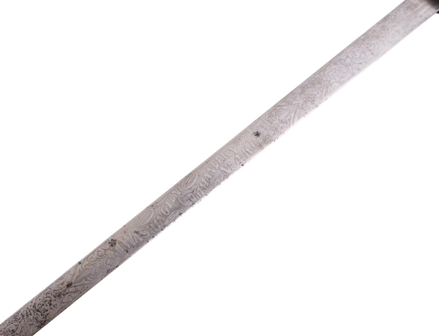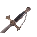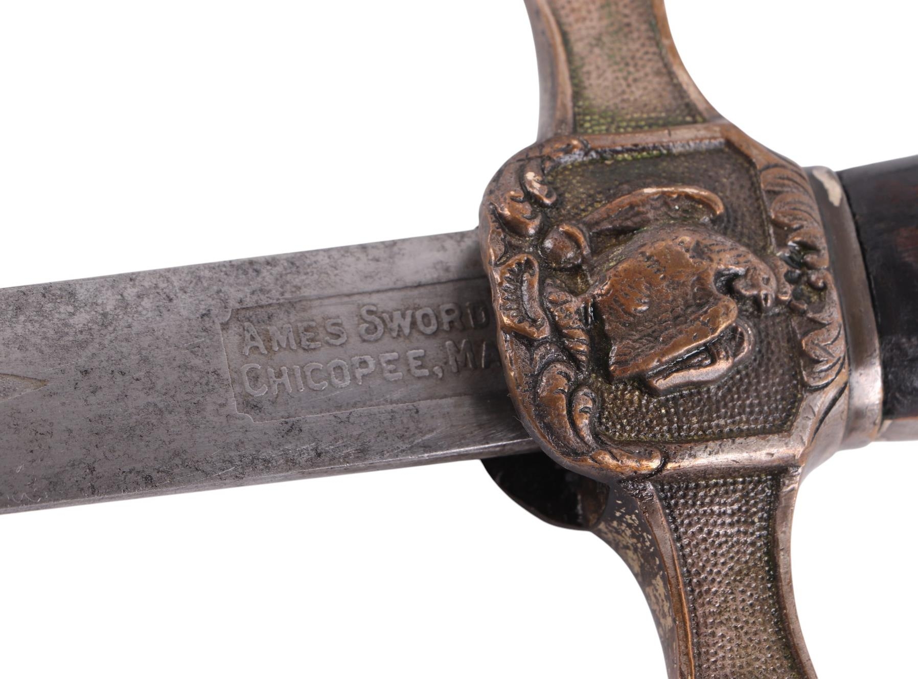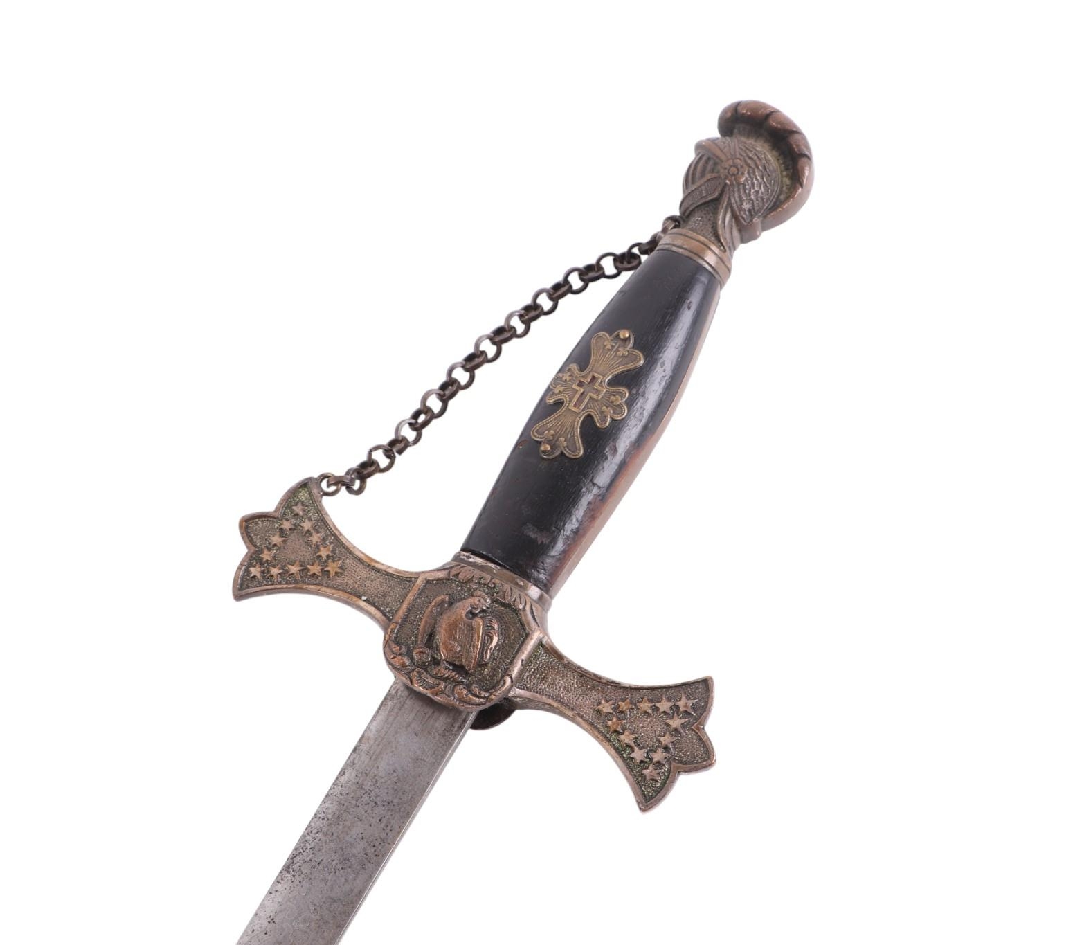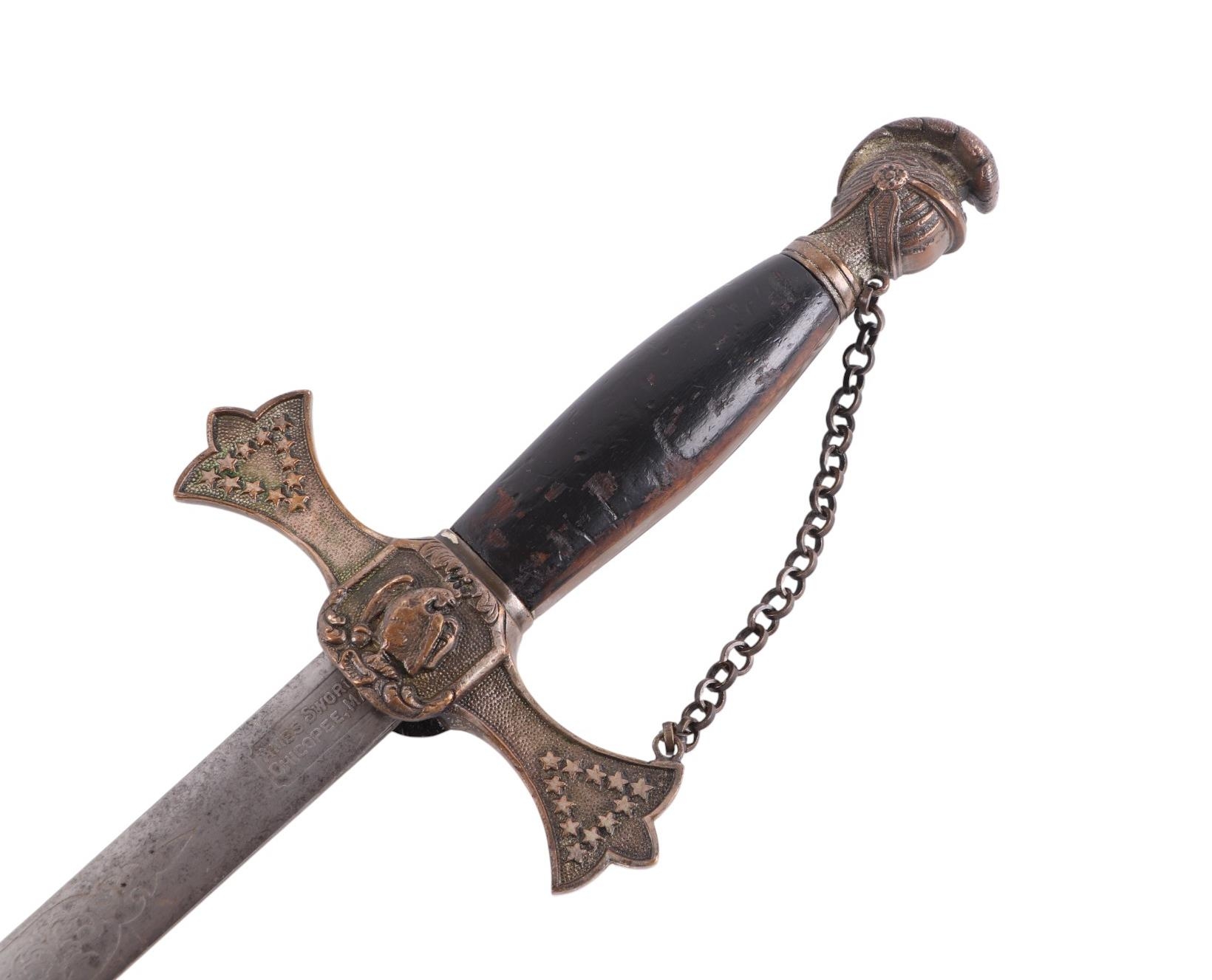 A 19th century American Masonic Knights Templar ceremonial fraternity sword by Ames in its metal scabbard. Having a knights helmet pommel, a wooden handle and metal crosspiece connected by a chain. The scabbard having a red enamel cross with IN HOC SIGNO & VINCES. The double edged blade etched with the owners name Christian Hansen. and adorned with Masonic symbols including WASHINGTON COMMANDERY No.4 K.T.and the makers name: Ames Sword Co. Chicopee, Mass.. Blade length 71cms.