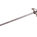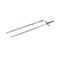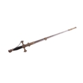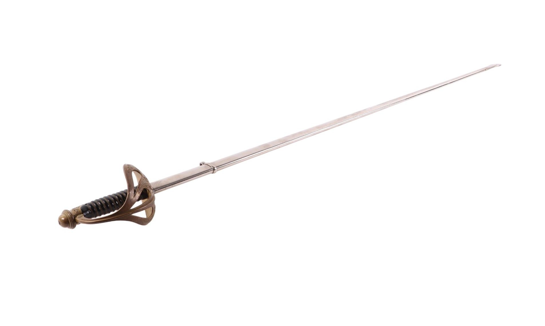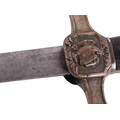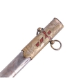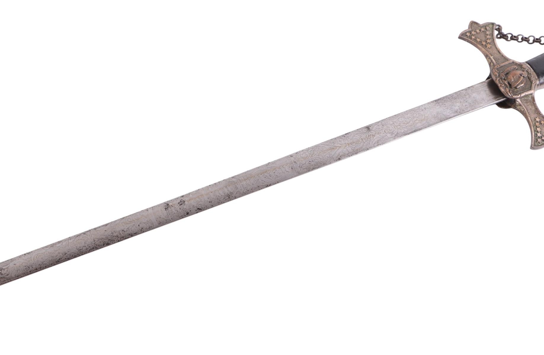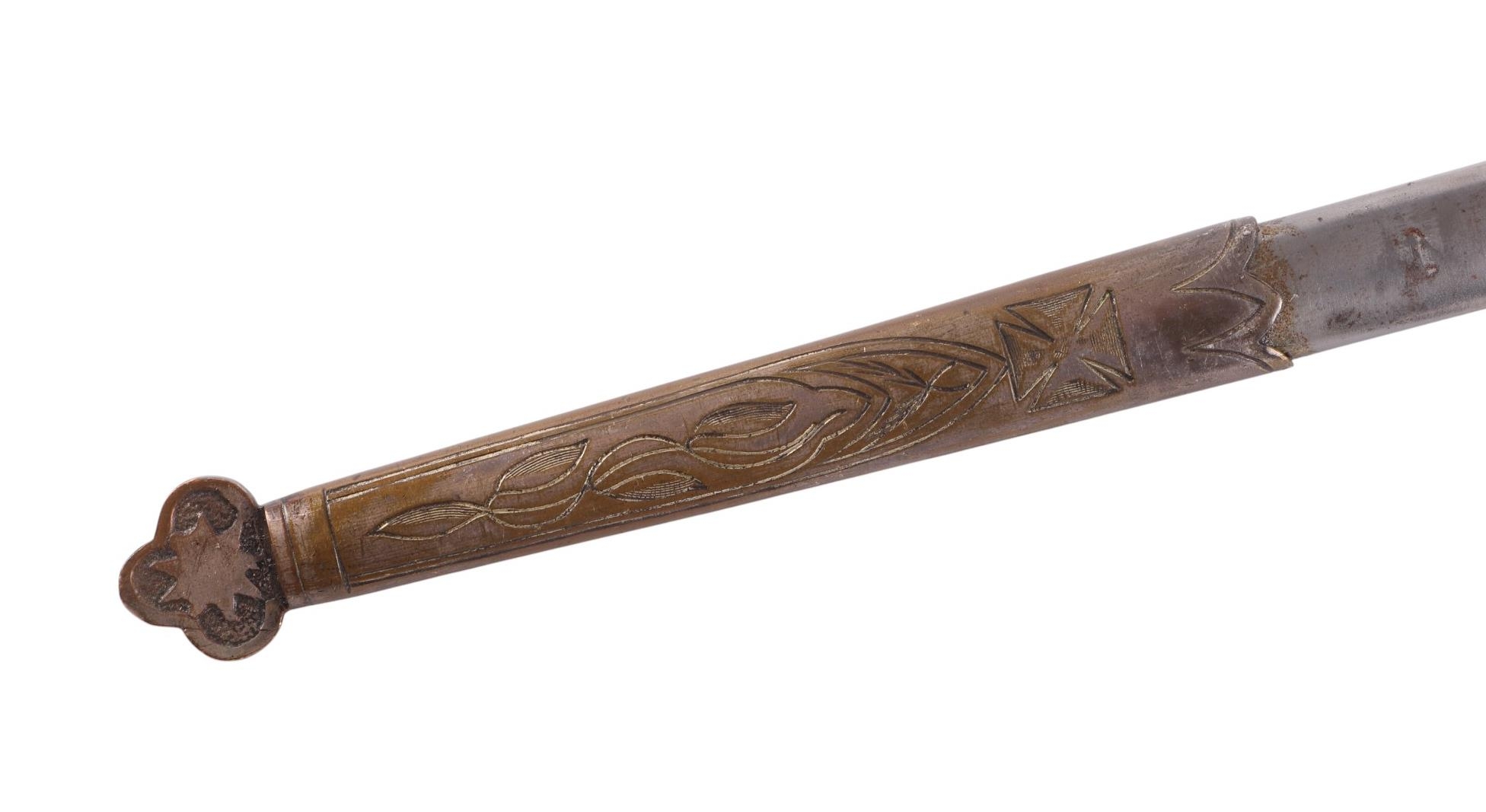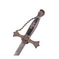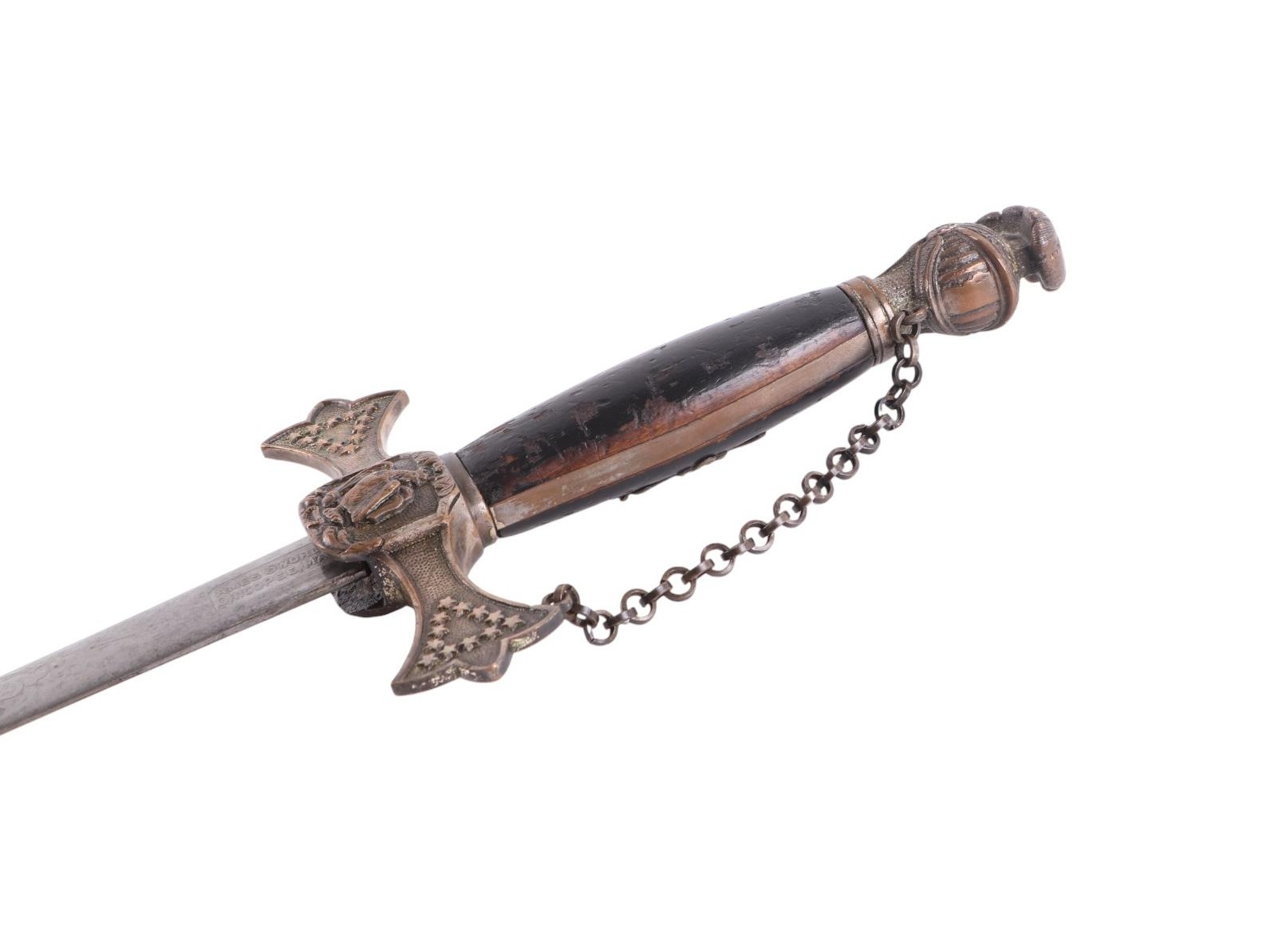 A 19th century American Masonic Knights Templar ceremonial fraternity sword by Ames in its metal scabbard. Having a knights helmet pommel, a wooden handle and metal crosspiece connected by a chain. The scabbard having a red enamel cross with IN HOC SIGNO & VINCES. The double edged blade etched with the owners name Christian Hansen. and adorned with Masonic symbols including WASHINGTON COMMANDERY No.4 K.T.and the makers name: Ames Sword Co. Chicopee, Mass.. Blade length 71cms.