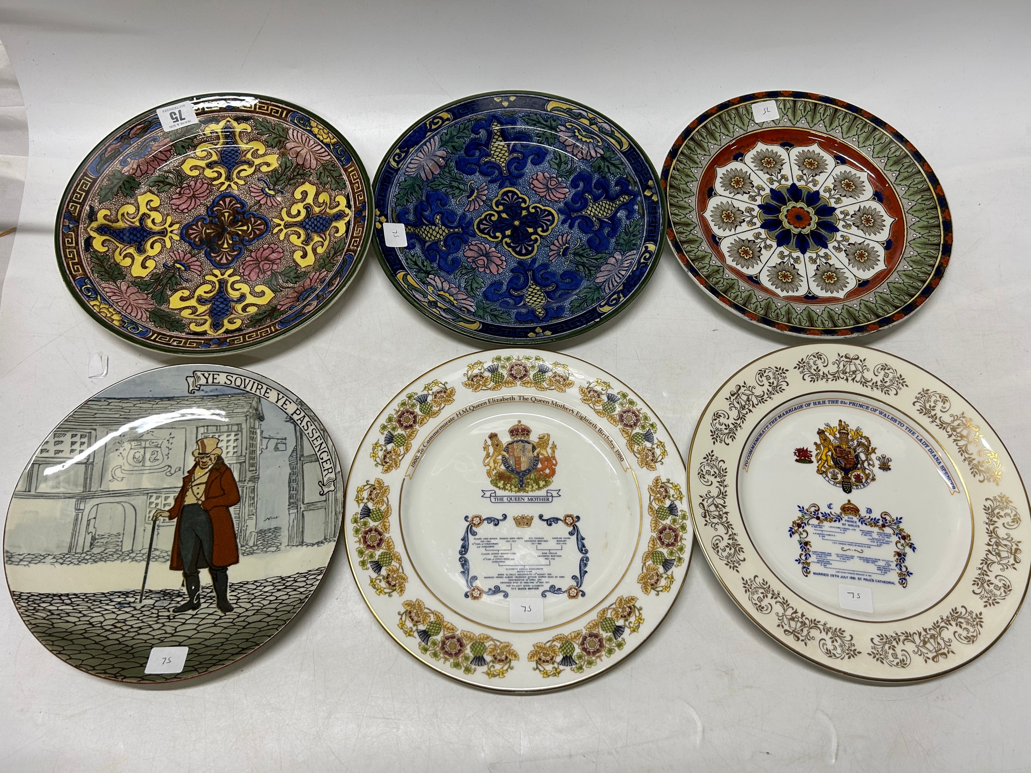 A Royal Doulton Persian pattern plate, a Royal Doulton series ware plate 'Ye Squire Ye Passenger', two other Royal Doulton plates and two commemorative plates