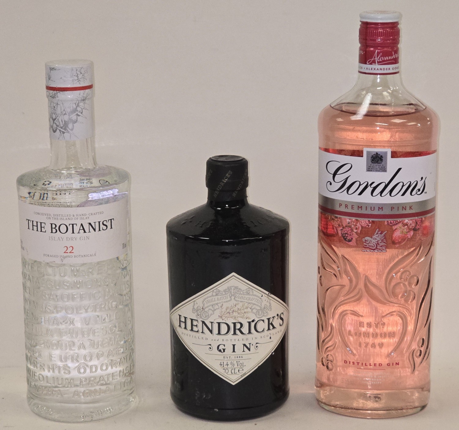 3 x bottles Gin to include Gordon's Pink Gin 1L, The Botanist Islay Dry Gin 70cl and Hendricks Gin 70cl (REF P84, P86).