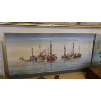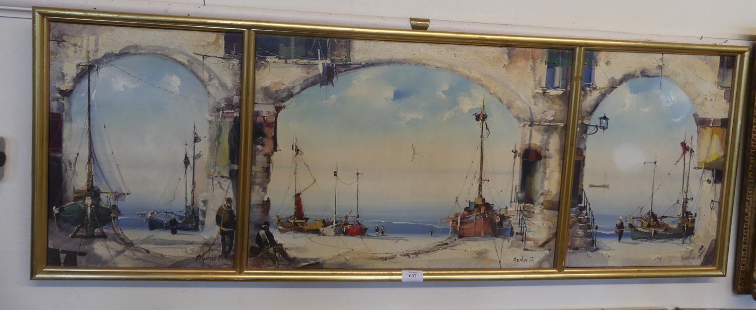 Framed Triptych Oil Painting Harbour Scene by Jorge Aguilar measuring 121 x 40cm.